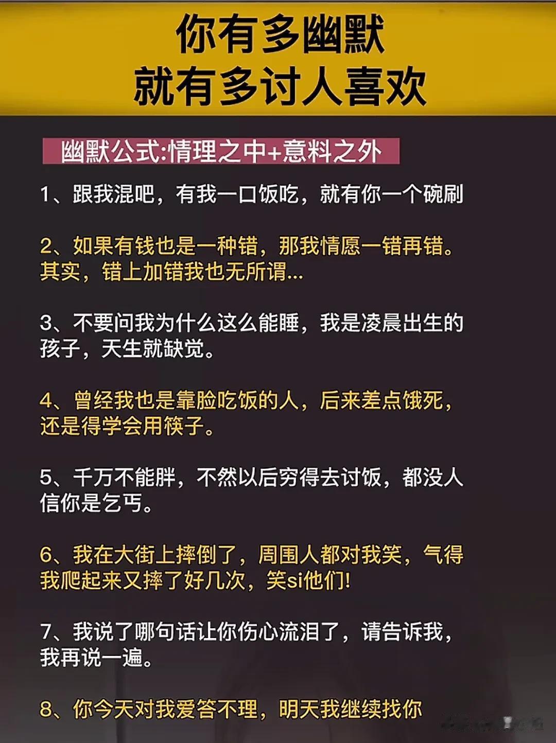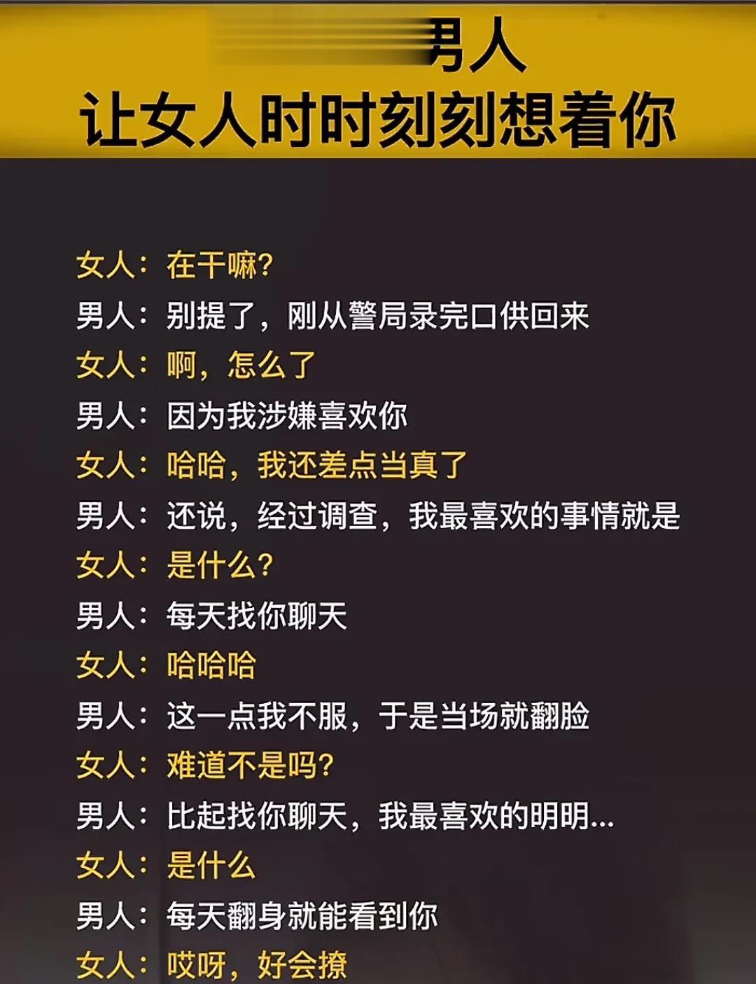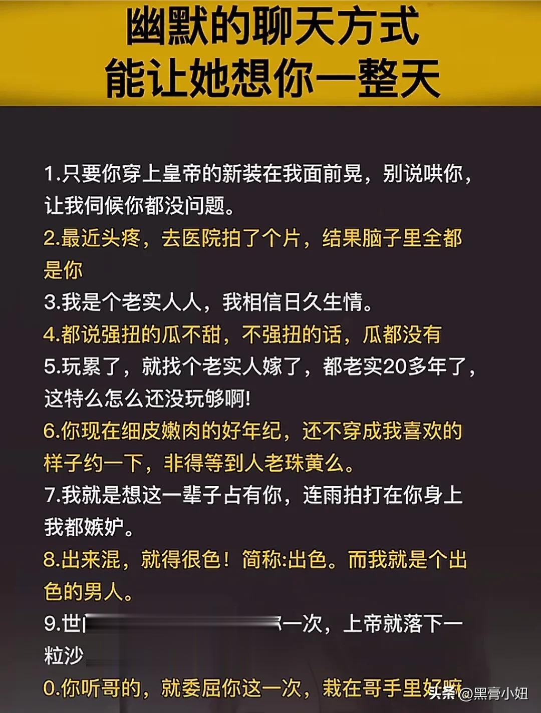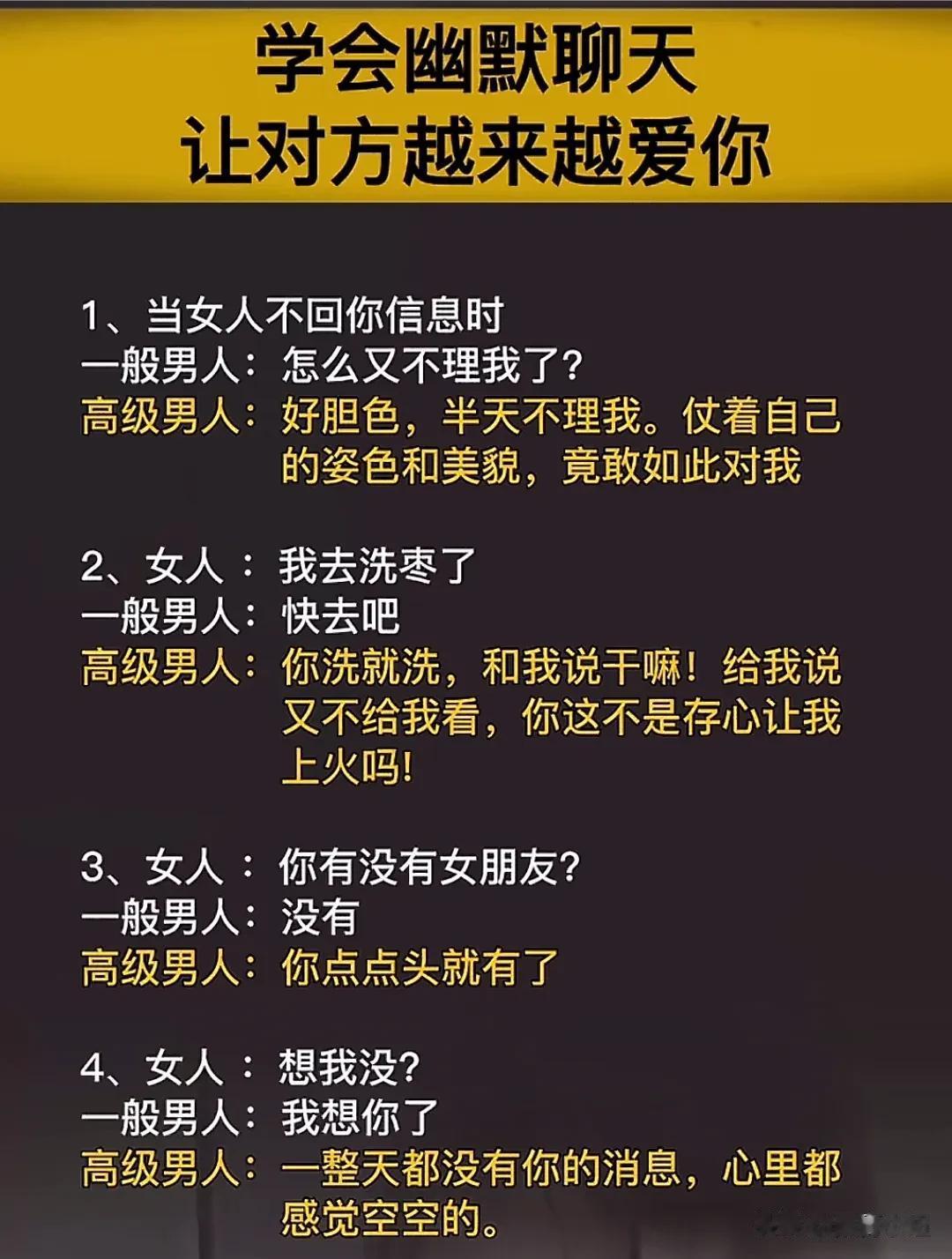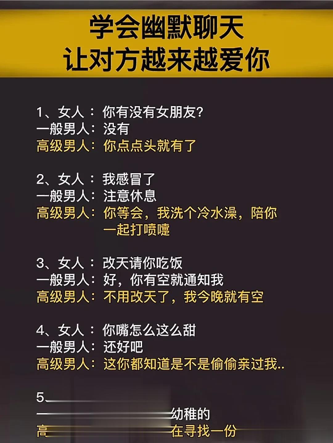 “太甜了”!果然会调情的男人,永远会让女人上瘾!会说话是优势,会聊天才是本事!学会幽默聊天,让对方越来越爱你! 你有多幽默,就有多讨人喜欢!牢记幽默公式:情理之中+意料之外,不管和谁都能聊的来,能让你轻松聊出感情聊出机遇!赶紧收藏起来吧,锻炼自己的口才沟通能力,提升自己的幽默感,你将受益终身! 幽默沟通+好好接话