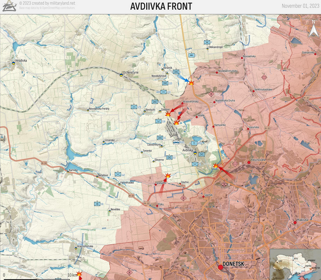 俄乌战争阿瓦迪夫卡战场,第一图是今年3月10日战场情况,第二图是今年11月1日战场情况。7个多月打下来,最大的变化就是,俄军在西北方向前进了1.5公里,控制了垃圾山附近区域。