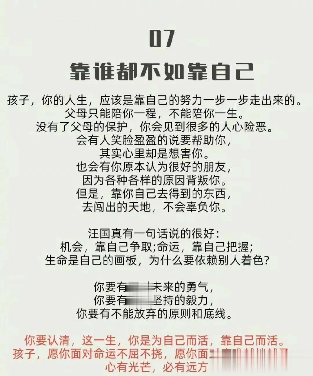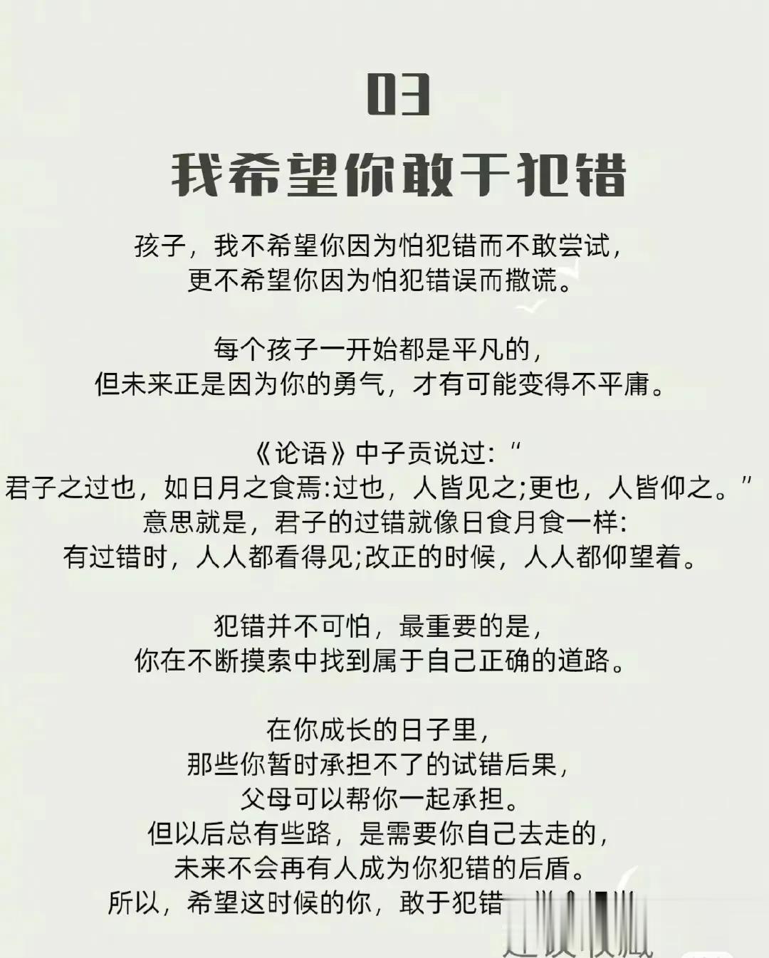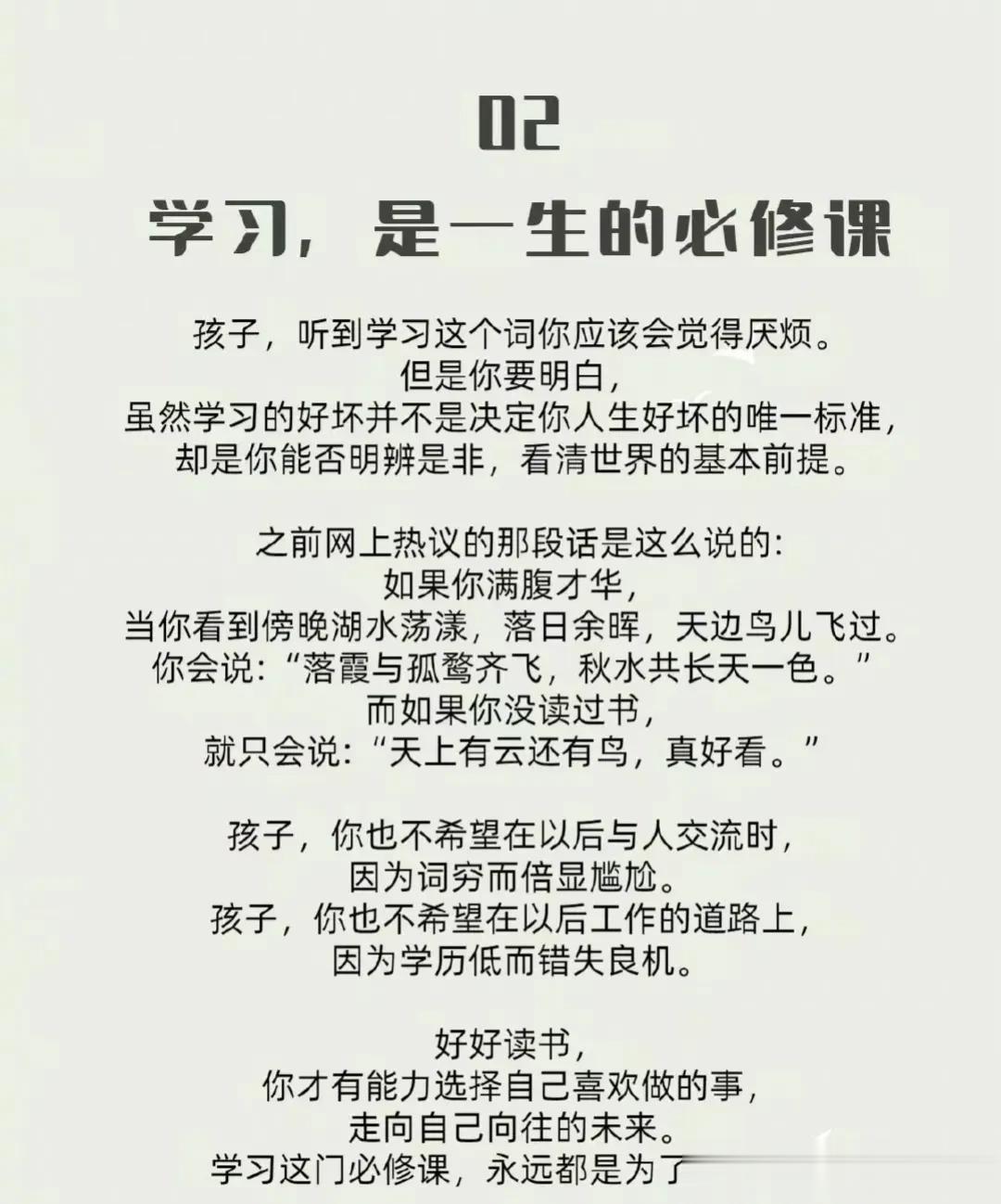 无论你的孩子多大,一定要跟他说这7句话,每一句都蕴含着巨大的人生智慧,胜过房子车子存款,比如黄金记忆时间法,学习,是一生的必修课。我不希望你因为怕犯错而不敢尝试,更不希望你因为怕犯错误而撒谎。生命是最珍贵的财富。学会心怀感恩。爱情,不是你生活的全部等等,没事多在孩子耳边叨叨,孩子一生都受益! 学习有方法有规划,解决沟通难题,孩子会越来越优秀! 亲子教育学习有规化