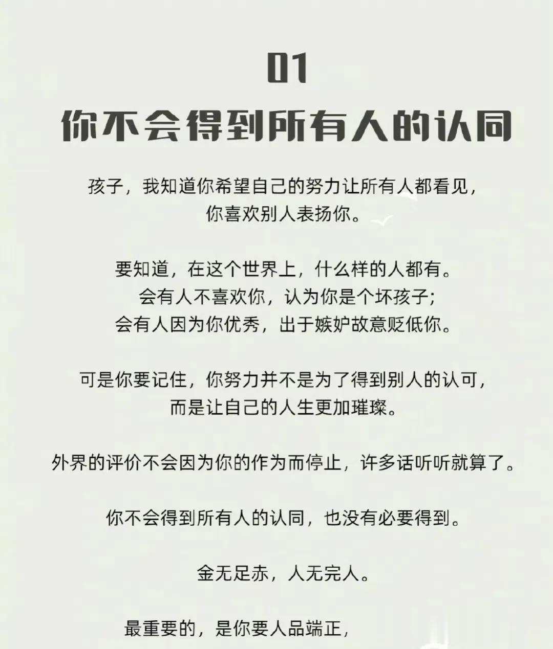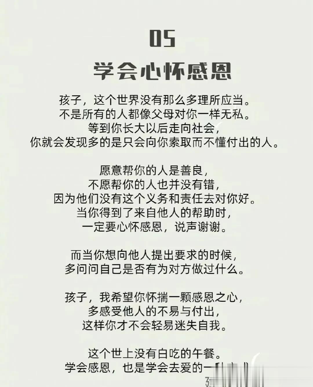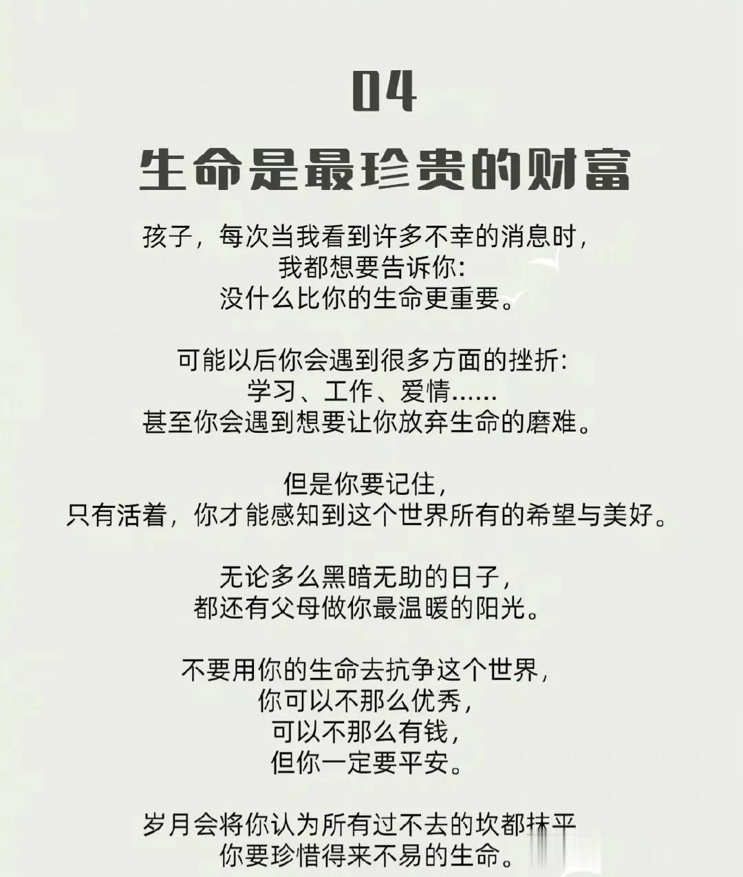 无论你的孩子多大,一定要跟他说这7句话,每一句都蕴含着巨大的人生智慧,胜过房子车子存款,比如黄金记忆时间法,学习,是一生的必修课。我不希望你因为怕犯错而不敢尝试,更不希望你因为怕犯错误而撒谎。生命是最珍贵的财富。学会心怀感恩。爱情,不是你生活的全部等等,没事多在孩子耳边叨叨,孩子一生都受益! 学习有方法有规划,解决沟通难题,孩子会越来越优秀! 亲子教育学习有规化