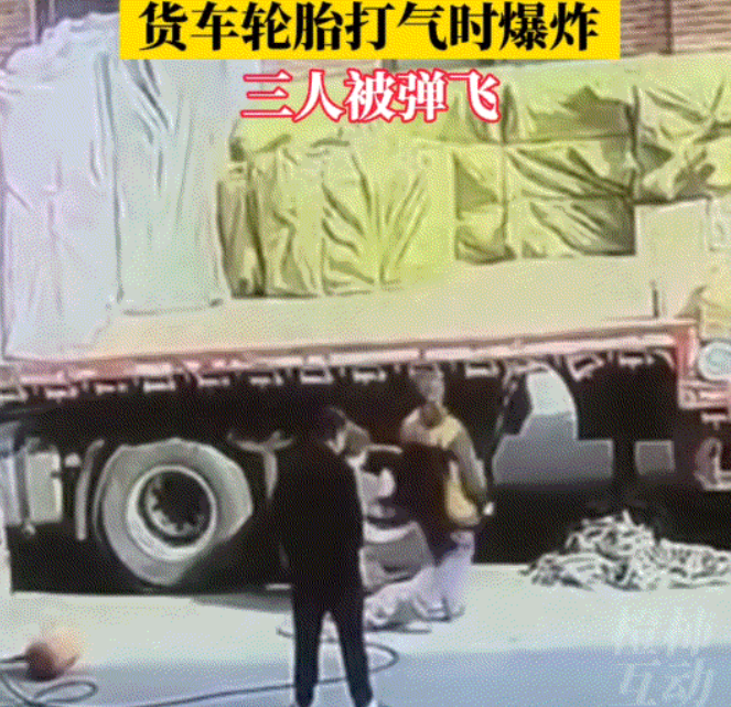 河北保定三人给货车轮胎打气时,轮胎突然爆炸,三人瞬间被弹飞,导致两伤一亡。