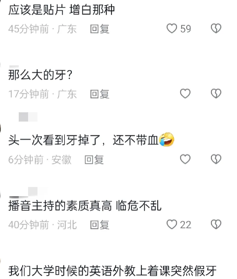 网友们看后纷纷评论道: 只知道新闻主播的头发是假的,没想到牙也是假的。 牙掉了不会流血吗? 我们大学时候的英语外教上着课突然假牙掉了。 播音主持的素质真高,临危不乱。 应该是贴片,增白那种。