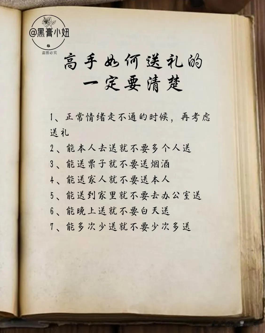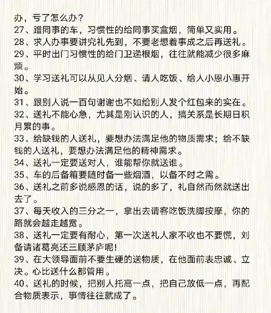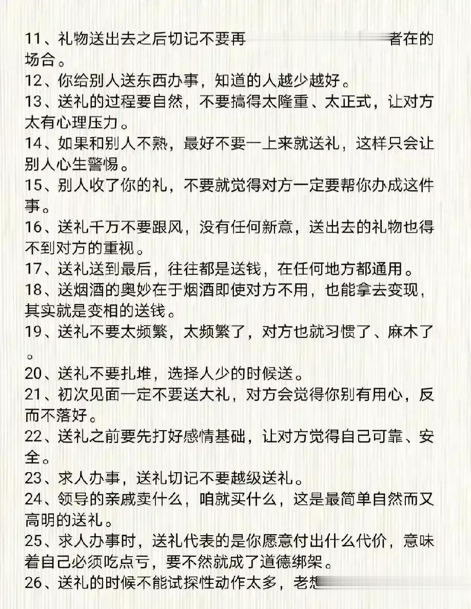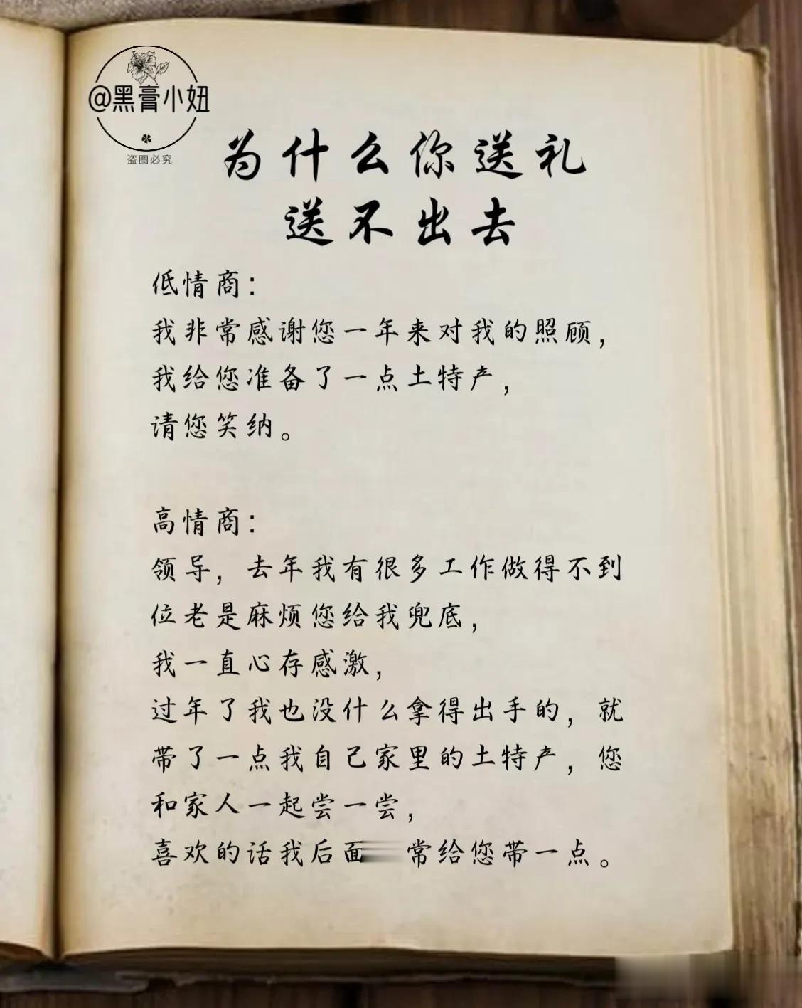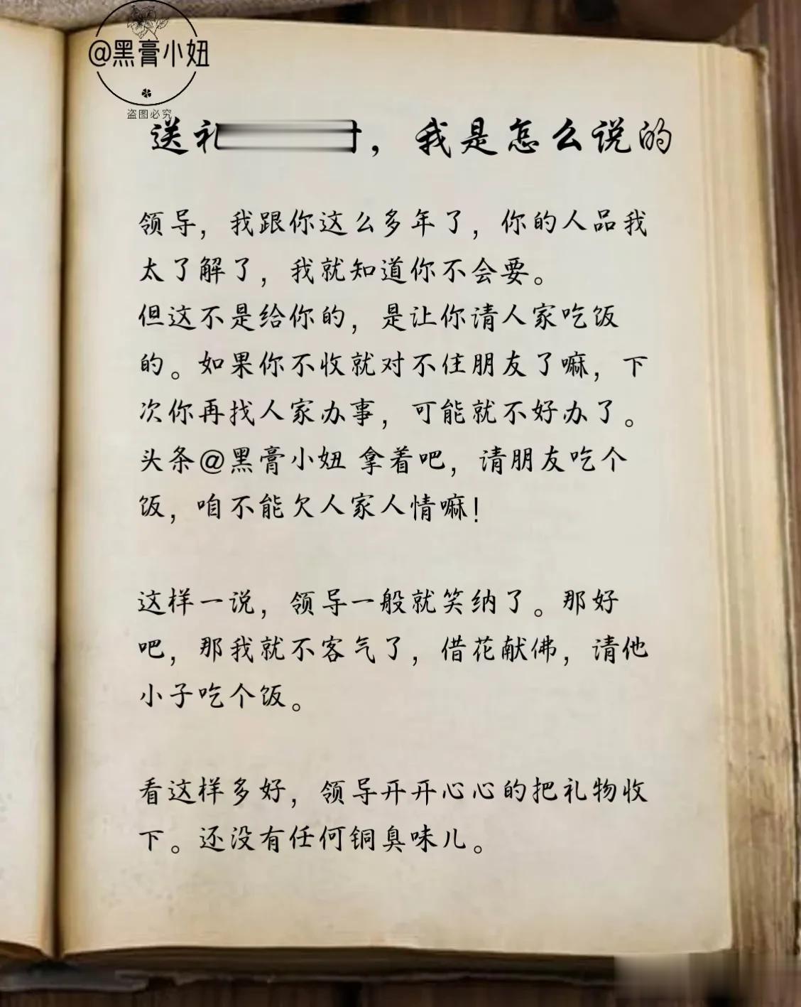 我滴天哪!终于见到这么全的送礼技巧和饭局潜规则,看完之后,真是被震惊到了,真后悔没早点看到,这堪称人情世故送礼的天花板!比如这句话,我送的不是礼,是我的感谢之情,没有您平时对我的关照,就没有我的今天,无论如何您要给我这个表示感谢的机会。 再比如:这礼不是送您的,您平时太忙了,这是我代表您对叔叔阿姨的一点心意,祝他们身体健康。 …… 行走社会的精髓是什么,多应酬,多送礼,多社交。不管是职场还是生活,尽早把这些送礼话术与应酬小技巧吃透,能助你越混越好。赶紧下方链接系统的学起来,说话办事应酬礼仪全都有,能助你事半功倍! 中国式送礼应酬技巧