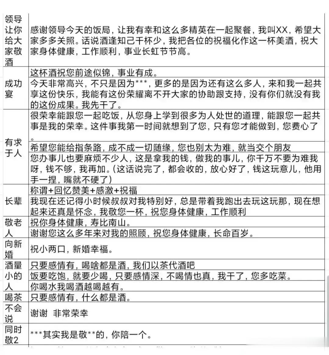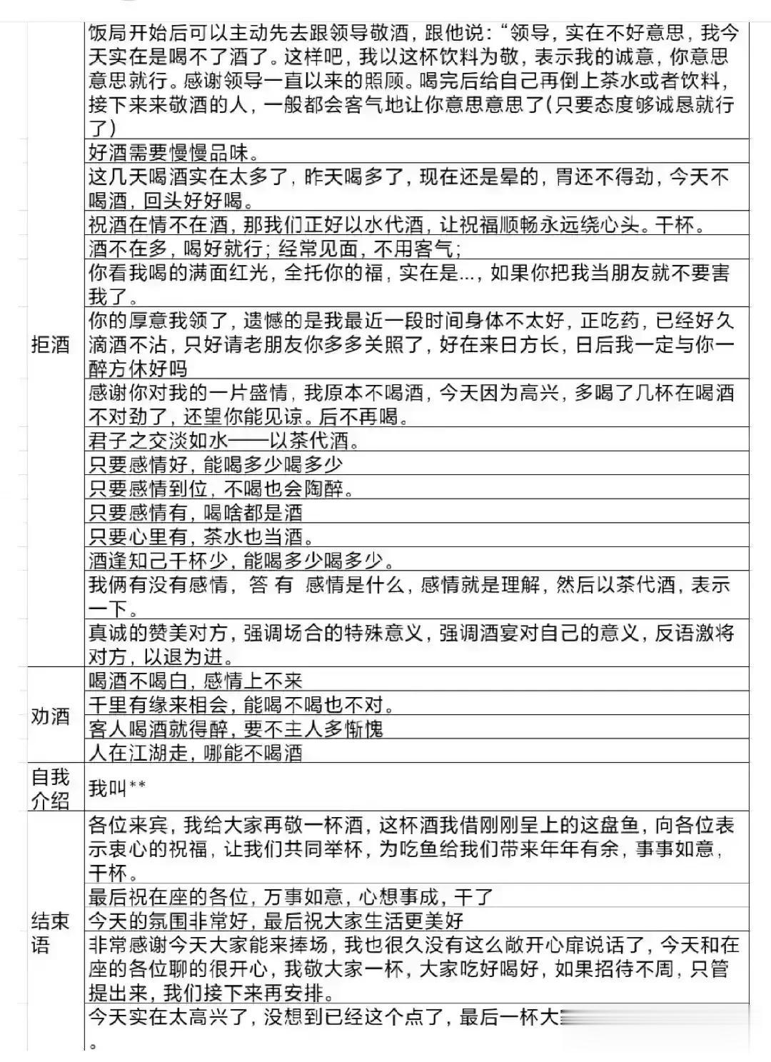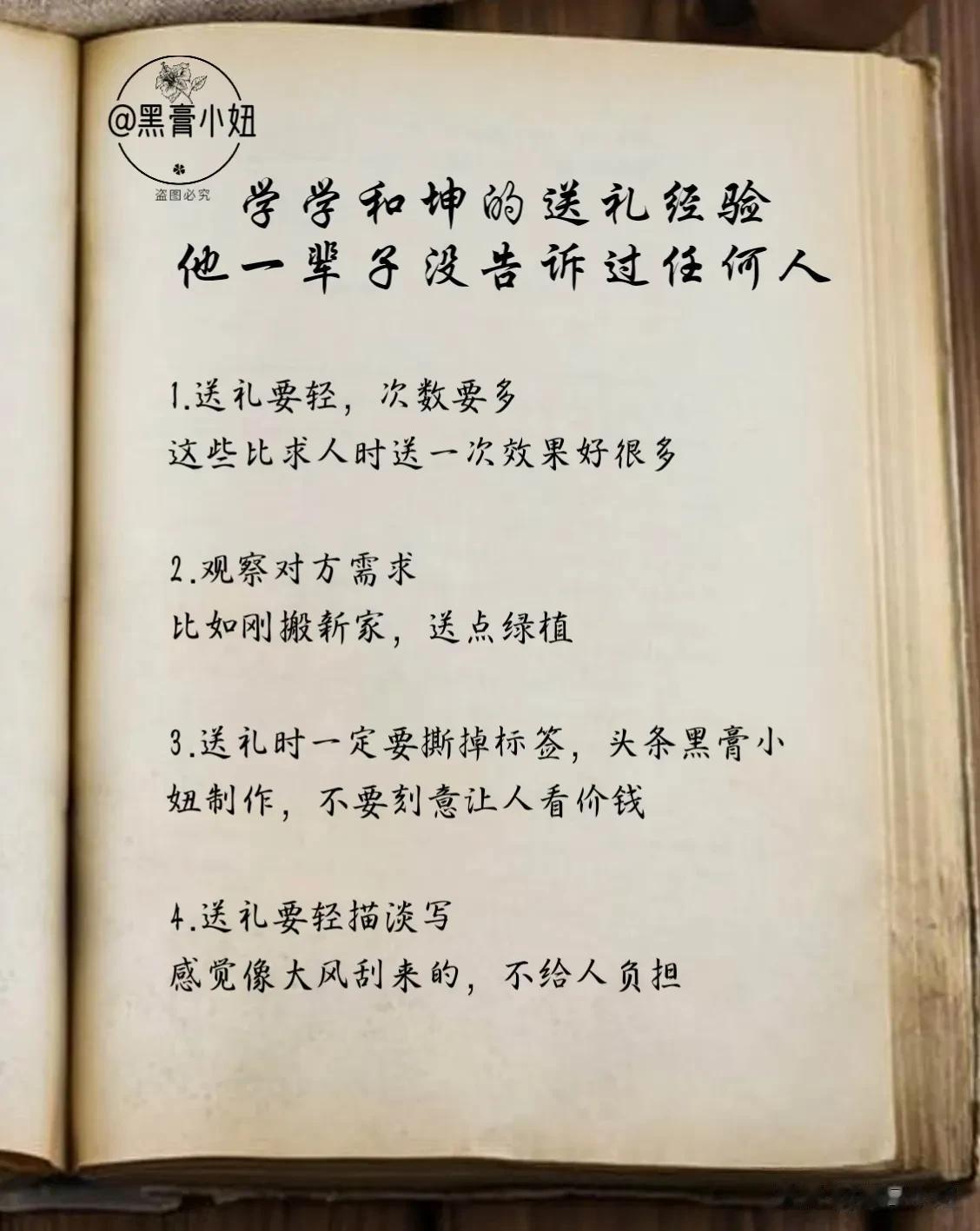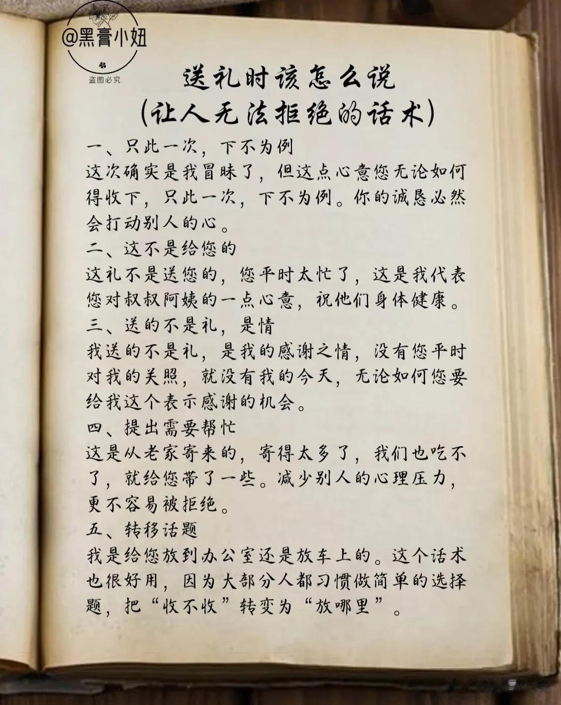 我滴天哪!终于见到这么全的送礼技巧和饭局潜规则,看完之后,真是被震惊到了,真后悔没早点看到,这堪称人情世故送礼的天花板!比如这句话,我送的不是礼,是我的感谢之情,没有您平时对我的关照,就没有我的今天,无论如何您要给我这个表示感谢的机会。 再比如:这礼不是送您的,您平时太忙了,这是我代表您对叔叔阿姨的一点心意,祝他们身体健康。 …… 行走社会的精髓是什么,多应酬,多送礼,多社交。不管是职场还是生活,尽早把这些送礼话术与应酬小技巧吃透,能助你越混越好。赶紧下方链接系统的学起来,说话办事应酬礼仪全都有,能助你事半功倍! 中国式送礼应酬技巧
