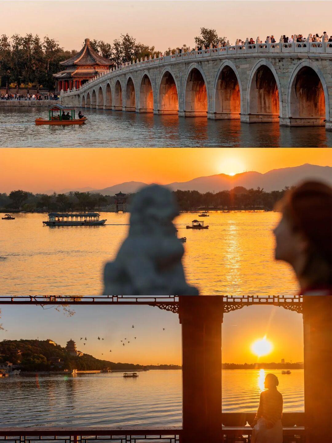 早上6:30开门北如意门-豳风桥看日出-画中游-万寿山-四大部洲-瑞兴号-苏州街-谐趣园-宫事颐庭吃下午茶-石舫码头坐船去南湖岛-等十七孔桥日落-东堤等佛香阁亮灯-新建宫门出去