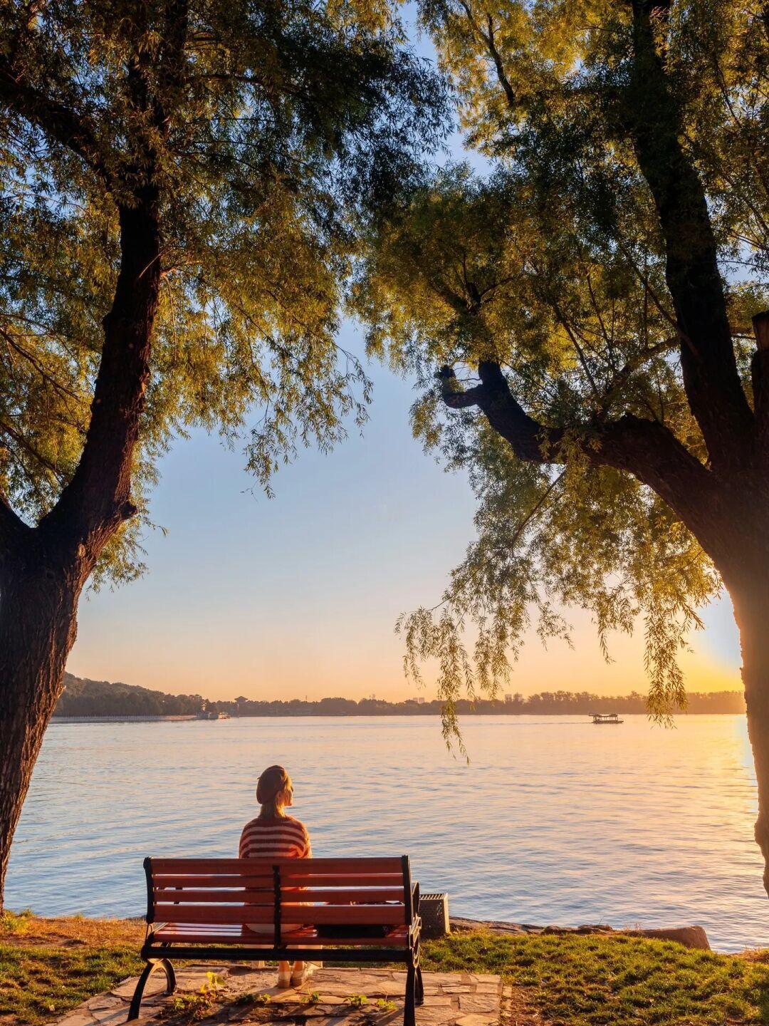 我心中颐和园最美的地方,早上整个湖面超级平静,太阳缓缓升起,金黄色的太阳照耀在佛香阁,宛如宫廷画,太美好了!