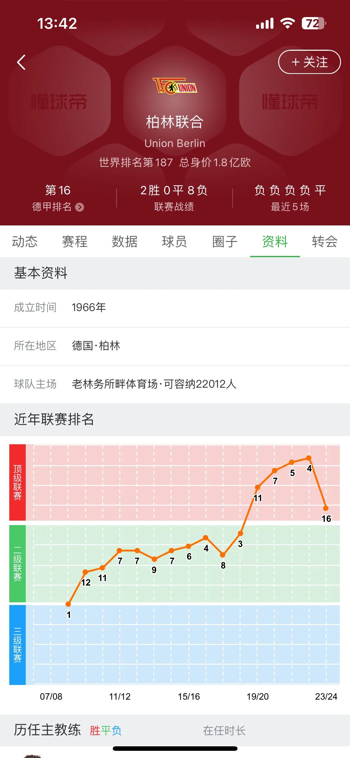 柏林联合这赛季可以说双线都崩盘了!德甲联赛2胜8负仅积6分排第16名,倒数第三,欧冠也是仅积一分小组垫底!上赛季那个闯进欧冠的大黑马现在露原型啦。再次说明了这种平民球队没有双线作战的能力,老老实实稳定在联赛中游就挺好的,太冒进冲进了欧冠第二年就得保级了!