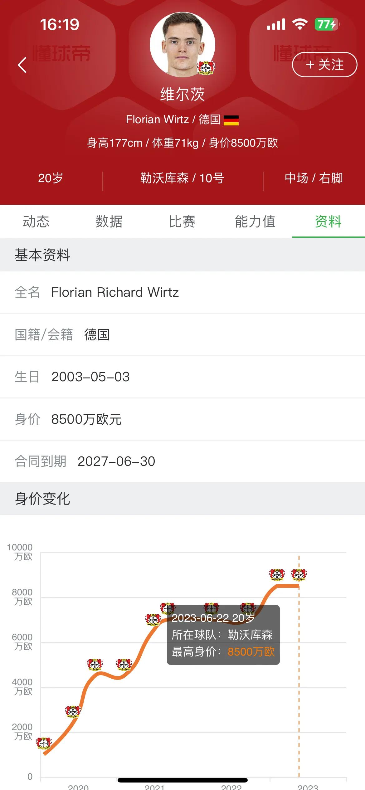 维尔茨可能会是未来足坛TOP5的存在。在目前讨论足坛未来球王中,大家会提到姆巴佩、哈兰德、贝林厄姆、维尼修斯、穆夏拉、萨卡等人,但基本没有人提到维尔茨。原因是因为他目前效力的勒沃库森还不是豪门,曝光率不够,再加上他之前曾经大伤报销了接近一年。但是这赛季勒沃库森表现非常的强势,作为这支球队毫无疑问的头号球星,出道好几年但是其实年仅20岁的维尔茨很有可能未来登陆顶级豪门成为金球奖大热!