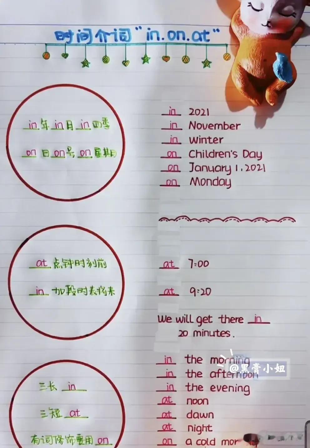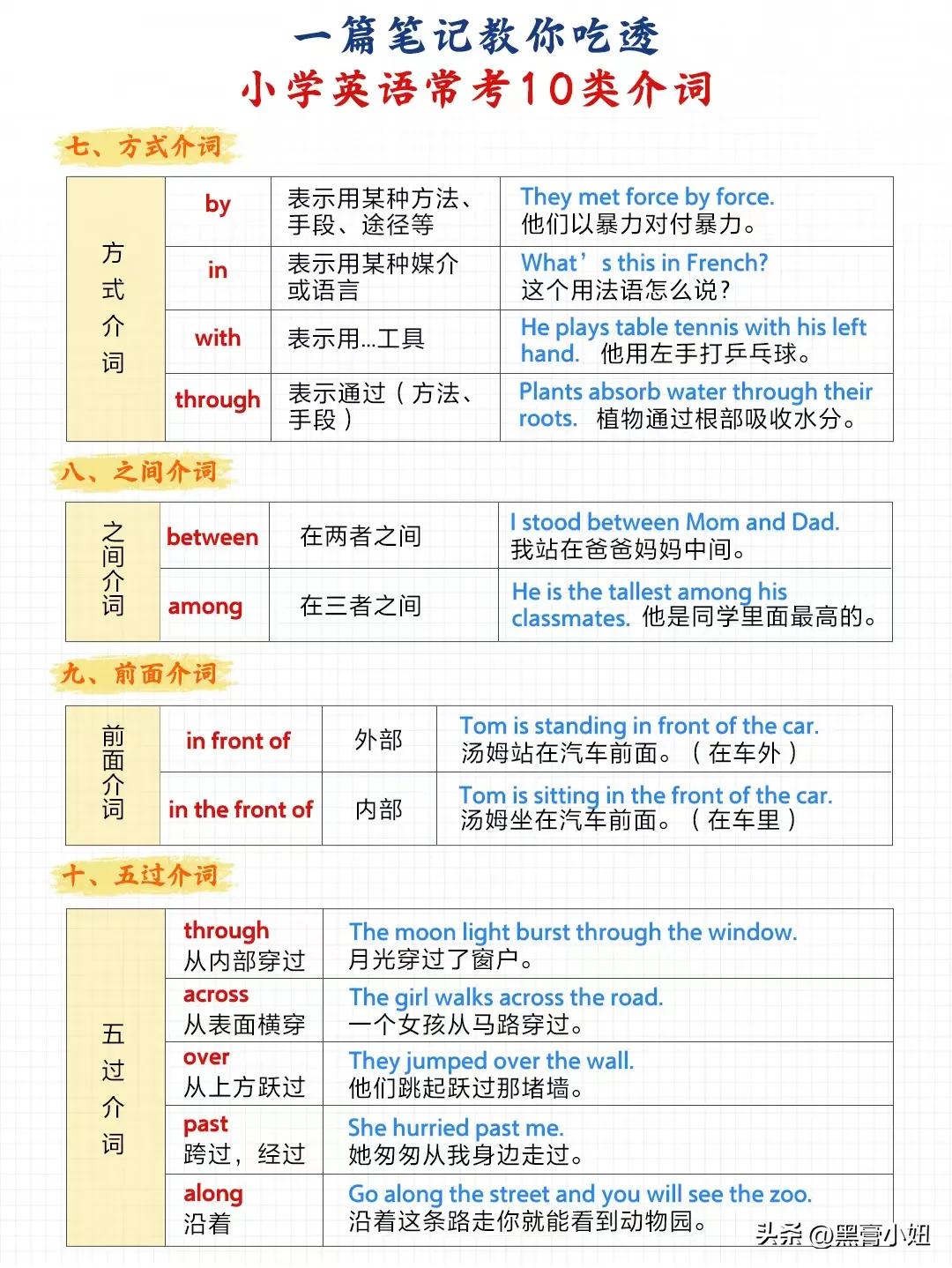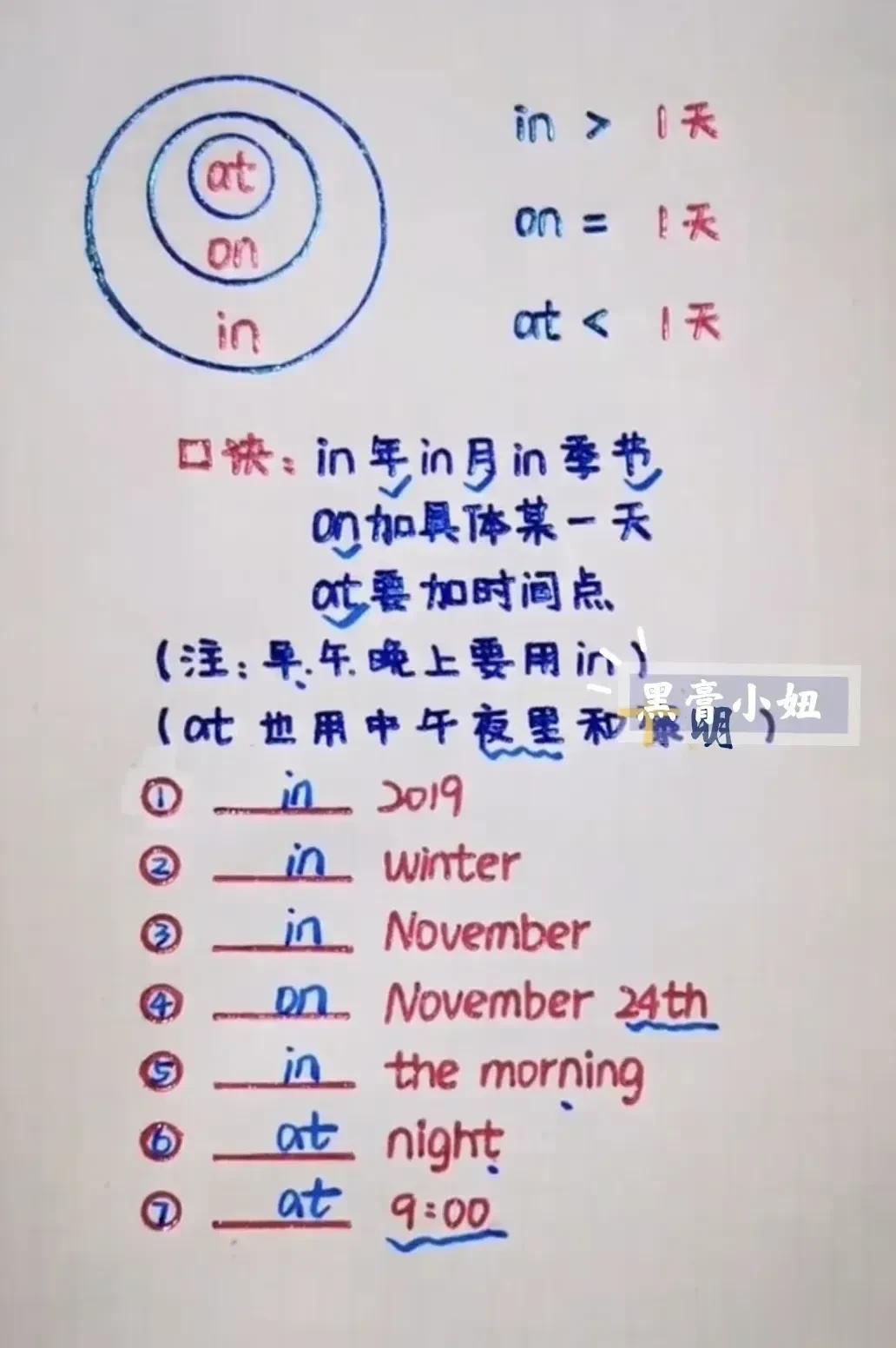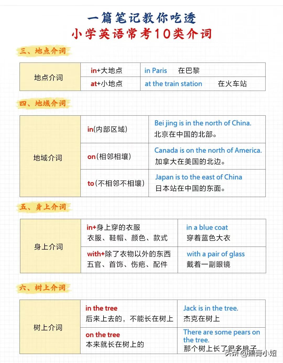 12页图纸搞定英语10类介词!!超详细解释!一目了然,帮助孩子快速掌握,英语成绩提高一大截。赶紧收藏!适合小学,初中,高中,越早让孩子掌握越好! 英语介词的运用也是难上加难,很多孩子在学习介词这块就搞不清楚,学着学着就乱套了。死记硬背效果差,还费时间,利用顺口溜,效果又高又省时;使人觉得学习英语还是饶有兴趣的。比如in年in月in季节,on日on 号 on 星期…… 英语语法小学初中高中