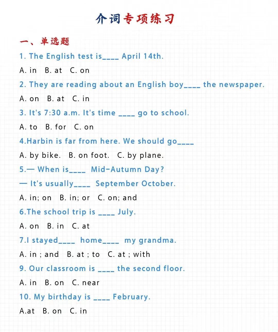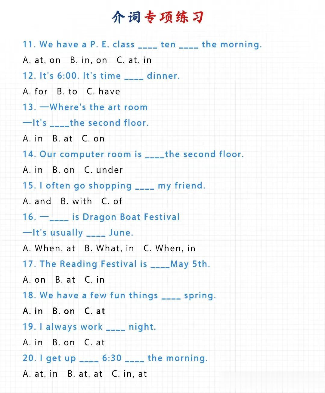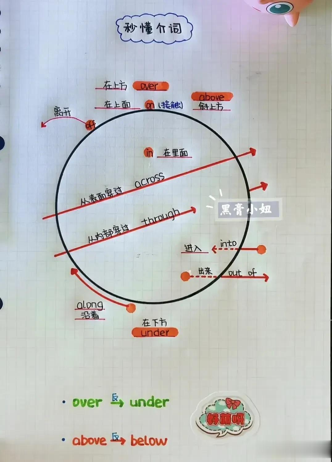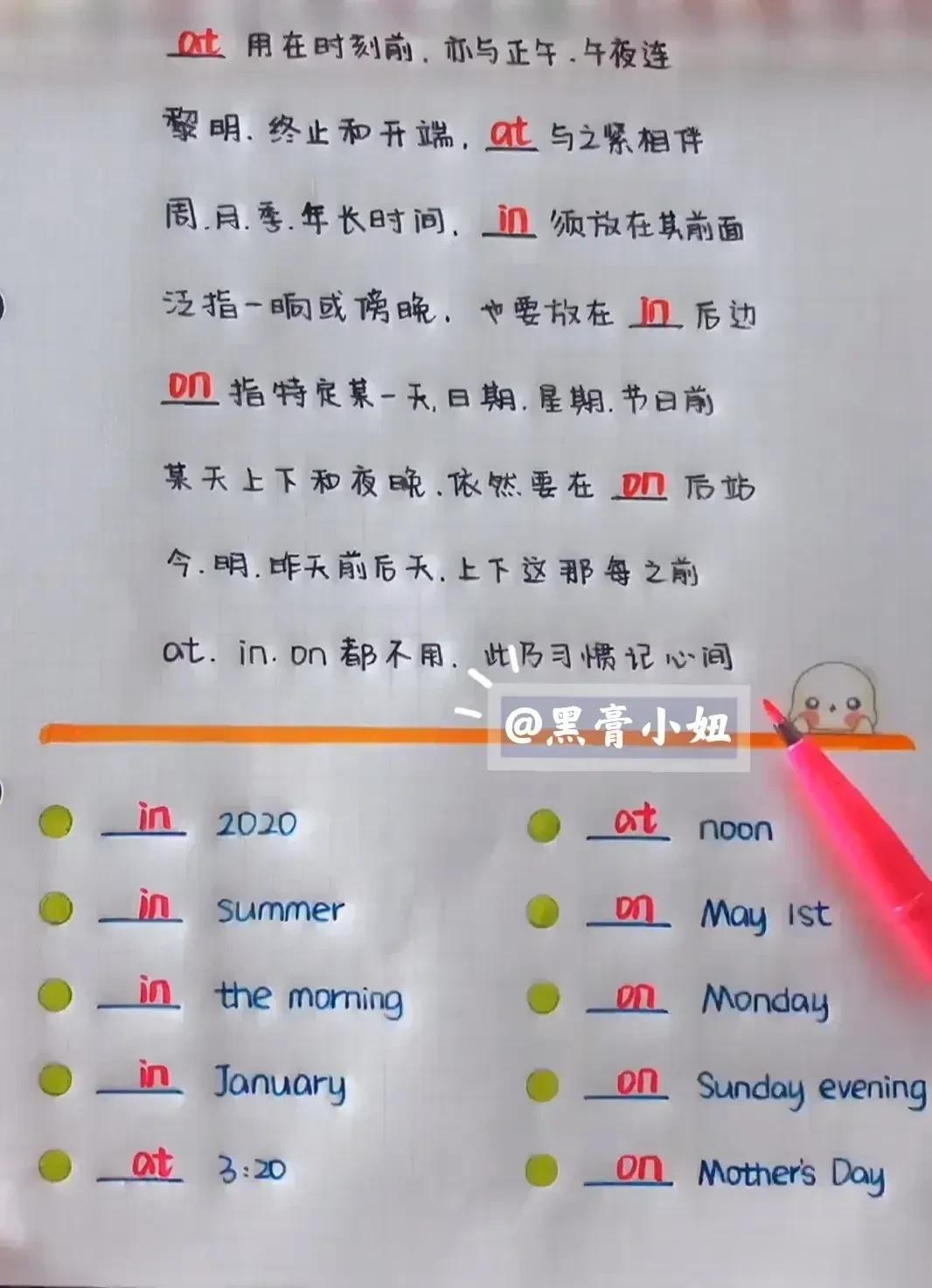 12页图纸搞定英语10类介词!!超详细解释!一目了然,帮助孩子快速掌握,英语成绩提高一大截。赶紧收藏!适合小学,初中,高中,越早让孩子掌握越好! 英语介词的运用也是难上加难,很多孩子在学习介词这块就搞不清楚,学着学着就乱套了。死记硬背效果差,还费时间,利用顺口溜,效果又高又省时;使人觉得学习英语还是饶有兴趣的。比如in年in月in季节,on日on 号 on 星期…… 英语语法小学初中高中