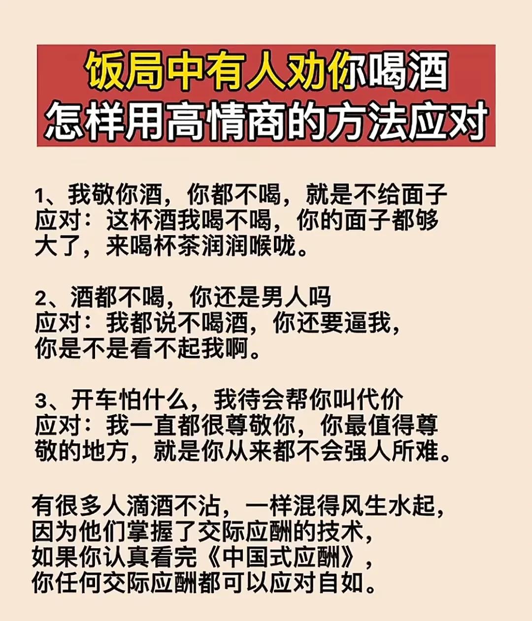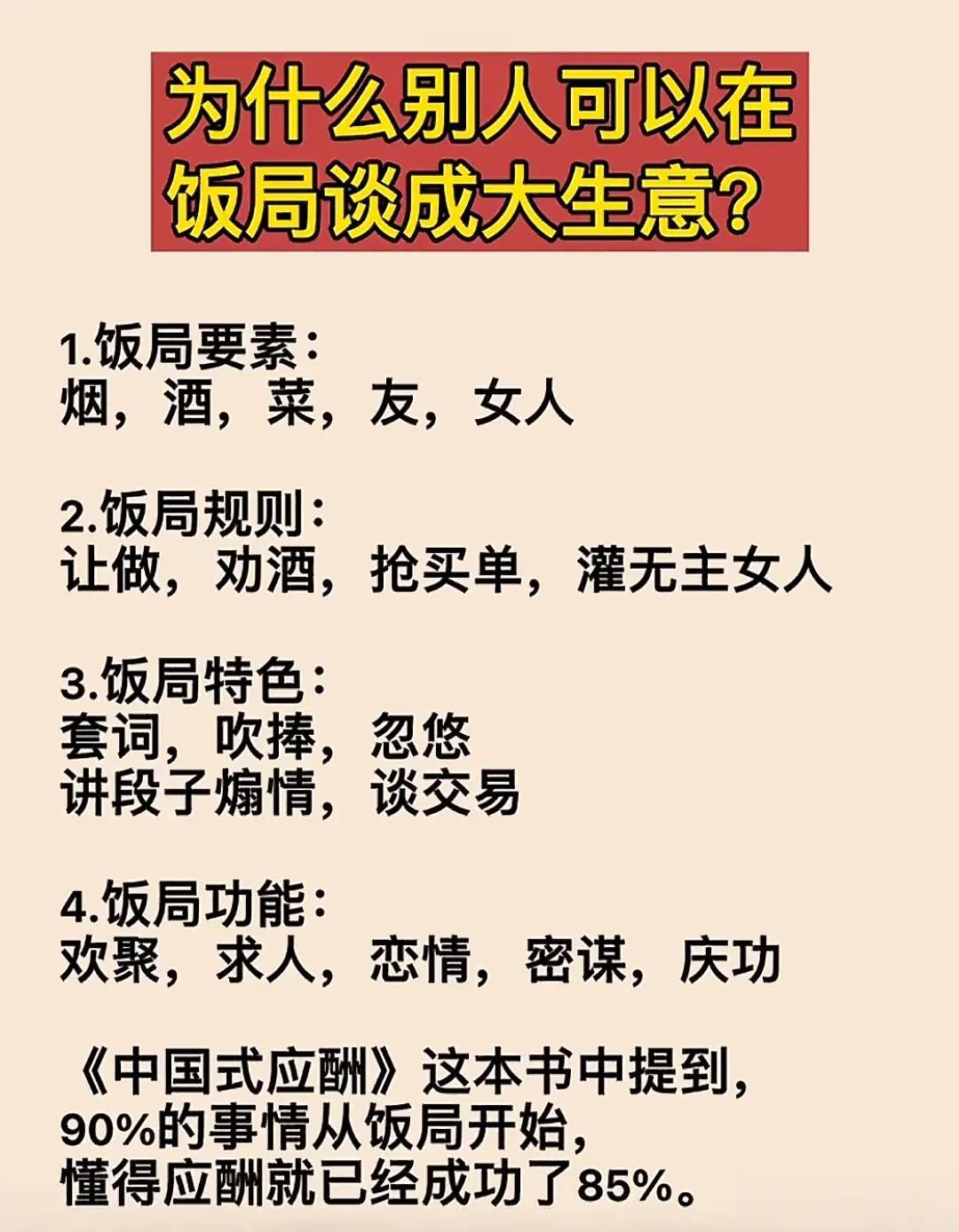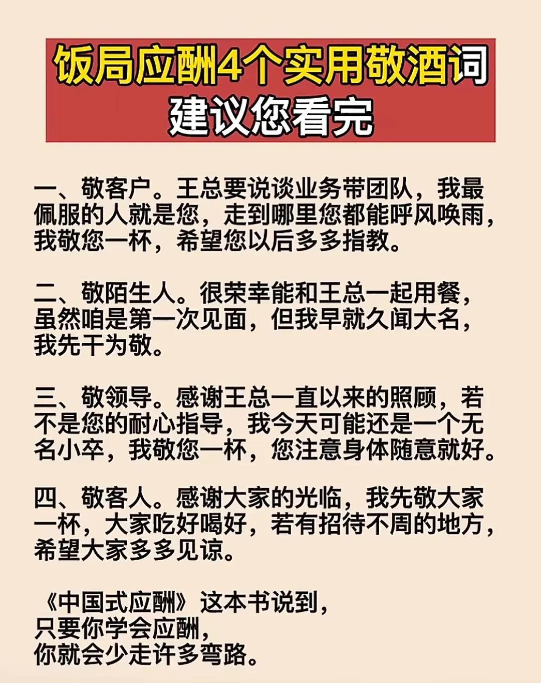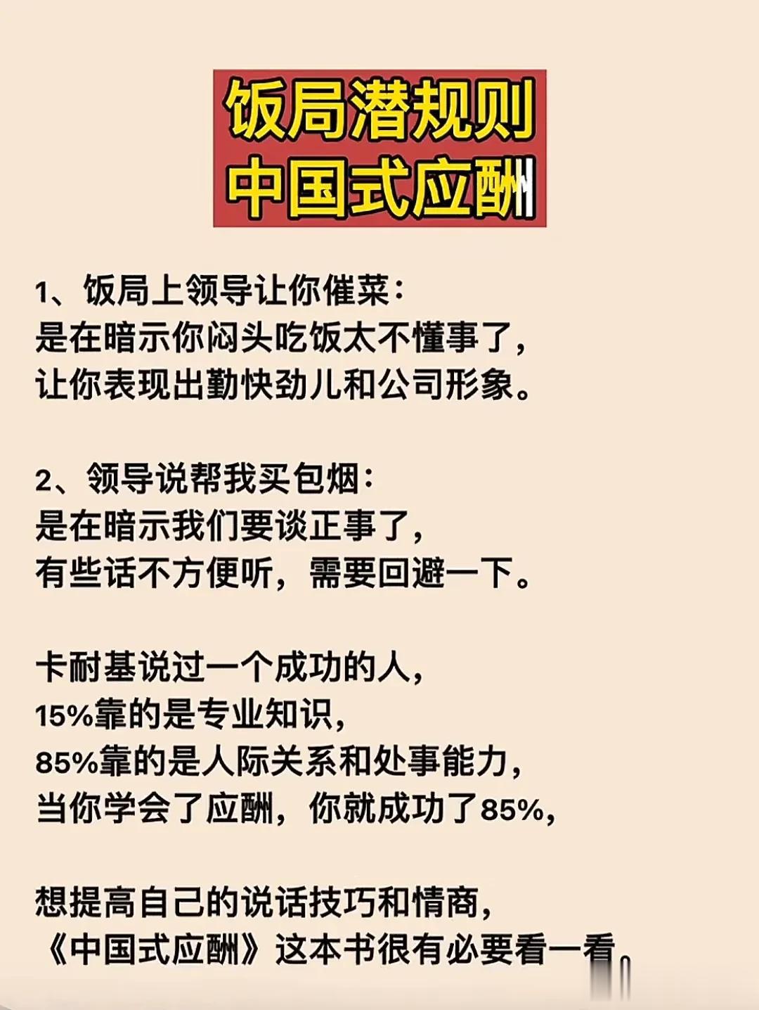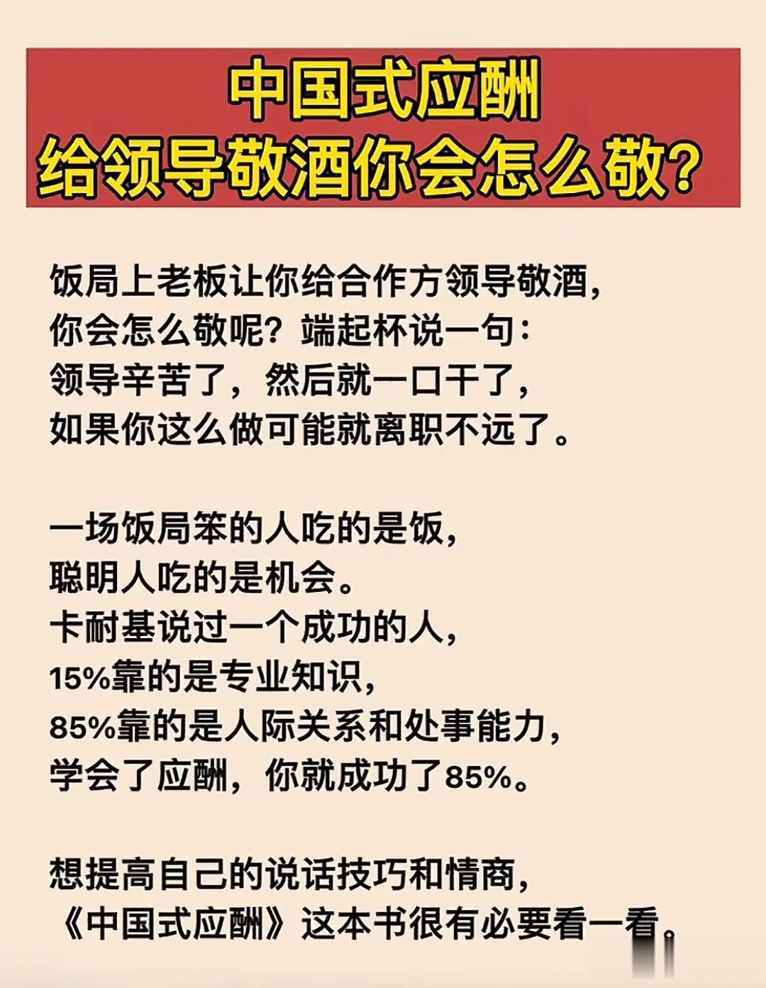 一位上市公司退休领导悄悄告诉我,这些中国式应酬的精髓,一定要牢记,不仅能赢得客户的信任,谈成大生意,领导也会器重你,升职加薪。赶紧学起来! 饭局是人情世故的爆发地,能成事更能坏事。一杯酒就能拉近双份之间的关系,能制造和谐融洽的氛围,让别人对你的好感剧增。 应酬是门技术活,懂得应酬,你的事情就成功了一大半。没事多看中国式应酬,总结了很多中国式的处世智慧和商业的潜规则案例,提高自己的说话技巧和情商,让你在职场势如破竹,越混越好。 《中国式应酬》这本书说到,只要你学会应酬,你就会少走许多弯路。 中国式应酬