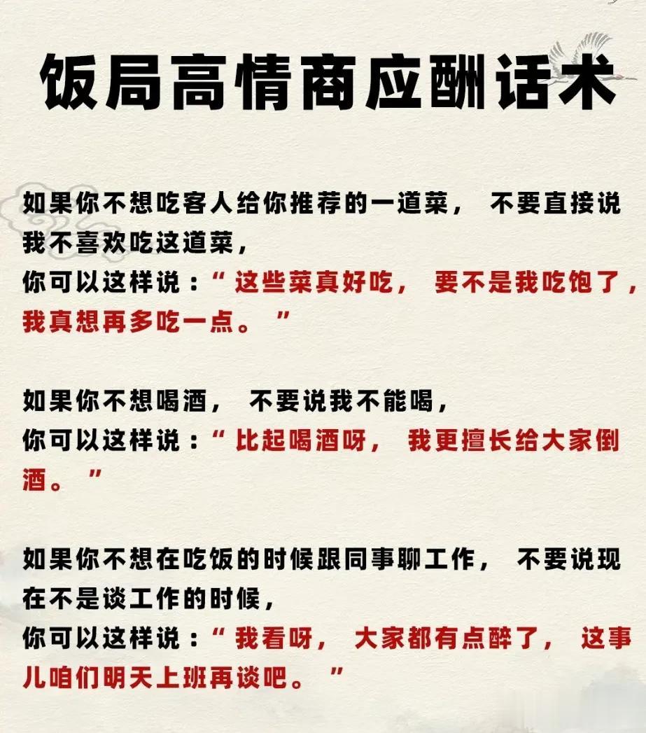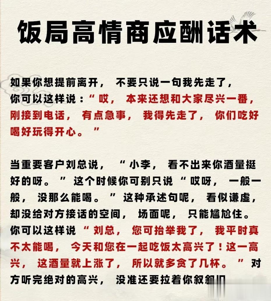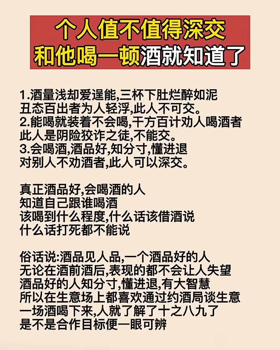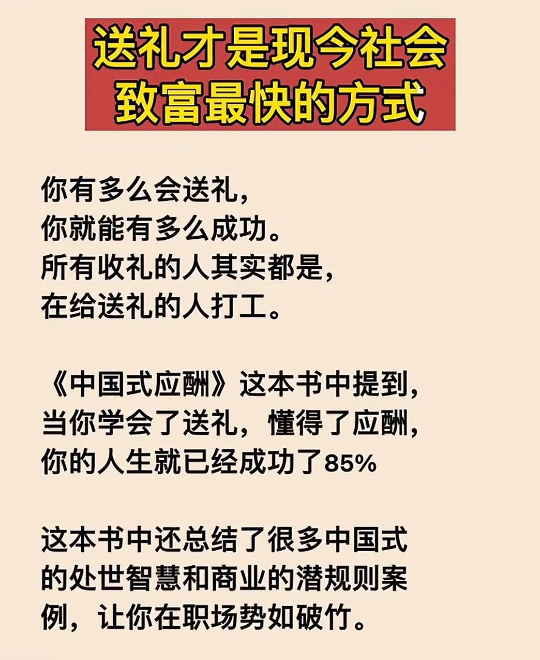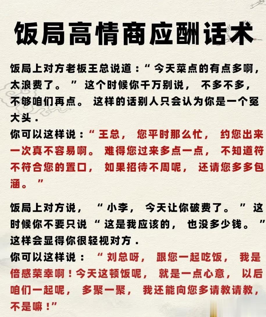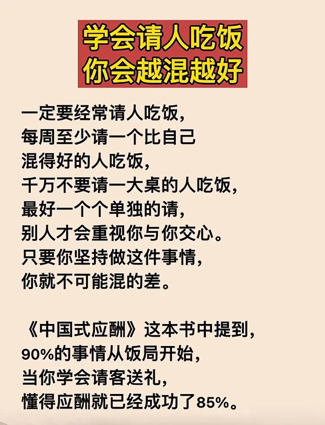 一位上市公司退休领导悄悄告诉我,这些中国式应酬的精髓,一定要牢记,不仅能赢得客户的信任,谈成大生意,领导也会器重你,升职加薪。赶紧学起来! 饭局是人情世故的爆发地,能成事更能坏事。一杯酒就能拉近双份之间的关系,能制造和谐融洽的氛围,让别人对你的好感剧增。 应酬是门技术活,懂得应酬,你的事情就成功了一大半。没事多看中国式应酬,总结了很多中国式的处世智慧和商业的潜规则案例,提高自己的说话技巧和情商,让你在职场势如破竹,越混越好。 《中国式应酬》这本书说到,只要你学会应酬,你就会少走许多弯路。 中国式应酬