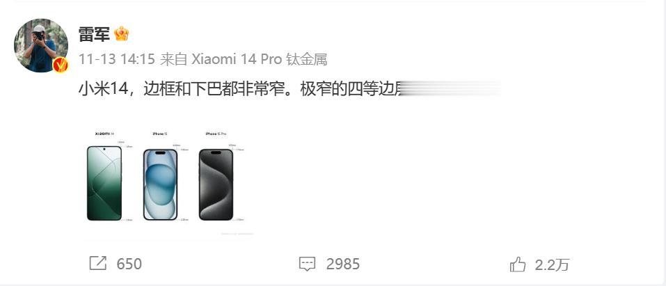 这莫须有的罪名是不是有点太无厘头了呢? “小米雷军在线开怼iPhone”这个话题莫名奇妙的就上了热搜!或许是我太笨,读了好几遍对应的文章也没有明白雷军在哪里怼了iPhone。 客观来讲,雷军只是发布了一条微博,用来向消费者展示一下小米14的边框和下巴到底有窄,带来的四等边屏幕的观感如何。而配图只是单纯的展示了一下小米14和iPhone15系列边框以及下巴的参数而已。而这条微博就被一些网友拿来炒作,硬生生的说是雷军开怼iPhone,大家觉得这些人说的有道理没? 咱们有一说一,在刚刚结束的双十一活动中,小米14系列的销量的确喜人,销售十天就取得了144.74万部的好成绩。而反观iPhone15系列却在双十一还有2小时结束前出现迷之降价的情况,这只能说明小米14系列对于iPhone15系列的冲击太大了,从而导致iPhone不降价就没有人过问的囧境,小米14系列的产品力可见一斑。 另外,小米14系列这次无论是性能、屏幕还是续航都有了显著的提升,尤其是搭载徕卡Summilux镜头和光影猎人900传感器的组合带来的影像能力,以及小米澎湃OS的诞生,都见证了国产手机在自研能力上的长足进步。正所谓没有对比就没有伤害,小米越来越强,苹果越来越不思进取,即使不用开怼,其实胜负已分,烦请哪些喜欢挑事之人莫开尊口!