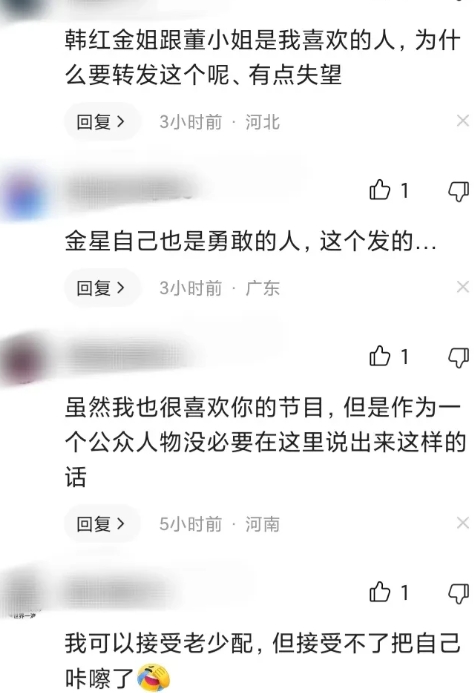 而金星作为知名女性,这样内涵另外一位知名女性,不管怎么说,都显得非常不妥,所以网友们的反应普遍是这样的: