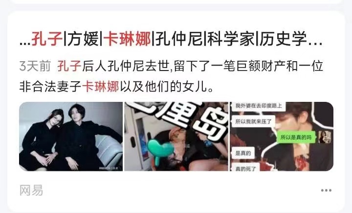 前阵子网红仲尼去世了,网上出现了很多AI写的新闻…因为孔子字仲尼,AI就离谱地写仲尼是孔子后人,还有卡琳娜抱着孔子……