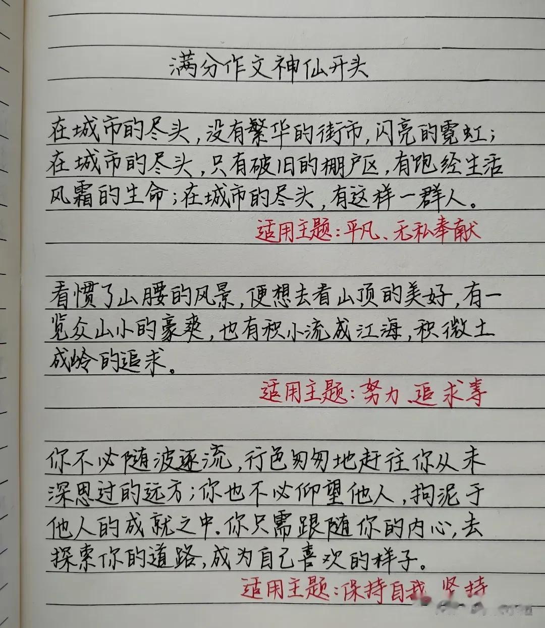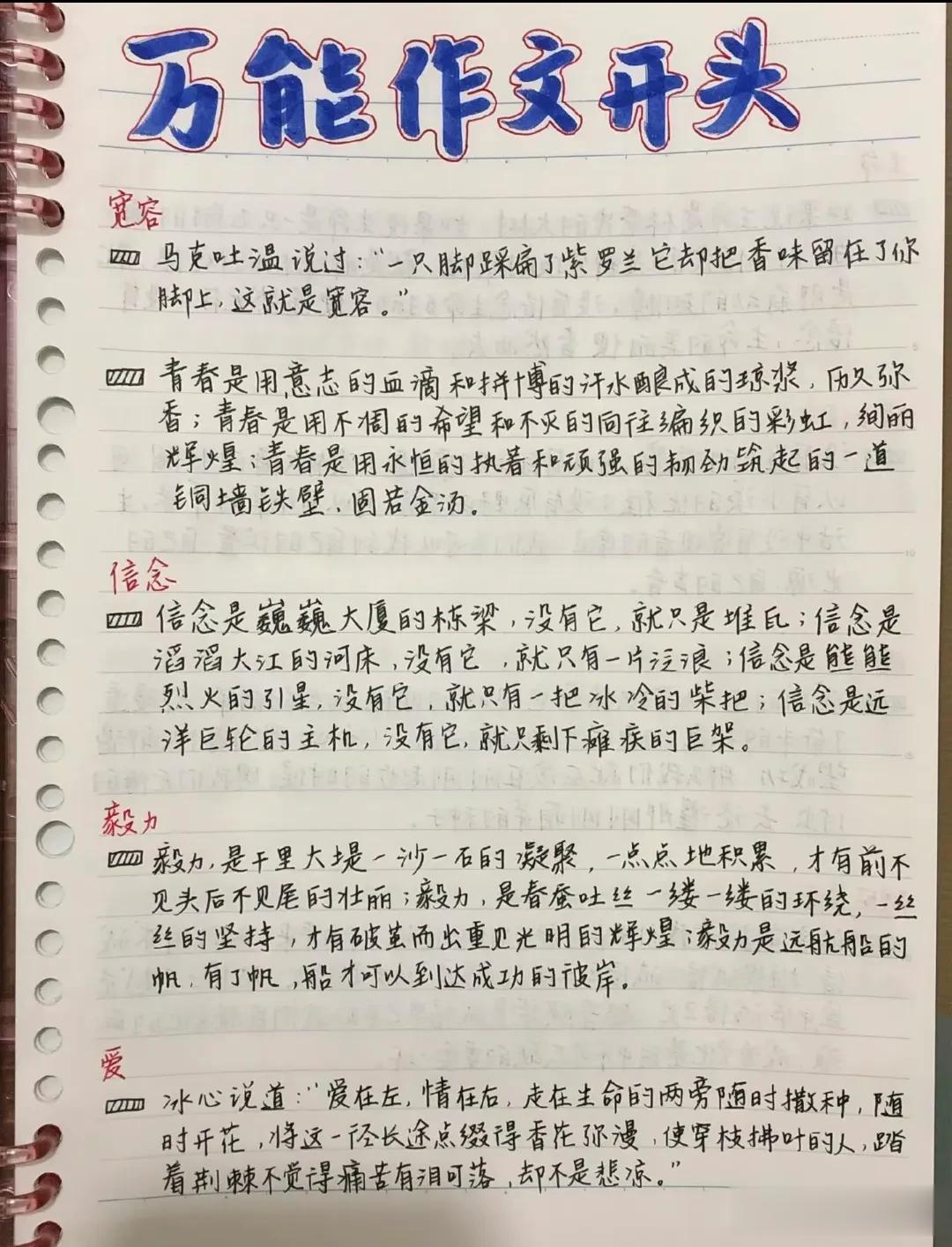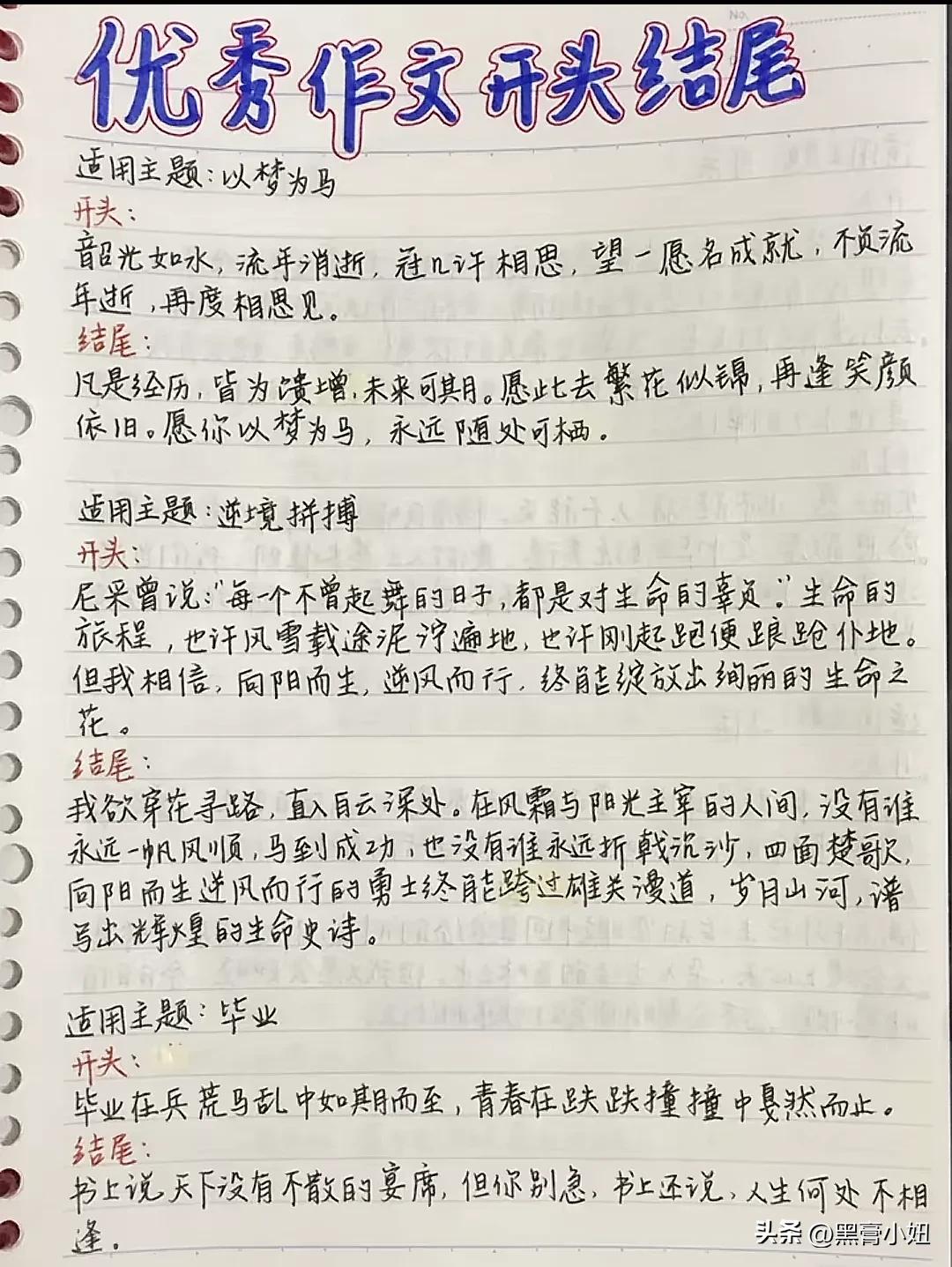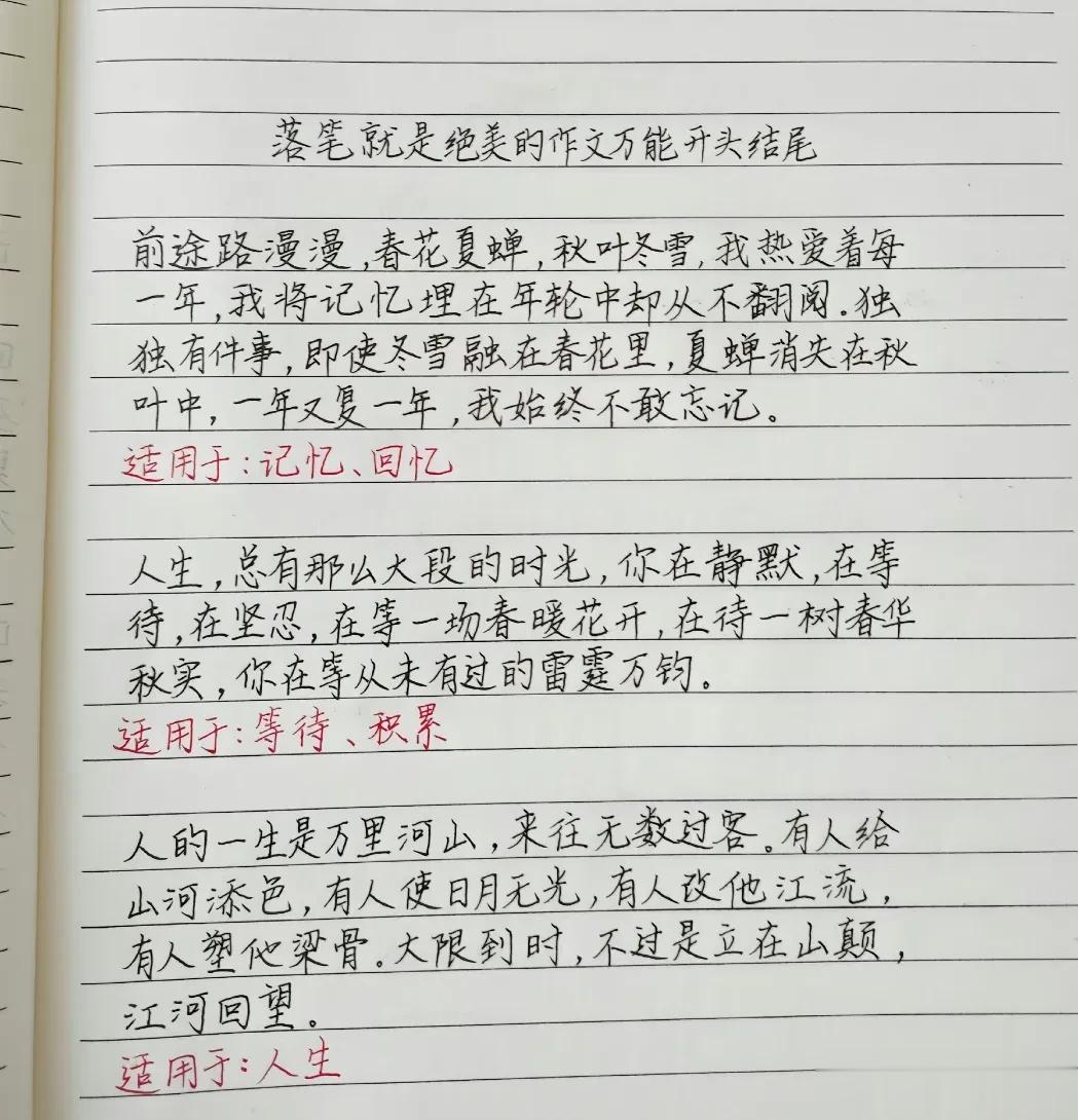 “太惊艳了!”那些落笔就是绝美的作文万能开头和结尾,百用不腻,瞬间惊艳阅卷老师!不愧是学霸积累下来的,家有孩子的赶紧收藏学习!如果能背一背的话,引用到作文里,肯定是高分之作。 代替“记得有1天”的高级句子 拉开时间的帷幕,盛夏仍然蝉鸣不止.寒冬仍然白雪漫天,眼前是过去的青春,是如烟的岁月,是我的从前。 晚风拂过山岗,撞到充满回忆的夕阳瓶,把我拉回记忆中的那一天。 作文不要再写“记得有一次”了 你可以这样写: 往事如烟,飘然而过,时间的风吹散了岁月的记忆,但永远吹不散这一件久记于心的事。 时光如白驹过隙,虽然那段经历已在时间的长河里流逝,但它如同一杯历久弥新的美酒。时时散发出芳香,并在我心底永存。 句句不提“雨”,如何描写雨很大? 城市拥抱朦胧,街上的行人被薄雾渲染,玻璃上的倒影即使被打碎,也依旧是那么美。 …… 作文开头结尾佳句