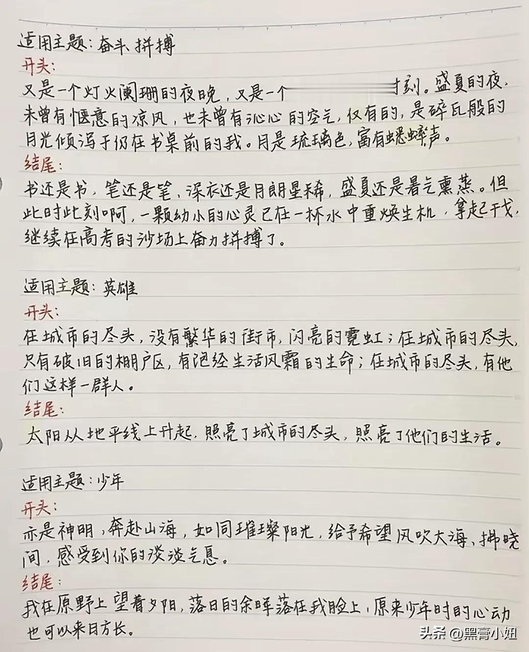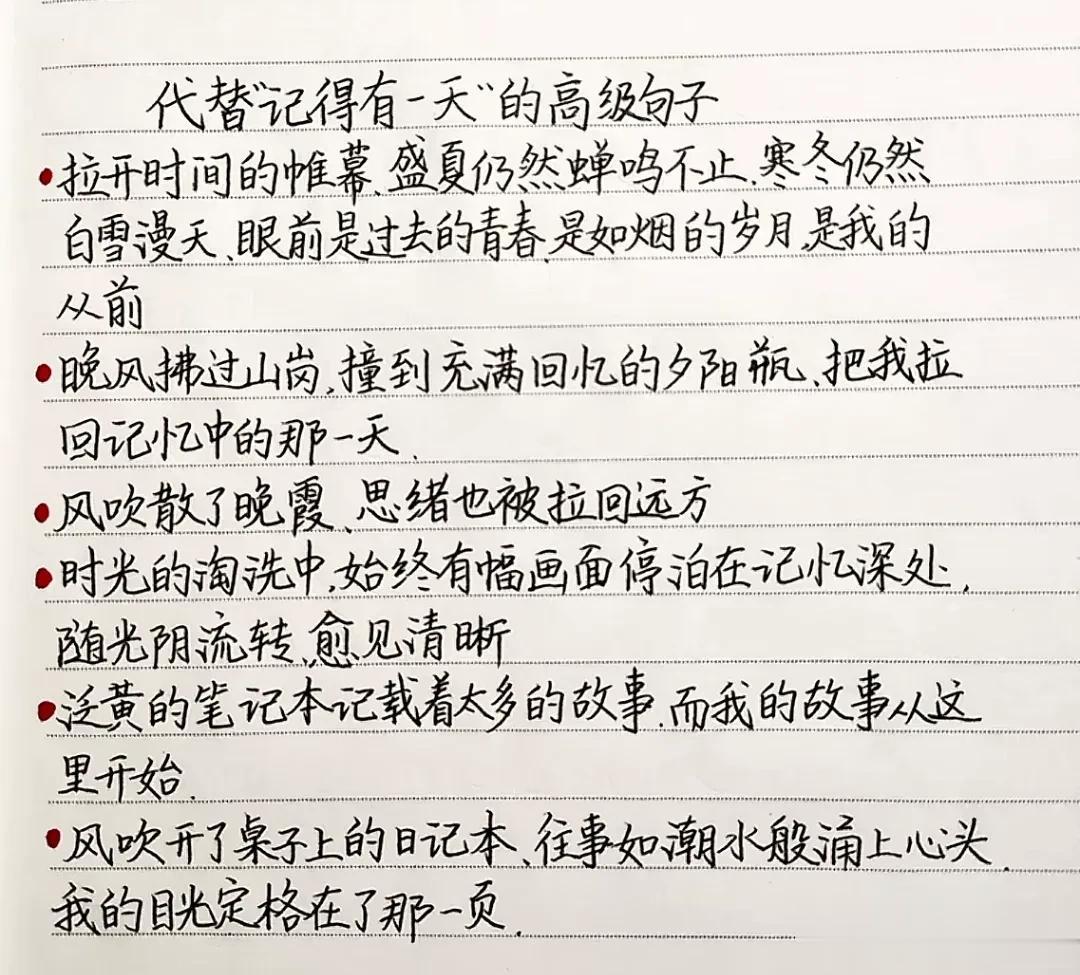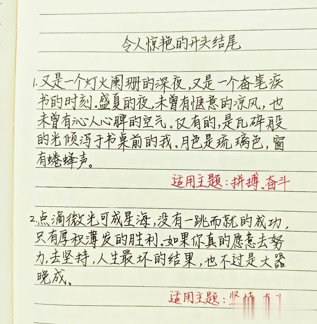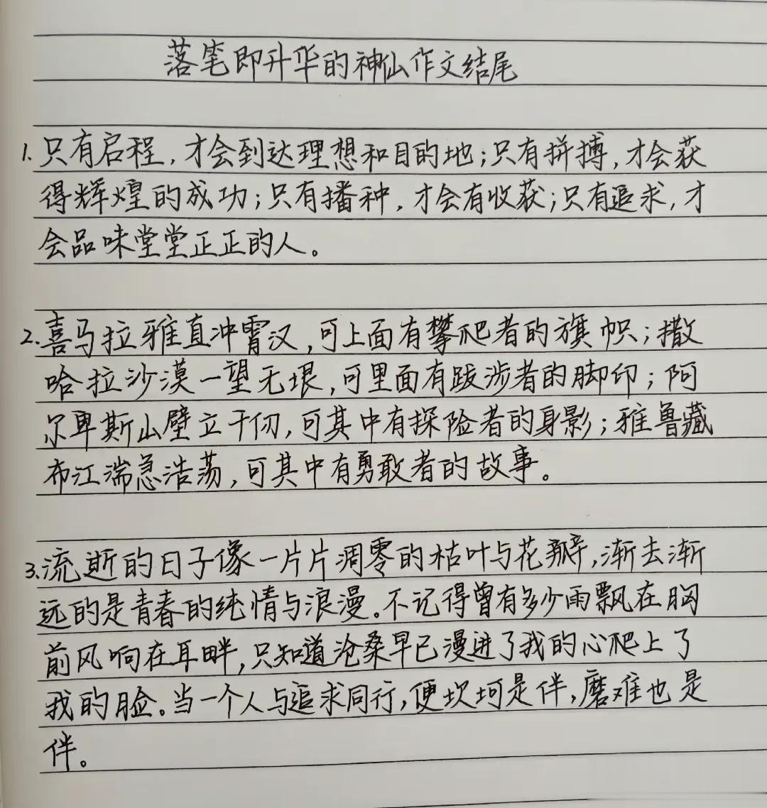 “太惊艳了!”那些落笔就是绝美的作文万能开头和结尾,百用不腻,瞬间惊艳阅卷老师!不愧是学霸积累下来的,家有孩子的赶紧收藏学习!如果能背一背的话,引用到作文里,肯定是高分之作。 代替“记得有1天”的高级句子 拉开时间的帷幕,盛夏仍然蝉鸣不止.寒冬仍然白雪漫天,眼前是过去的青春,是如烟的岁月,是我的从前。 晚风拂过山岗,撞到充满回忆的夕阳瓶,把我拉回记忆中的那一天。 作文不要再写“记得有一次”了 你可以这样写: 往事如烟,飘然而过,时间的风吹散了岁月的记忆,但永远吹不散这一件久记于心的事。 时光如白驹过隙,虽然那段经历已在时间的长河里流逝,但它如同一杯历久弥新的美酒。时时散发出芳香,并在我心底永存。 句句不提“雨”,如何描写雨很大? 城市拥抱朦胧,街上的行人被薄雾渲染,玻璃上的倒影即使被打碎,也依旧是那么美。 …… 作文开头结尾佳句