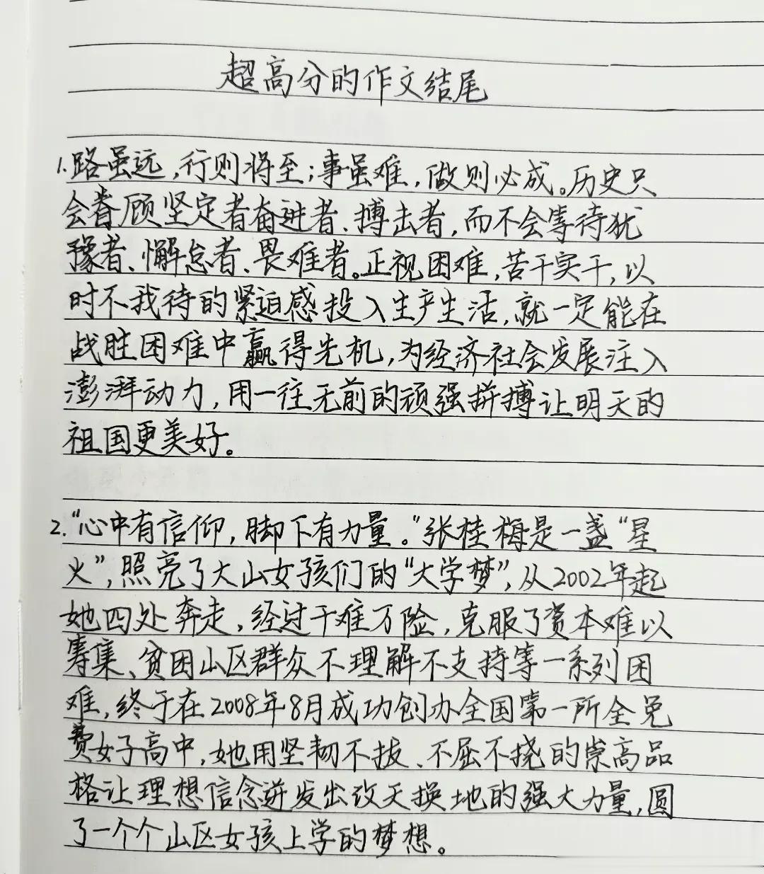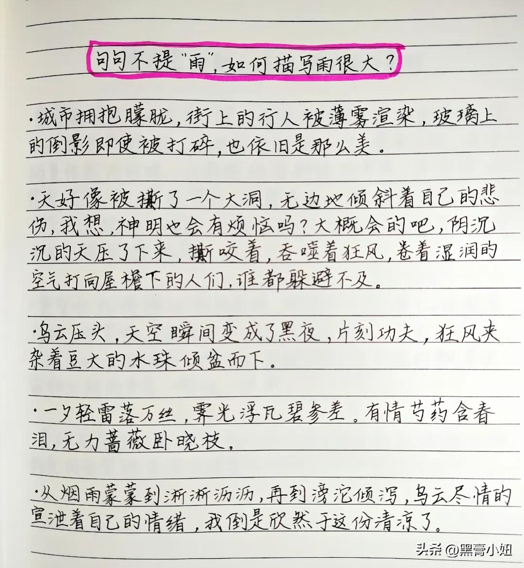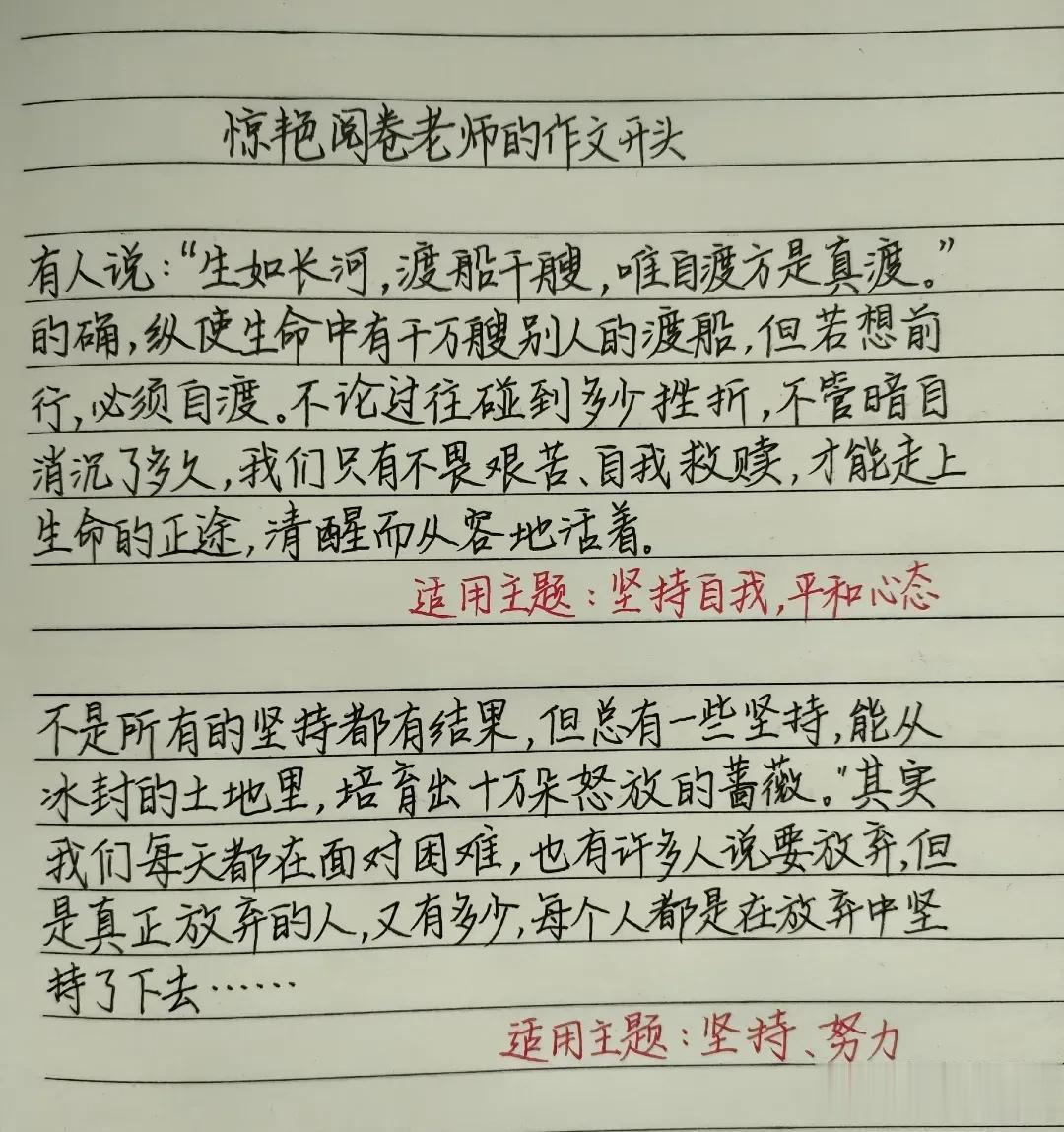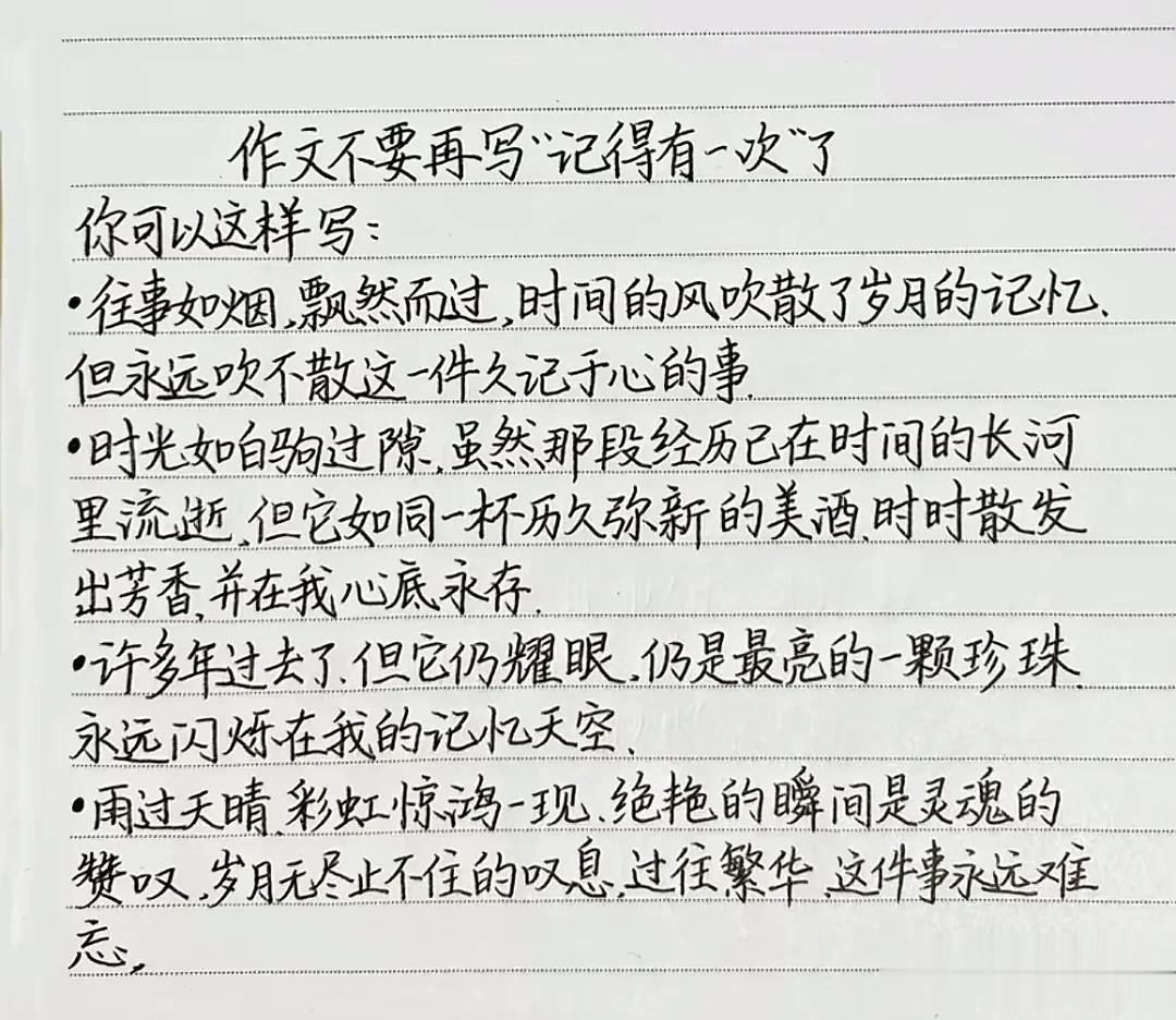“太惊艳了!”那些落笔就是绝美的作文万能开头和结尾,百用不腻,瞬间惊艳阅卷老师!不愧是学霸积累下来的,家有孩子的赶紧收藏学习!如果能背一背的话,引用到作文里,肯定是高分之作。 代替“记得有1天”的高级句子 拉开时间的帷幕,盛夏仍然蝉鸣不止.寒冬仍然白雪漫天,眼前是过去的青春,是如烟的岁月,是我的从前。 晚风拂过山岗,撞到充满回忆的夕阳瓶,把我拉回记忆中的那一天。 作文不要再写“记得有一次”了 你可以这样写: 往事如烟,飘然而过,时间的风吹散了岁月的记忆,但永远吹不散这一件久记于心的事。 时光如白驹过隙,虽然那段经历已在时间的长河里流逝,但它如同一杯历久弥新的美酒。时时散发出芳香,并在我心底永存。 句句不提“雨”,如何描写雨很大? 城市拥抱朦胧,街上的行人被薄雾渲染,玻璃上的倒影即使被打碎,也依旧是那么美。 …… 作文开头结尾佳句