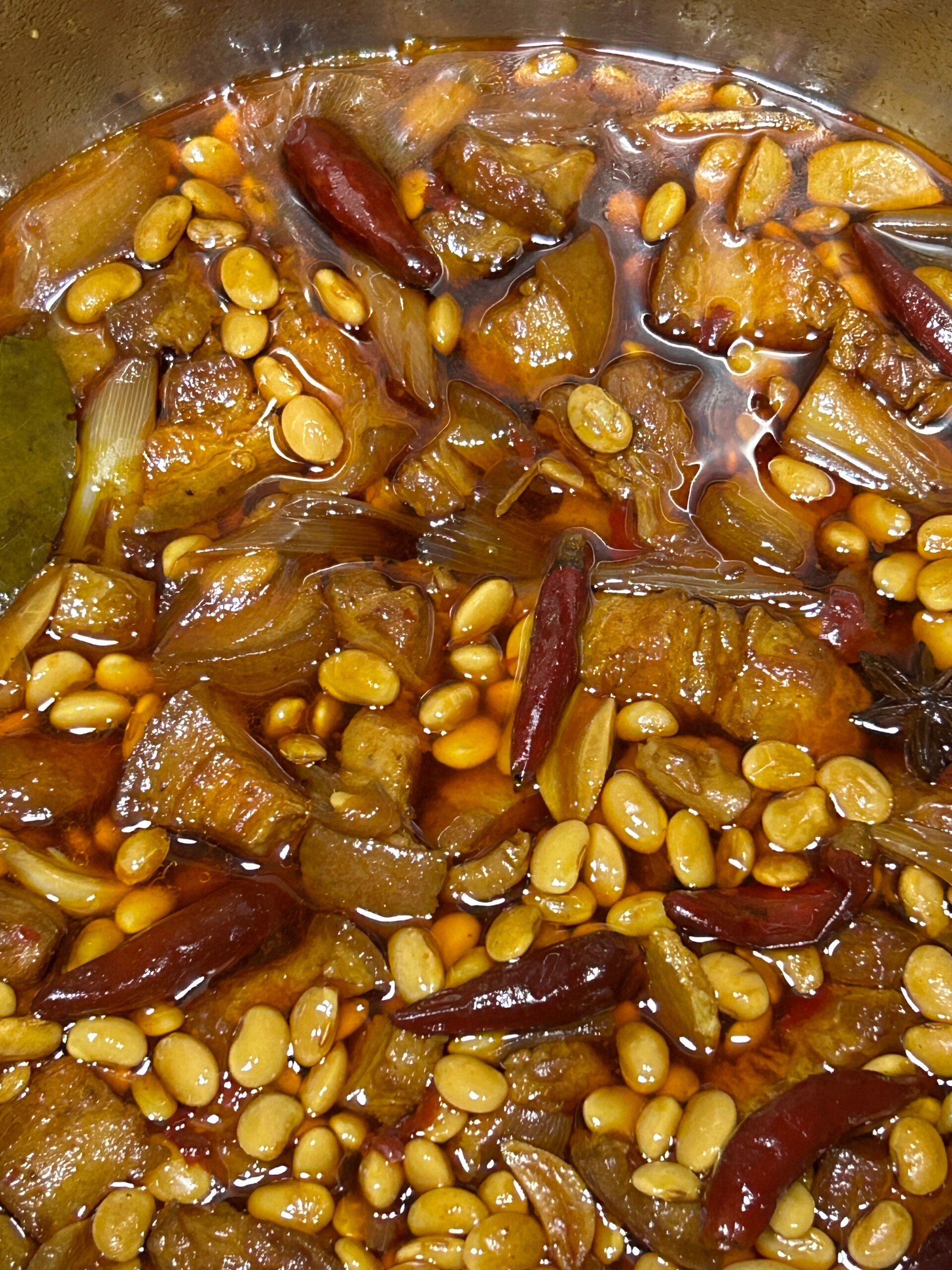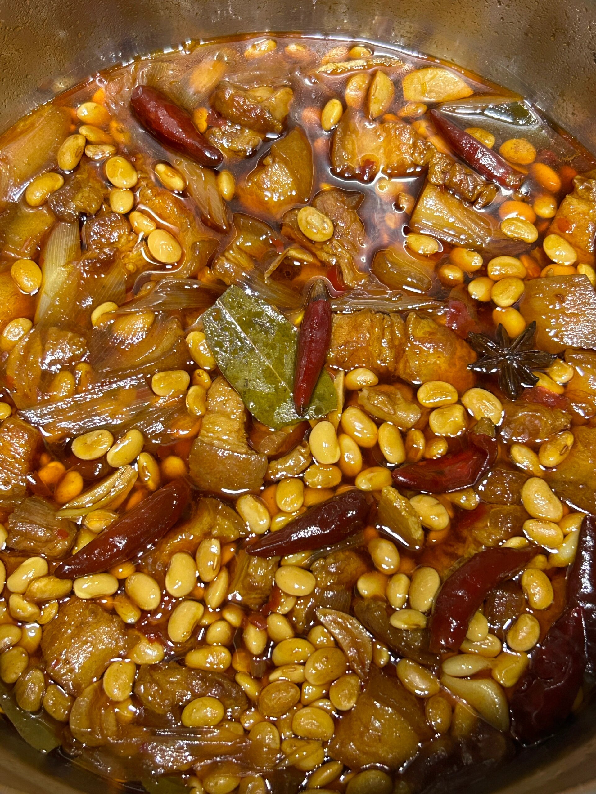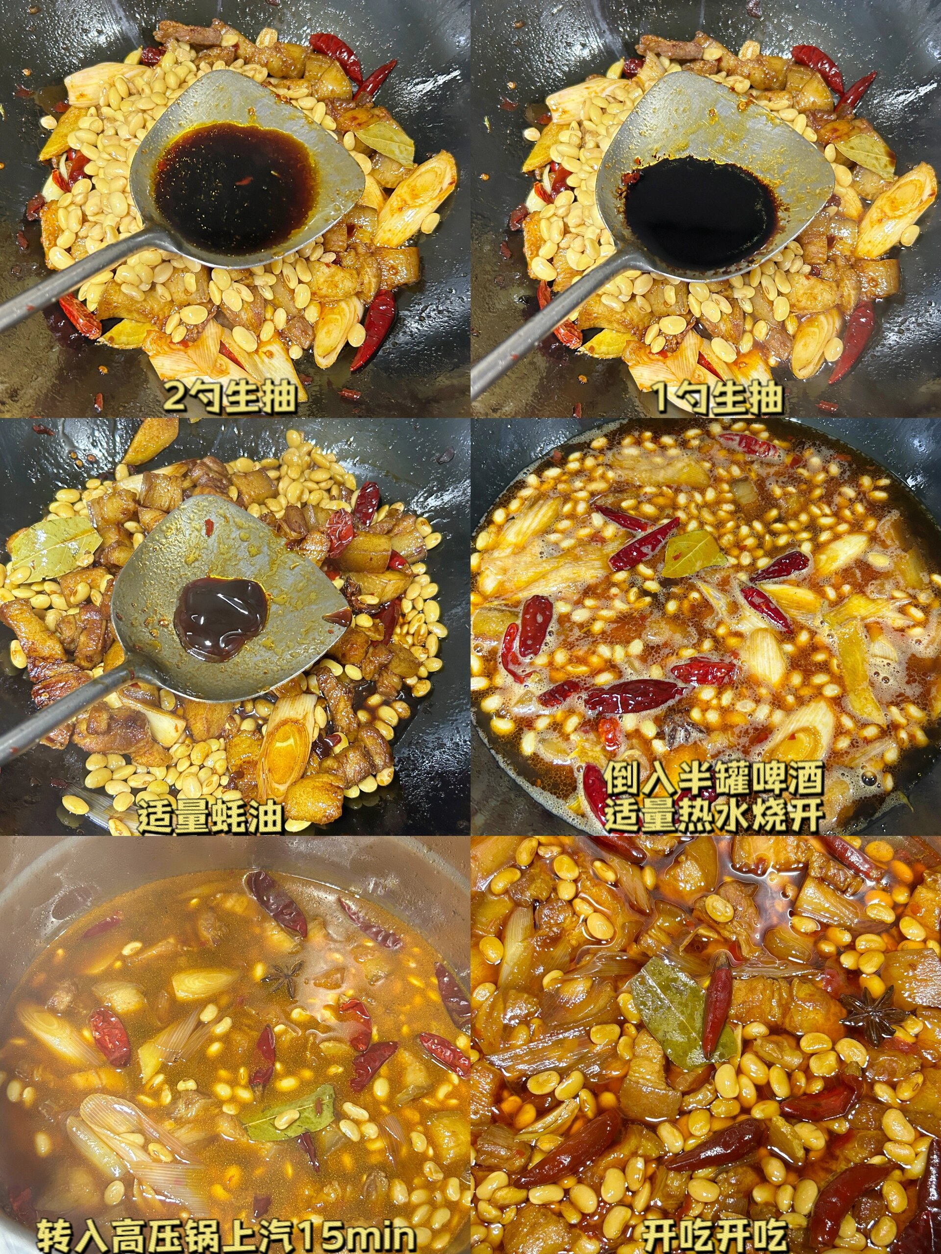 黄豆红烧肉,肥而不腻超级下饭 软糯咸甜、肥而不腻、入口即化的五花肉,嘎嘎香! 超有味的汤汁泡上米饭,馋哭了 食材:五花肉、黄豆、葱、姜、蒜、干辣椒、豆瓣酱、八角、香叶 做法:1、黄豆提前用温水泡发,五花肉洗净切块冷水下锅,放入葱姜料酒焯水,焯好后撇去浮沫热水冲洗沥干备用 2、锅中少油放入五花肉煸出油脂盛出备用 3、将多余的油盛出,留少量油放入冰糖小火炒化 4、放入五花肉翻炒均匀裹上糖色,倒入葱姜干辣椒,1勺豆瓣酱翻炒 5、放入八角、香叶,倒入黄豆翻炒 6、2勺生抽、1勺老抽、适量蚝油,倒入半罐啤酒、适量热水煮开后,再倒入高压锅上汽后压15min