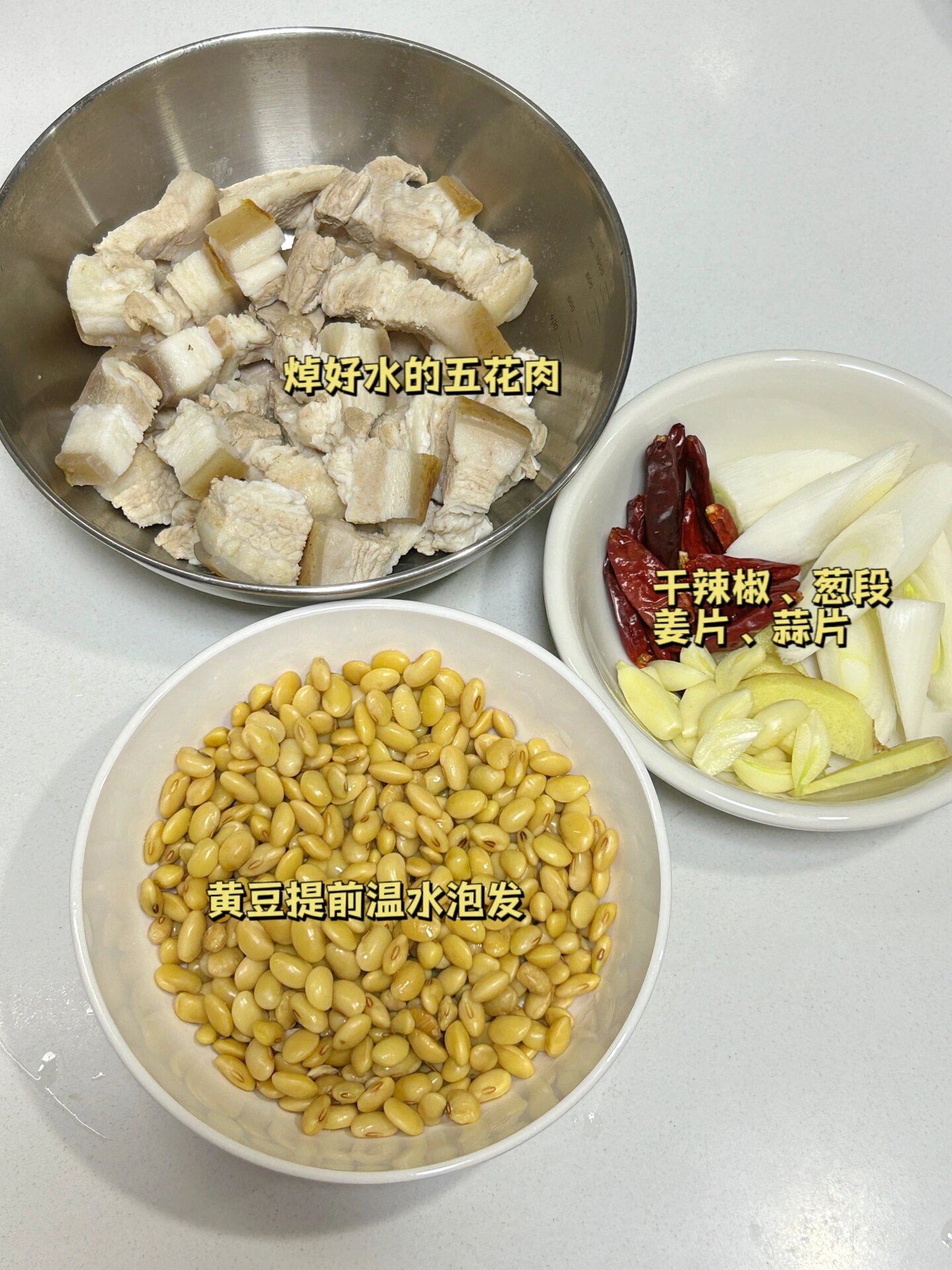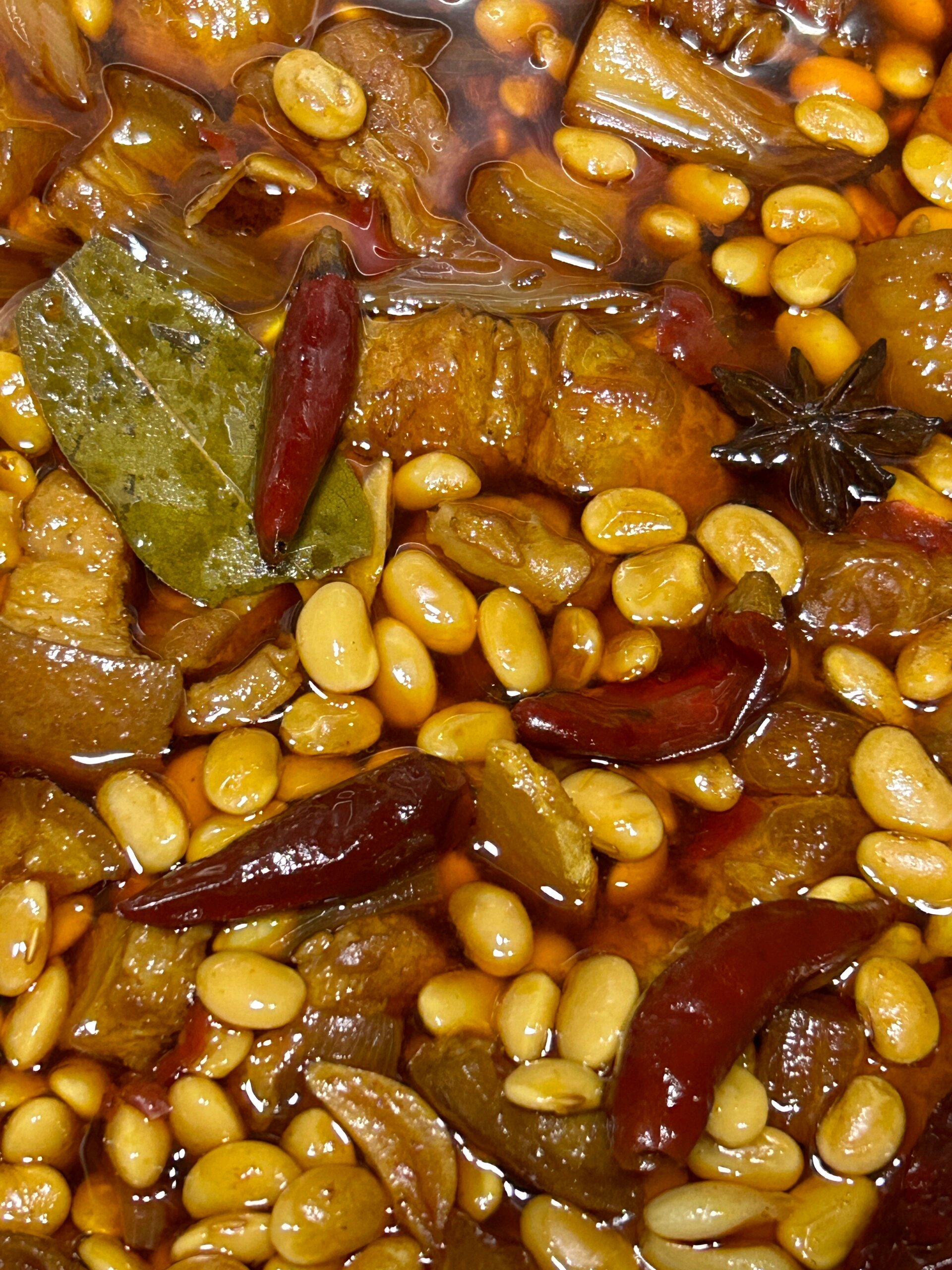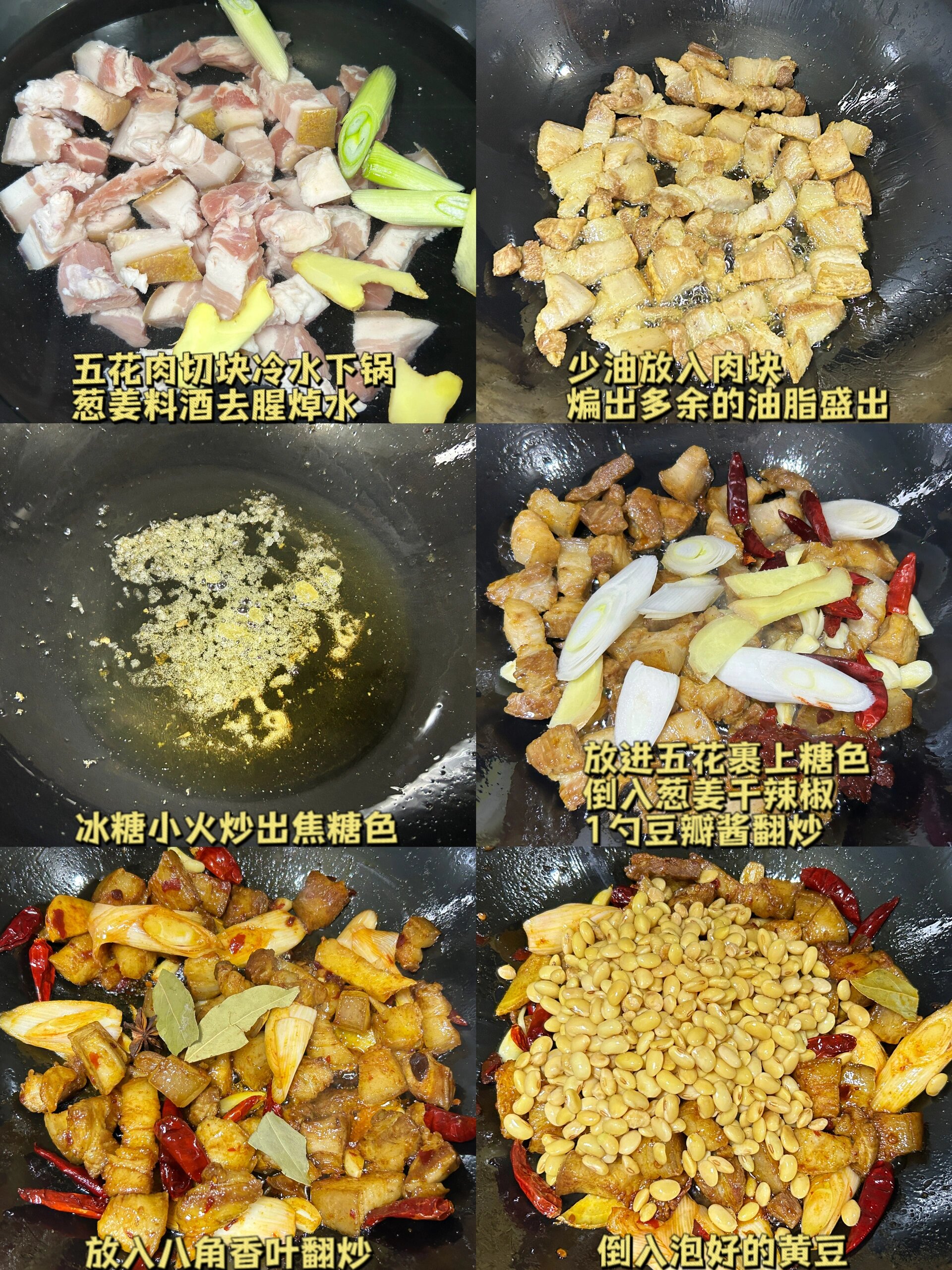 黄豆红烧肉,肥而不腻超级下饭 软糯咸甜、肥而不腻、入口即化的五花肉,嘎嘎香! 超有味的汤汁泡上米饭,馋哭了 食材:五花肉、黄豆、葱、姜、蒜、干辣椒、豆瓣酱、八角、香叶 做法:1、黄豆提前用温水泡发,五花肉洗净切块冷水下锅,放入葱姜料酒焯水,焯好后撇去浮沫热水冲洗沥干备用 2、锅中少油放入五花肉煸出油脂盛出备用 3、将多余的油盛出,留少量油放入冰糖小火炒化 4、放入五花肉翻炒均匀裹上糖色,倒入葱姜干辣椒,1勺豆瓣酱翻炒 5、放入八角、香叶,倒入黄豆翻炒 6、2勺生抽、1勺老抽、适量蚝油,倒入半罐啤酒、适量热水煮开后,再倒入高压锅上汽后压15min