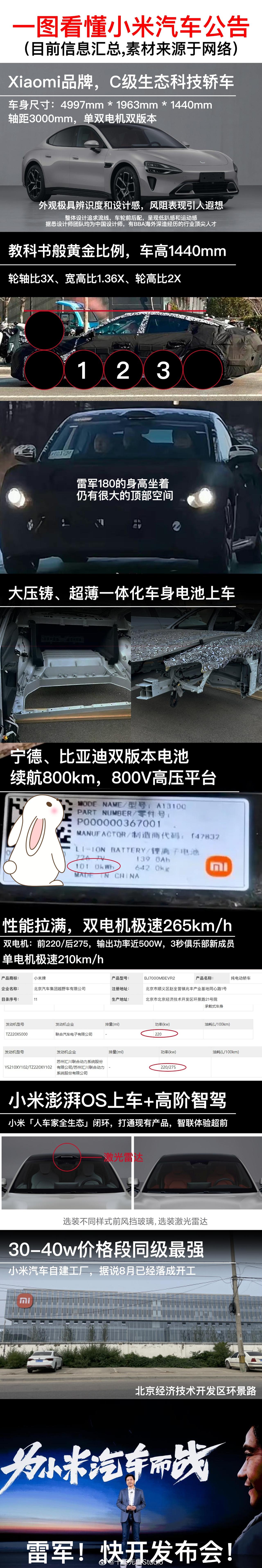 拒绝PPT,小米汽车申报图曝光,大家给这个外观设计打几分? 从整体外观设计上看,小米汽车选用流线型设计,走的是运动风格,教科书般的黄金比例,带来宽敞的车内空间,听说雷总180大个子坐在里面顶部还会有很大空间,双拼色的轮毂设计,时尚且美观,顶端激光雷达方案,让汽车在智能避让方面更加游刃有余,安全性更强,主动升降的尾翼成为全系标配真的是泰裤辣。 小米汽车将内置宁德、比亚迪双版本电池,大压铸、超薄车身一体化电池,将会带来800km的超长续航,800V高压平台,更是让你体验快充的乐趣,让你没有电量焦虑;双电机配置,让最大车速达到265km/h,让你上演现实版的速度与激情。 小米汽车最亮眼的特点无疑是搭载小米澎湃OS,智能座舱、智慧大屏这些人机交互自然不会缺席,到底如何实现人车家的互联互通让我们拭目以待吧! 另外,有消息称小米汽车首款车型命名为SU7,会分为Pro和Max两个版本,最高配置将达到40W,大家觉得这个价格如何?是否愿意为雷总最后一次押上一生的荣誉的创业梦买一单呢? #小米汽车申报图曝光# #小米汽车拿到工信部准生证#