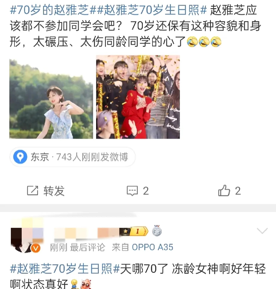 网友们看后纷纷评论道: 竟然都70岁了吗?看着状态也就40岁,生日快乐! 赵雅芝应该都不参加同学会吧? 70岁还保有这种容貌和身形,太碾压、太伤同龄同学的心了。 状态也太好了吧?这谁能说她70岁了? 我的天 一点都不像70岁,好美好美。