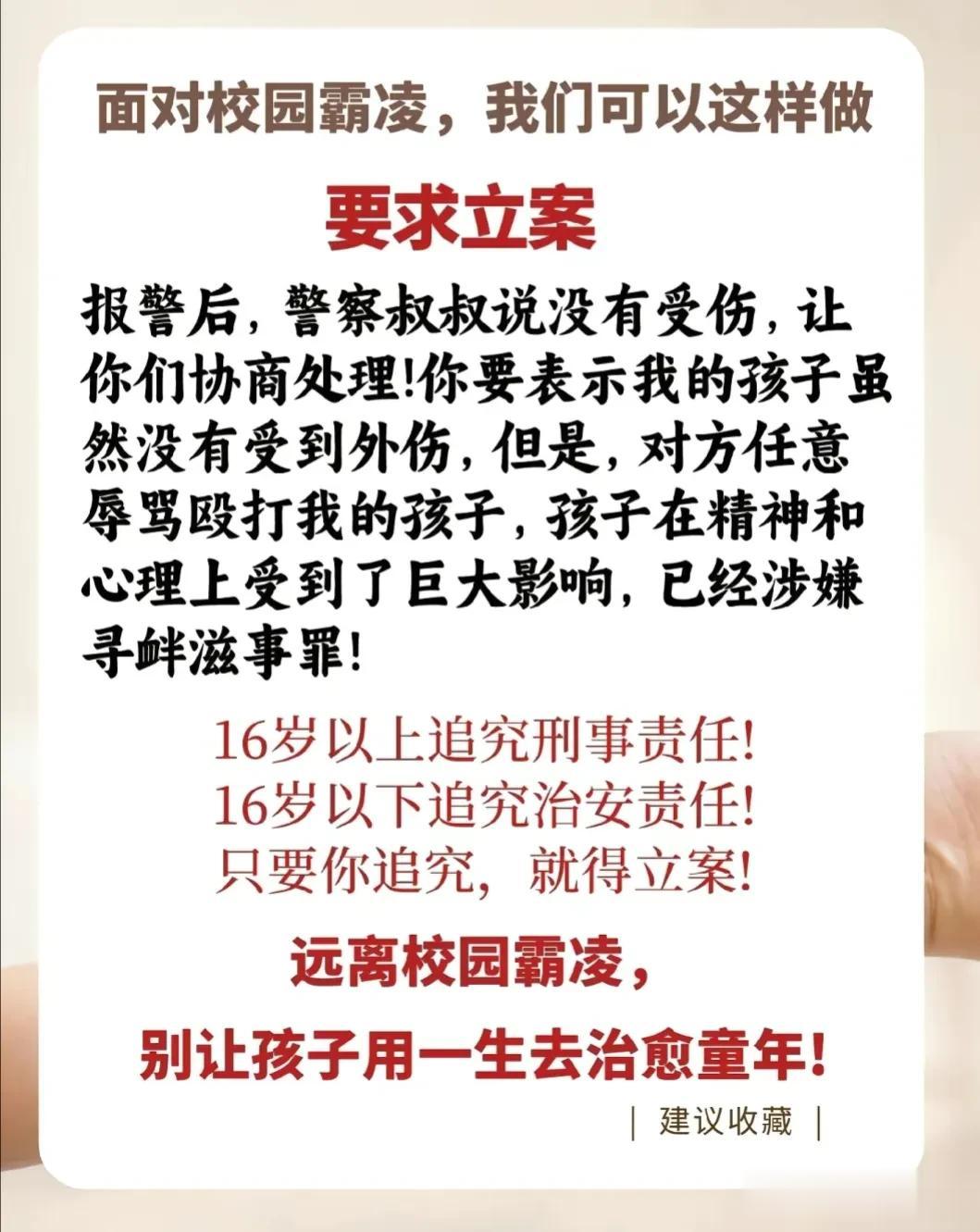 别让孩子用一生去治愈童年!面对校园霸凌,告诉你的孩子,解决校园霸凌事件最好的办法,不是息事宁人,也不是去找老师,而是拿起电话直接找警察。 16岁以上追究刑事责任! 16岁以下追究治安责任! 只要你追究,就得立案!#记录我的2023#