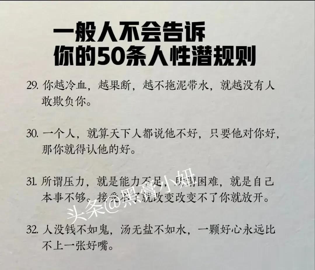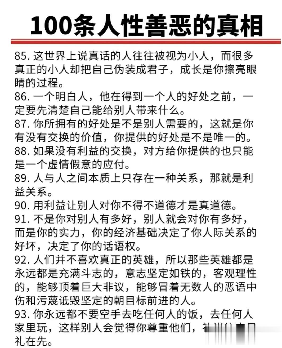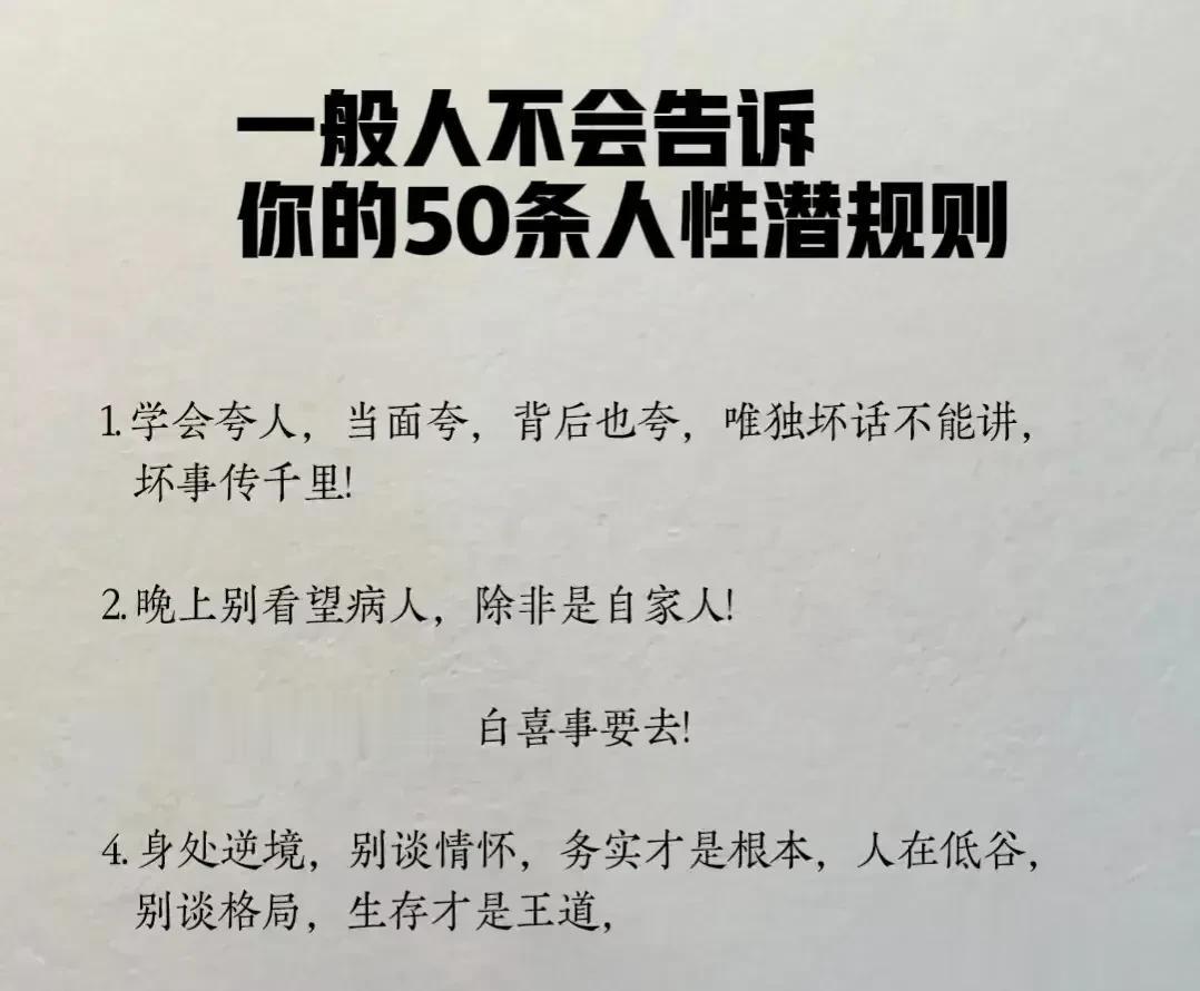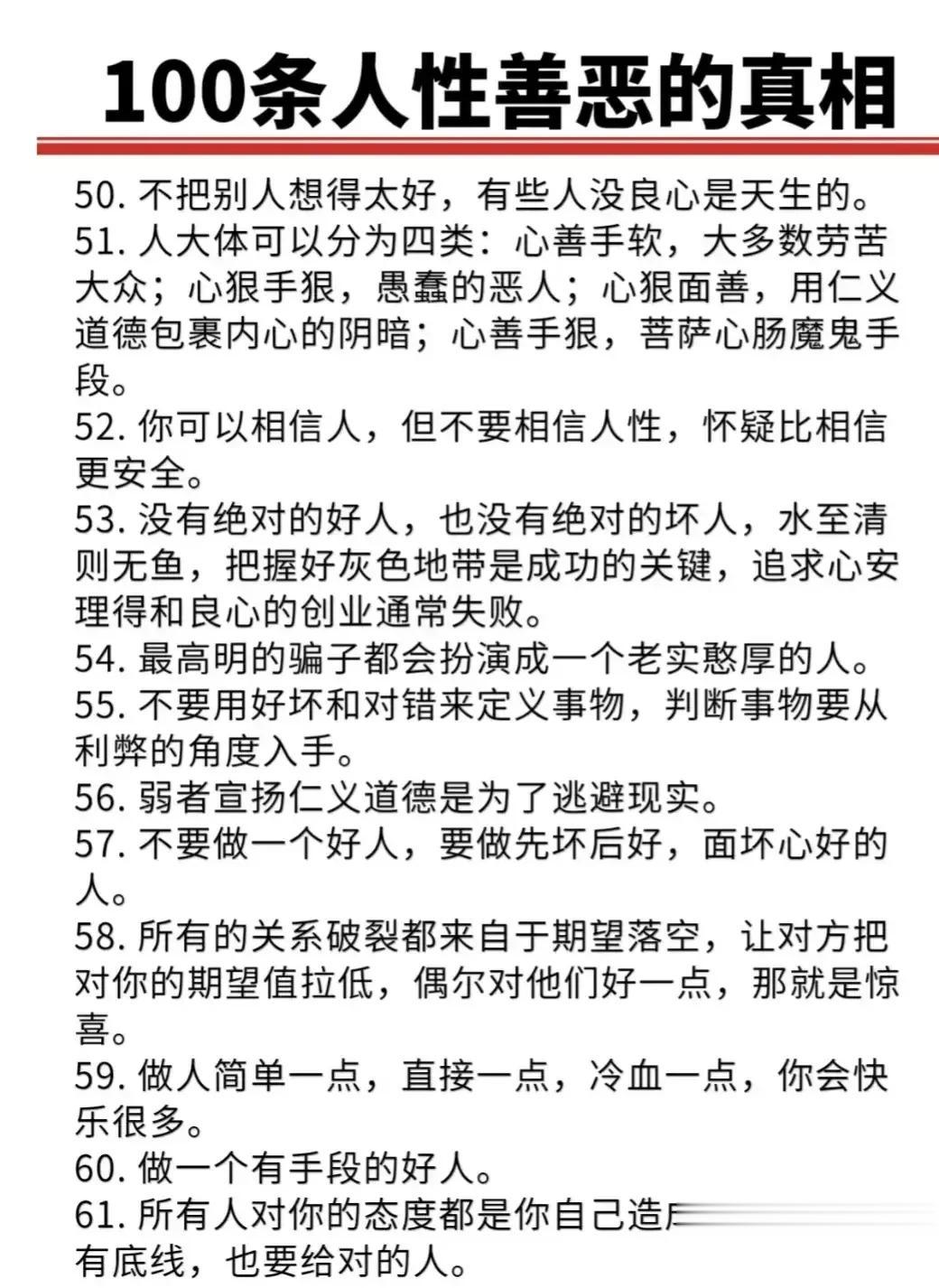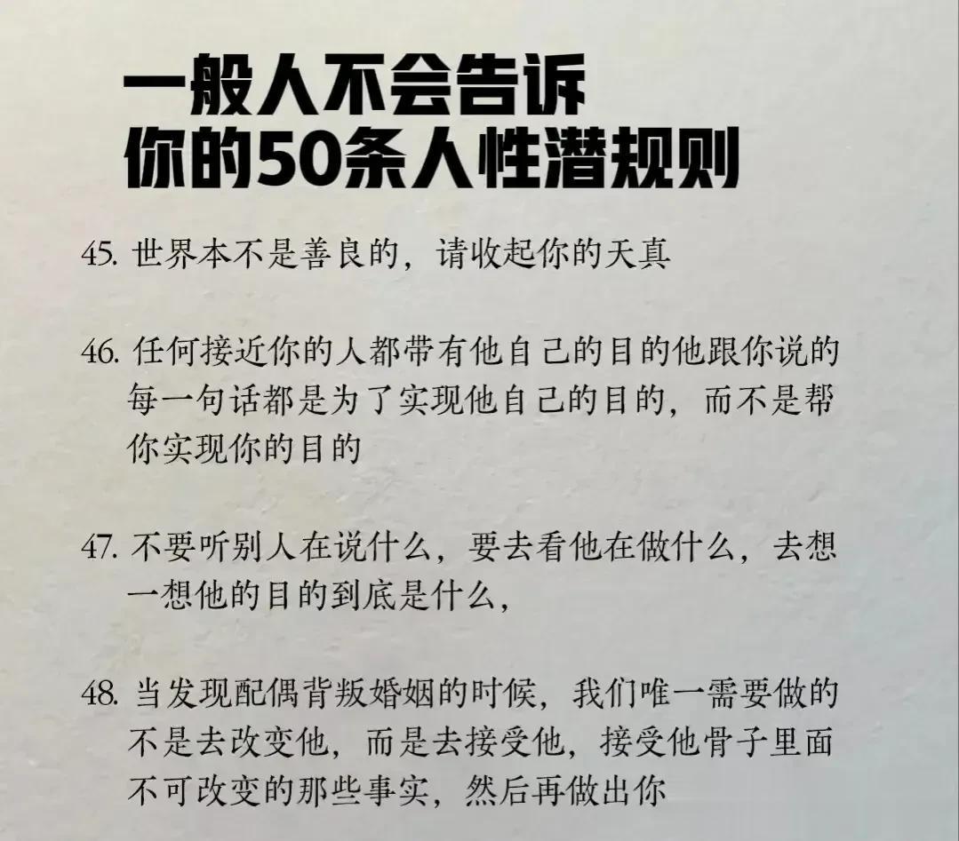“精辟”!!人性的100条善恶真相,50条人性潜规则,一般人不会告诉你的!真正的高手,早就看透了人性,了解人心!想出人头地,就要读懂人性,或许厚黑,但若你不理解的话,就很容易吃亏! 比如不要相信任何人,利益越大的地方,人性就越自私。 太重感情的人,日子终究不会好过,信任依赖念旧,分分钟让你万劫不复。 家庭的核心不是感情而是经济,没钱你这个人就不重要,用钱讲感情。 女人魅力不够,她才觉得男人花心,男人实力太差,才会觉得女人现实。 大多数的灾难都是交友不慎带来的,想进步就要破层,放弃低质量的人际关系。 …… 通人性者通幸福,没事多看一看,提升认知,会让你少走弯路少吃亏! 这就是人性读懂人性
