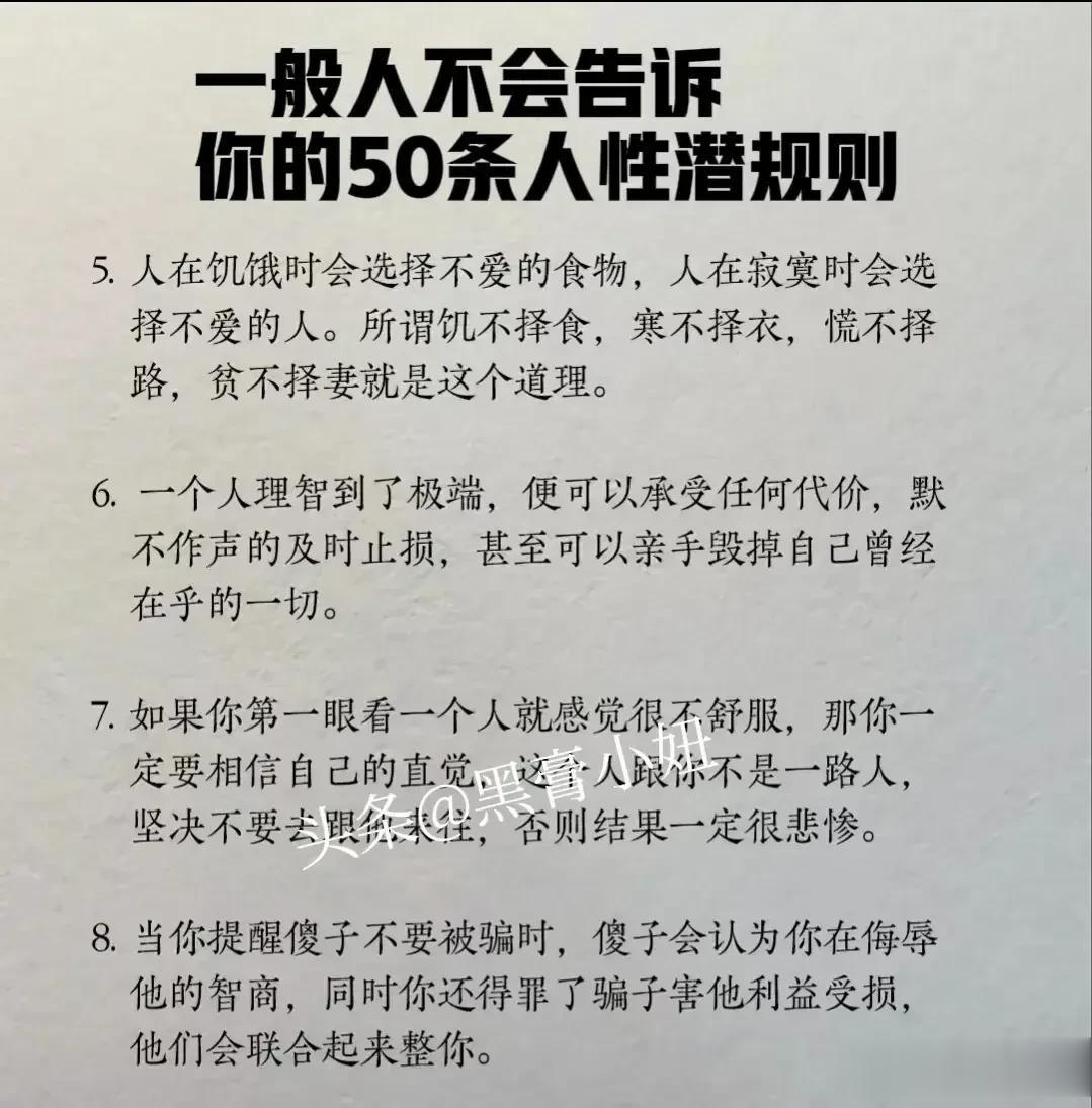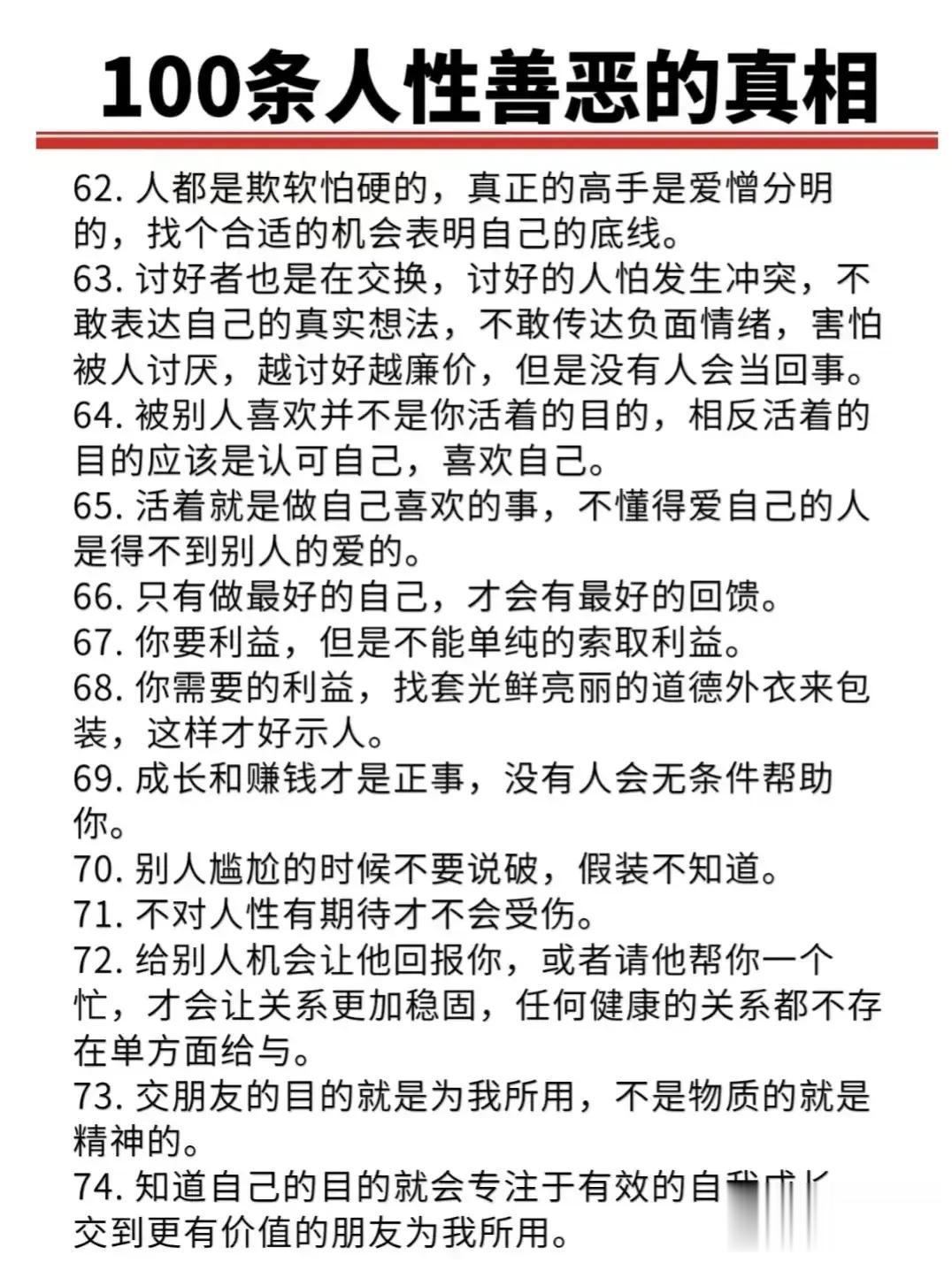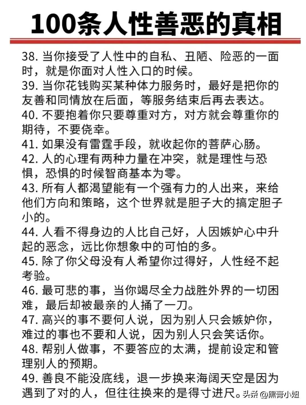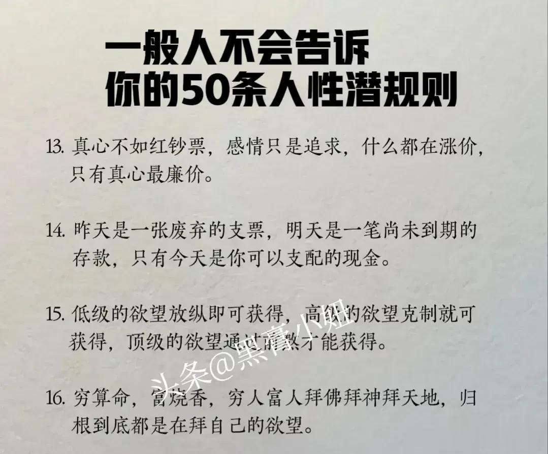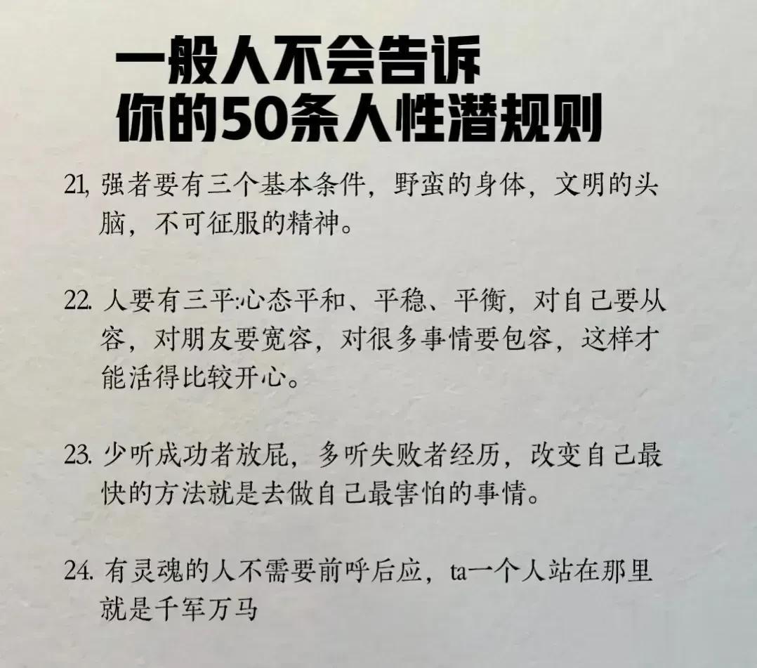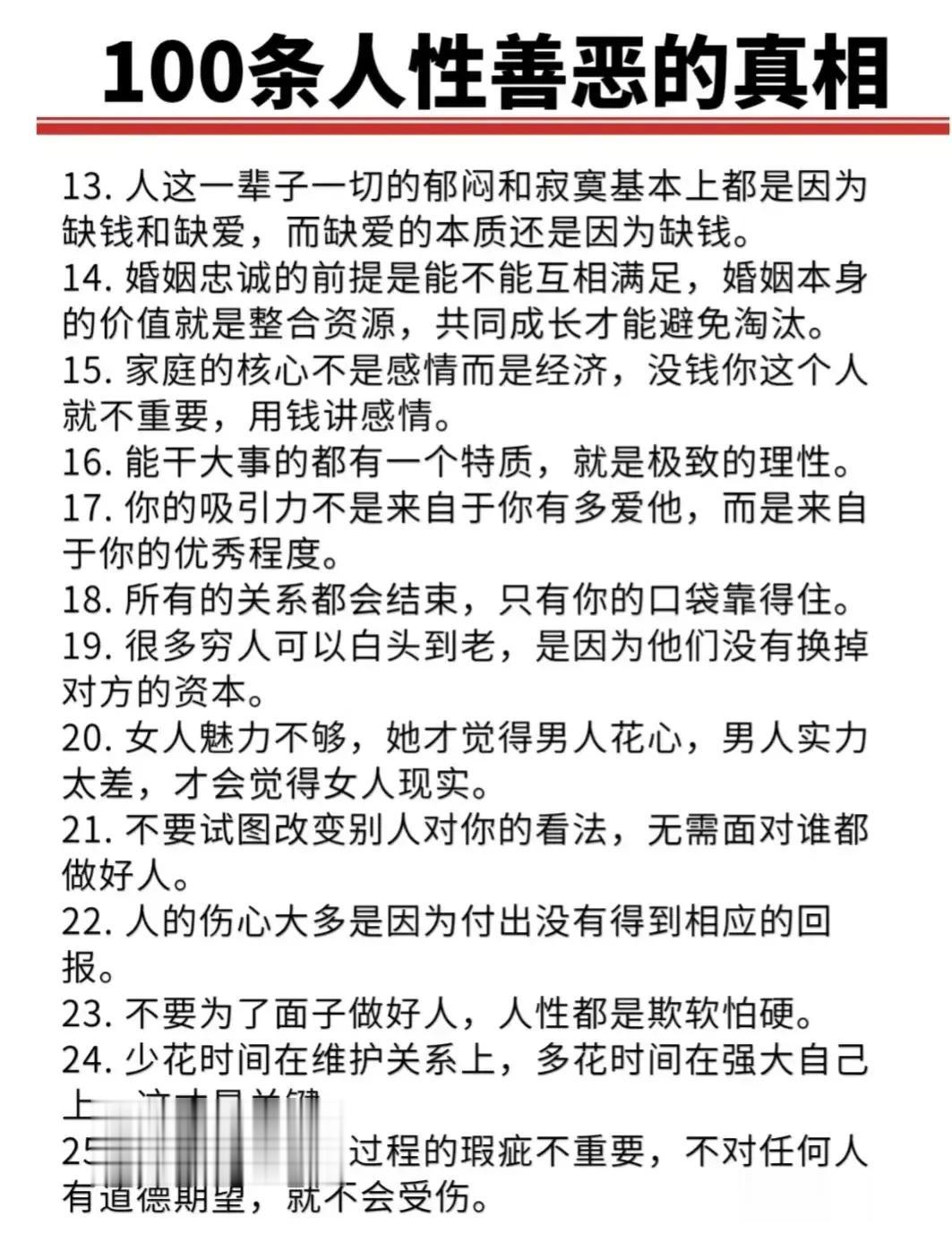 “精辟”!!人性的100条善恶真相,50条人性潜规则,一般人不会告诉你的!真正的高手,早就看透了人性,了解人心!想出人头地,就要读懂人性,或许厚黑,但若你不理解的话,就很容易吃亏! 比如不要相信任何人,利益越大的地方,人性就越自私。 太重感情的人,日子终究不会好过,信任依赖念旧,分分钟让你万劫不复。 家庭的核心不是感情而是经济,没钱你这个人就不重要,用钱讲感情。 女人魅力不够,她才觉得男人花心,男人实力太差,才会觉得女人现实。 大多数的灾难都是交友不慎带来的,想进步就要破层,放弃低质量的人际关系。 …… 通人性者通幸福,没事多看一看,提升认知,会让你少走弯路少吃亏! 这就是人性读懂人性