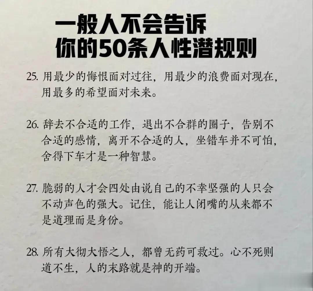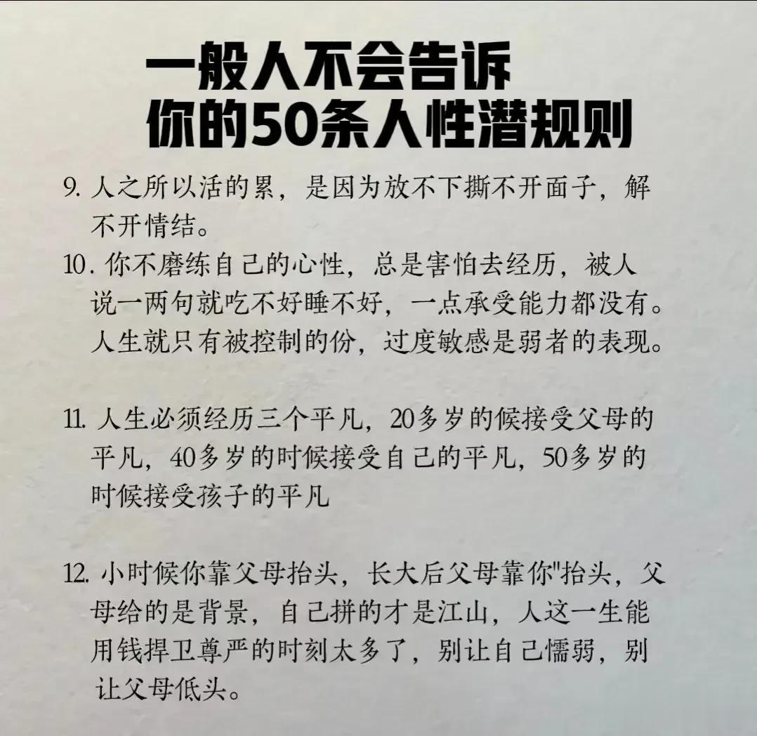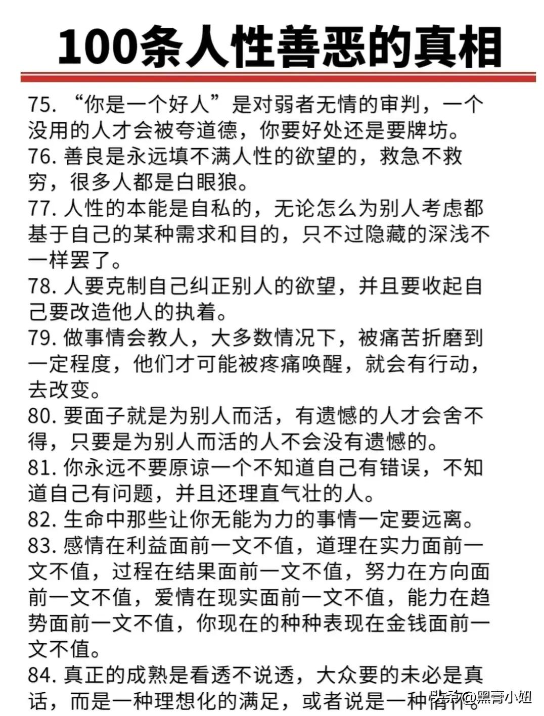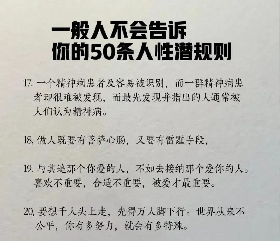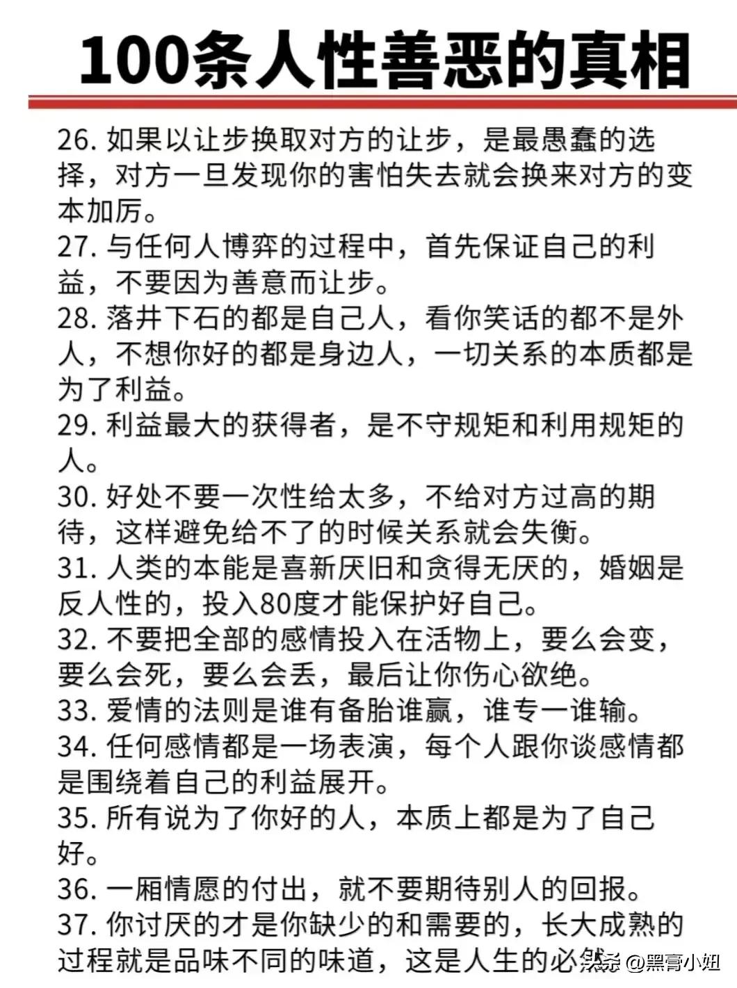 “精辟”!!人性的100条善恶真相,50条人性潜规则,一般人不会告诉你的!真正的高手,早就看透了人性,了解人心!想出人头地,就要读懂人性,或许厚黑,但若你不理解的话,就很容易吃亏! 比如不要相信任何人,利益越大的地方,人性就越自私。 太重感情的人,日子终究不会好过,信任依赖念旧,分分钟让你万劫不复。 家庭的核心不是感情而是经济,没钱你这个人就不重要,用钱讲感情。 女人魅力不够,她才觉得男人花心,男人实力太差,才会觉得女人现实。 大多数的灾难都是交友不慎带来的,想进步就要破层,放弃低质量的人际关系。 …… 通人性者通幸福,没事多看一看,提升认知,会让你少走弯路少吃亏! 这就是人性读懂人性