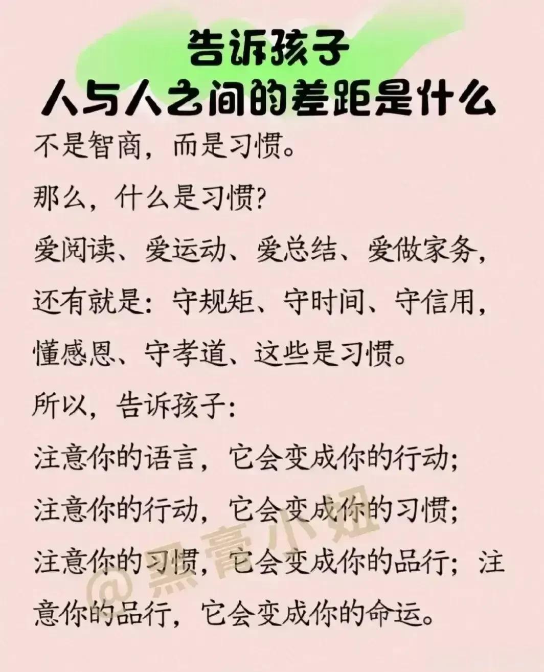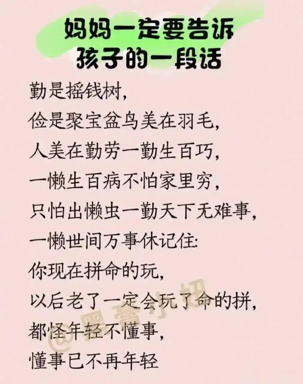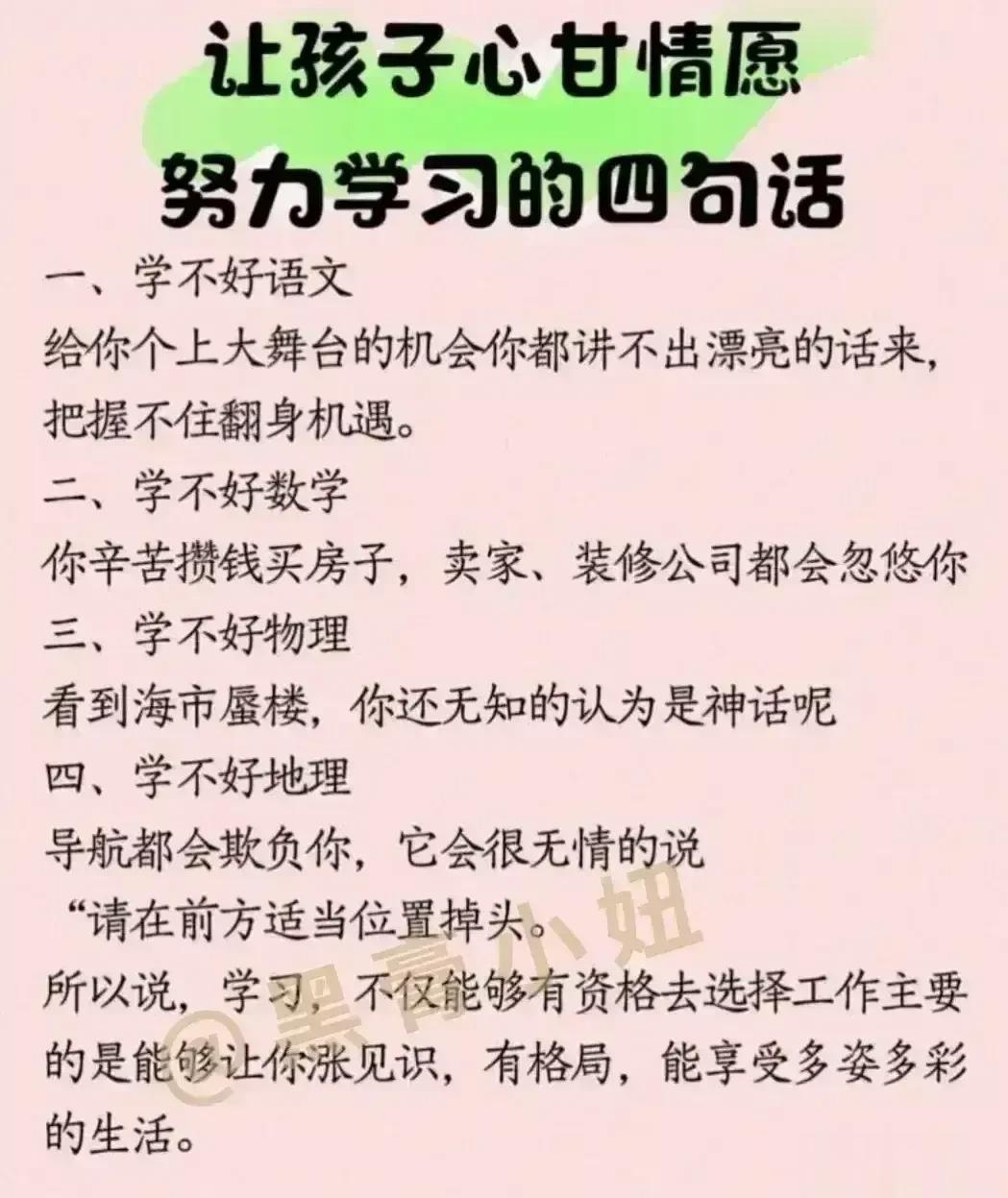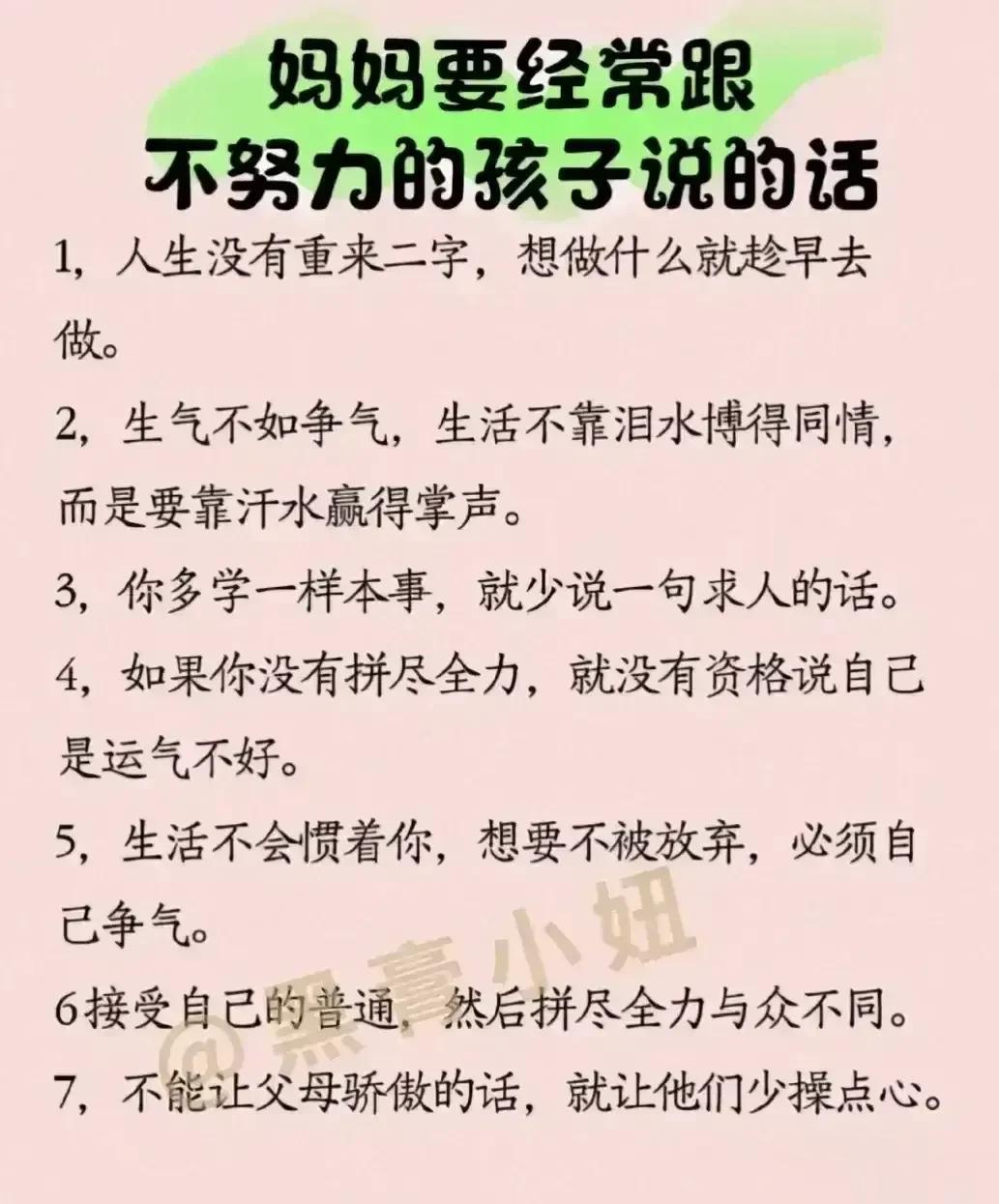 “太精辟了!!”无论儿女多大,父母要经常把这些话讲给孩子听,胜过千万房产和存款,不愧是清华博士妈妈的教育心得。看完之后,不得不说,原来父母对孩子的每一句都至关重要,能影响该子的三观,甚至一生,家有孩子的赶紧收藏保存下来,没事多在孩子耳边叨叨,能提升孩子的情商,为人处世,以及学习能力! 父母话术亲子沟通技巧