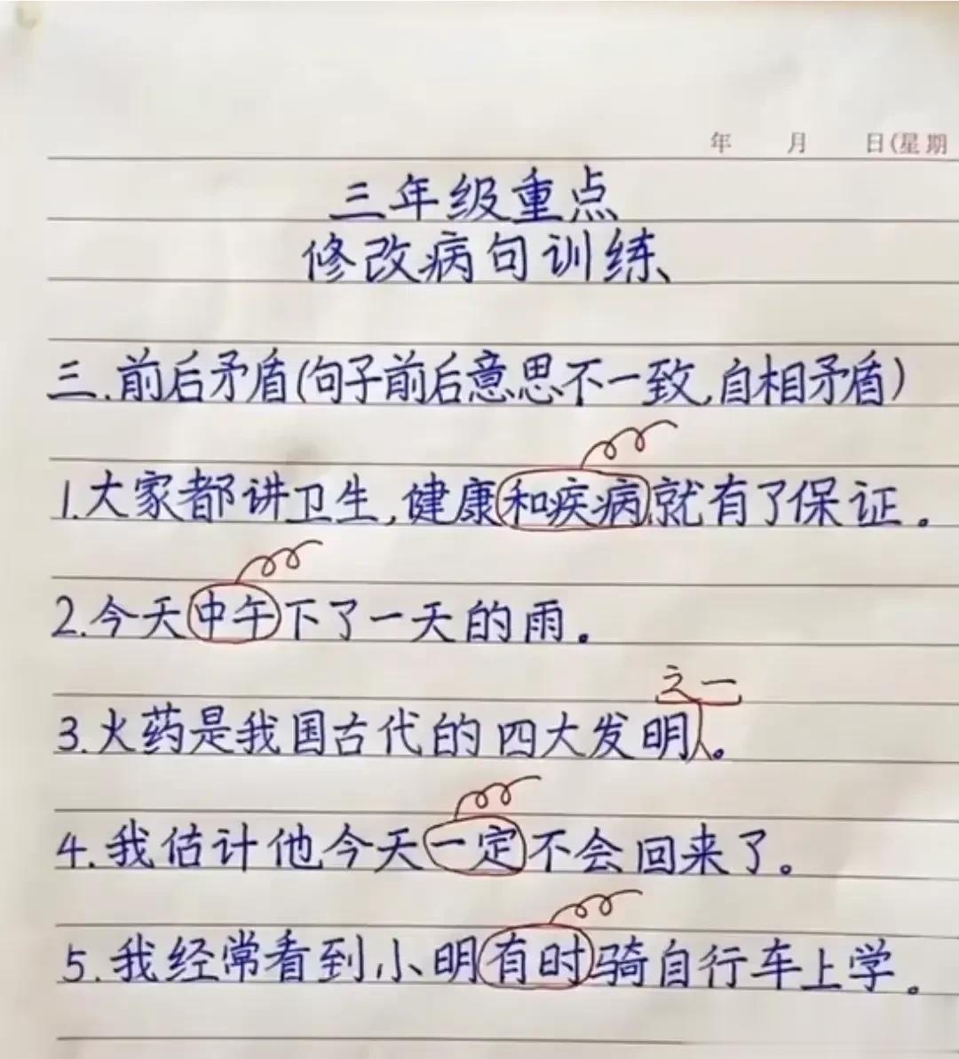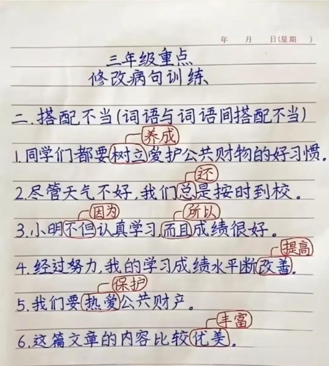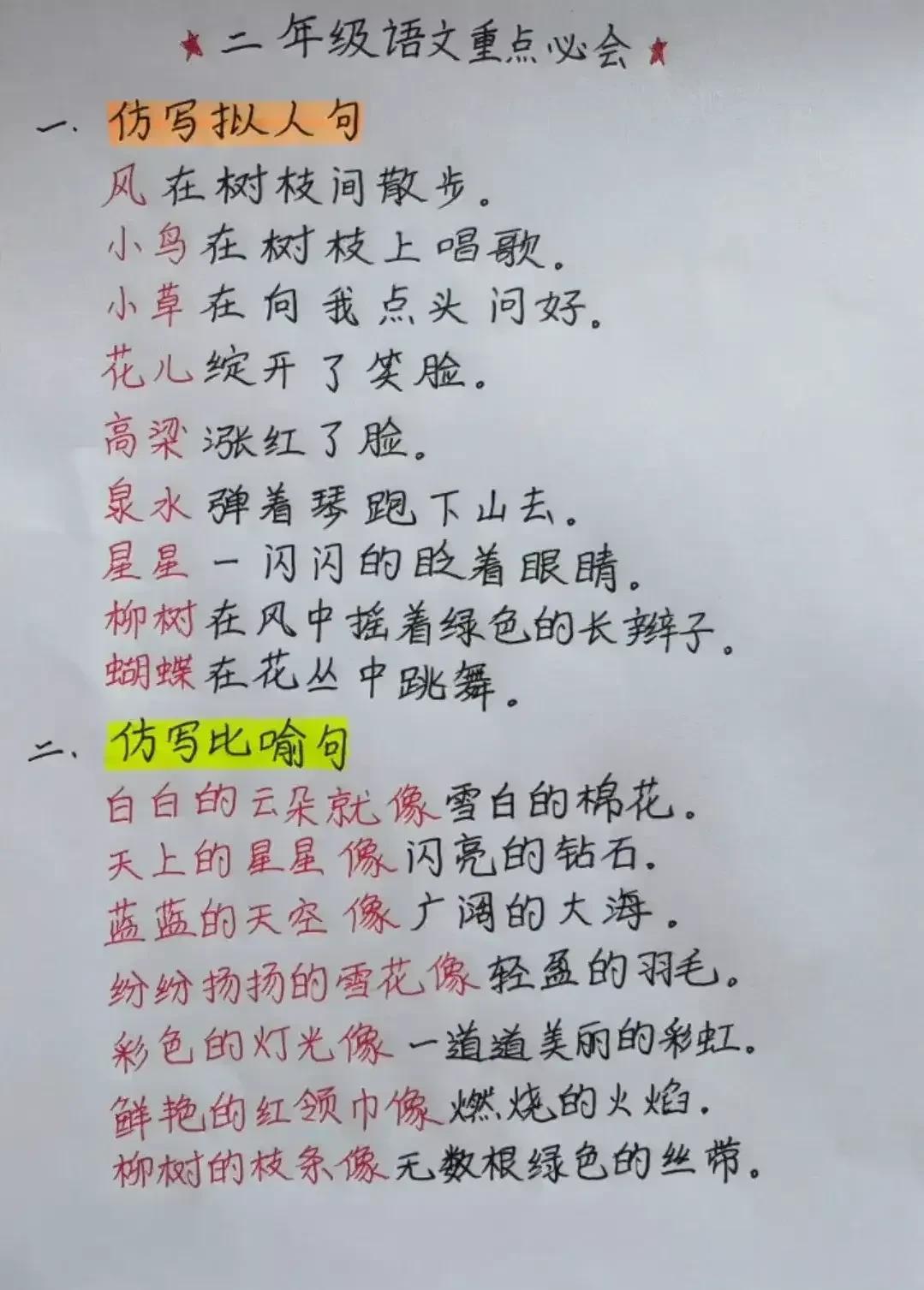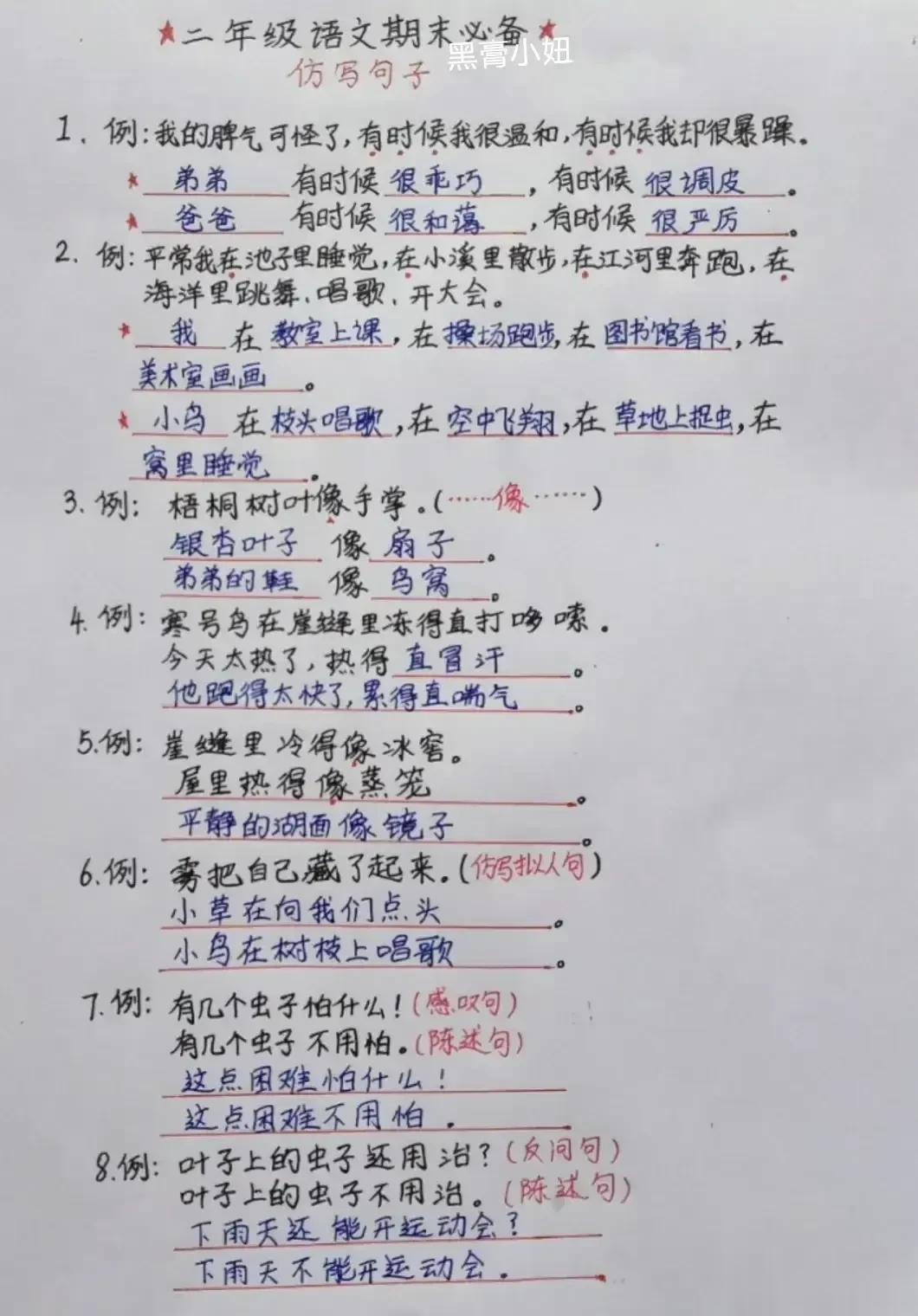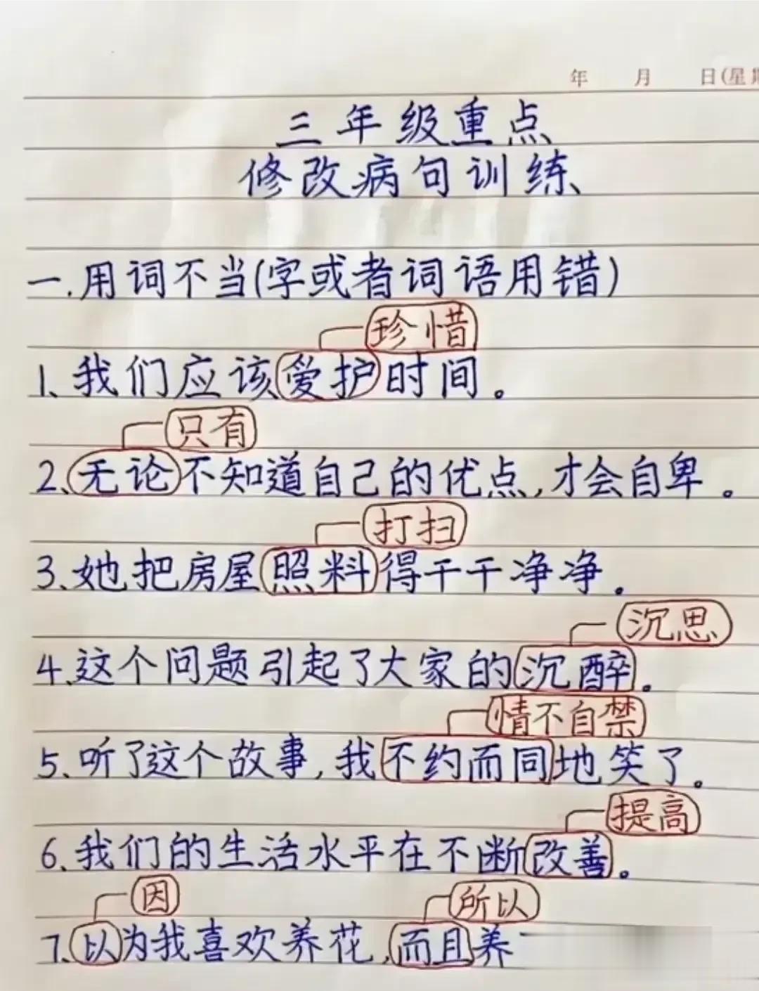 “太卷了”!第一次见到这么用心的孩子,看完这份笔记,简直太惊艳了!一二年就开始语文就不断仿写,提升写话水平。三四年级掌握修改病句技巧,打牢基础!这样扎实的基础,孩子到高年级成绩想不拿高分都难!家有孩子的赶紧保存,没事看一看,练一练,考试拿高分! 语文基础句式训练大全