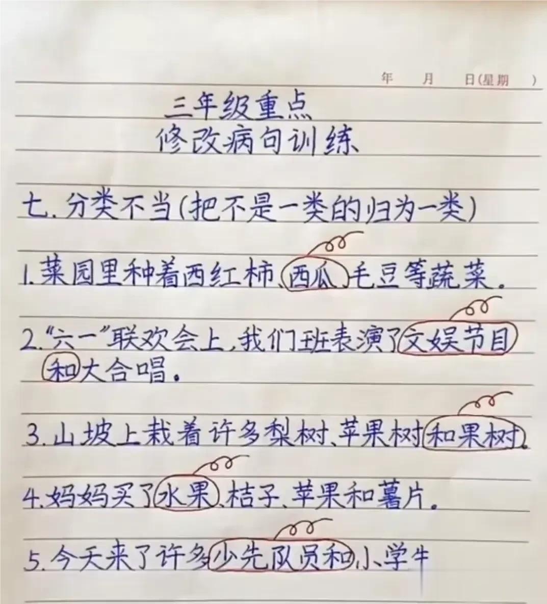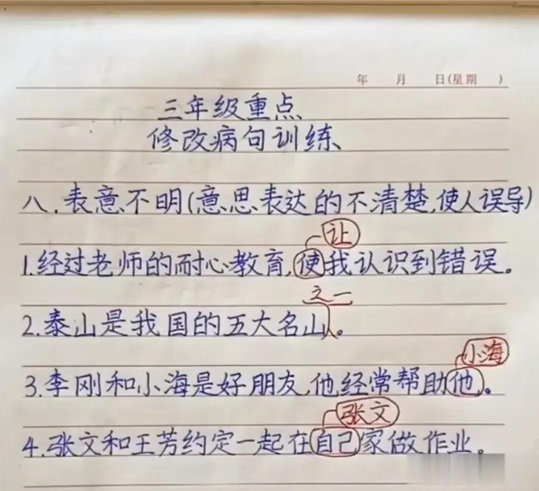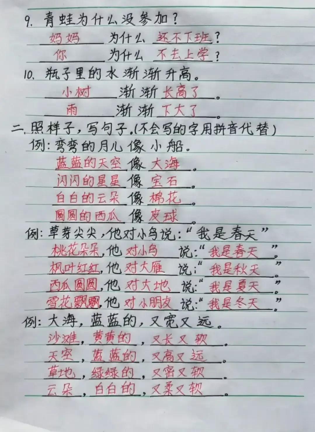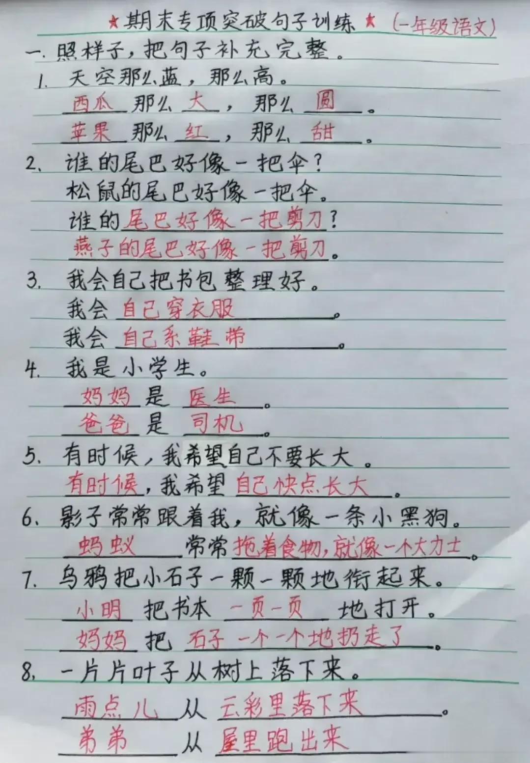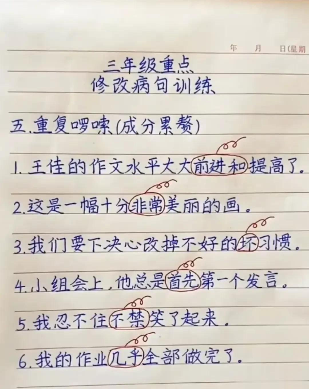 “太卷了”!第一次见到这么用心的孩子,看完这份笔记,简直太惊艳了!一二年就开始语文就不断仿写,提升写话水平。三四年级掌握修改病句技巧,打牢基础!这样扎实的基础,孩子到高年级成绩想不拿高分都难!家有孩子的赶紧保存,没事看一看,练一练,考试拿高分! 语文基础句式训练大全