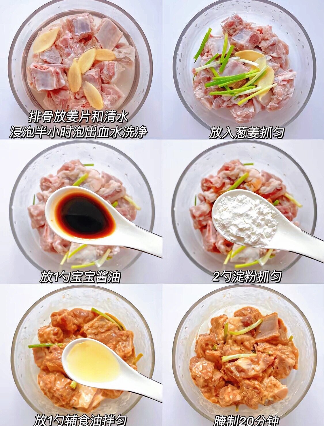 1、将排骨放入姜片和清水中浸泡半小时,以去除血水。然后洗净排骨,放入葱姜抓匀,再加入一勺酱油和两勺淀粉抓匀。