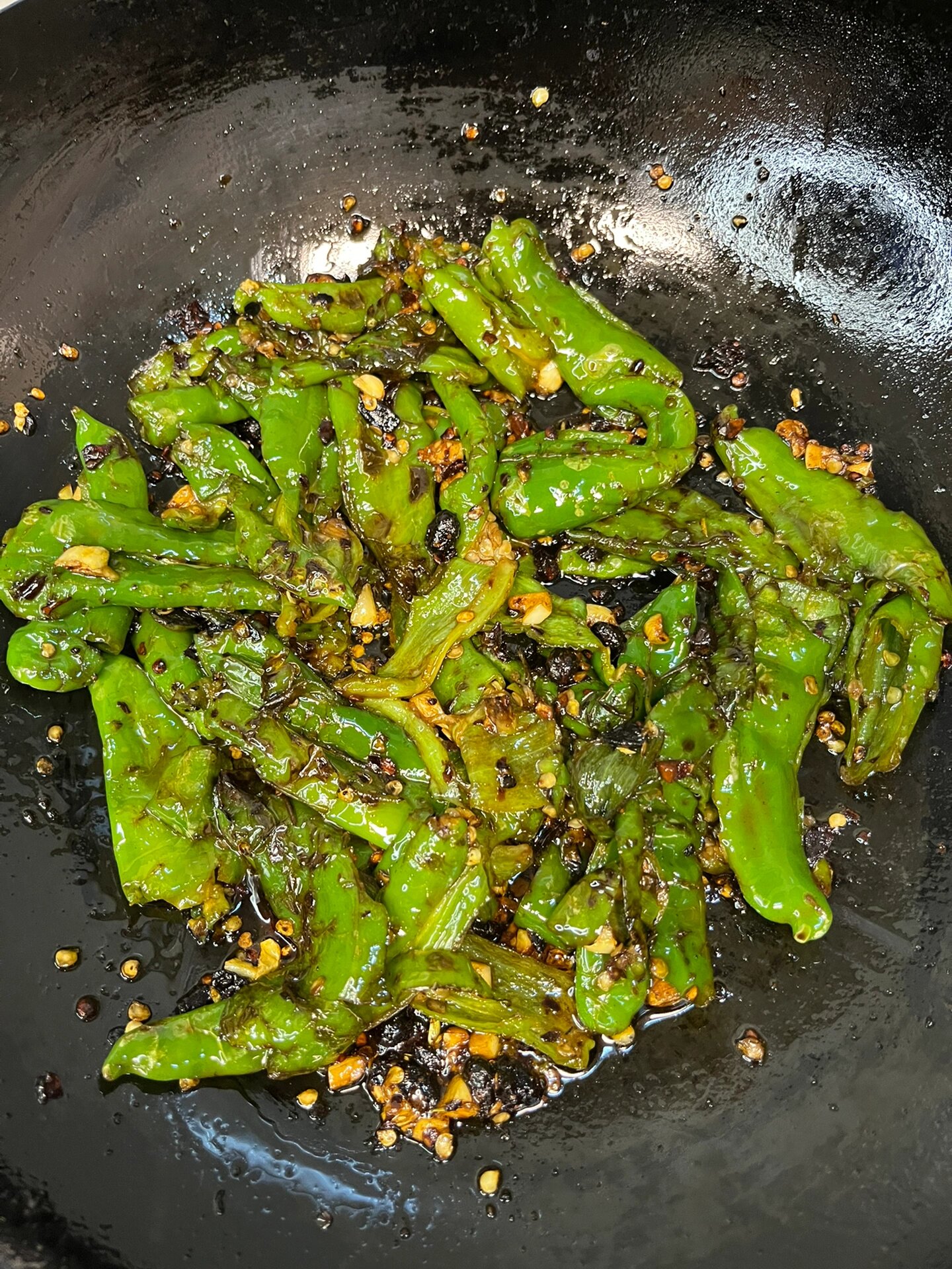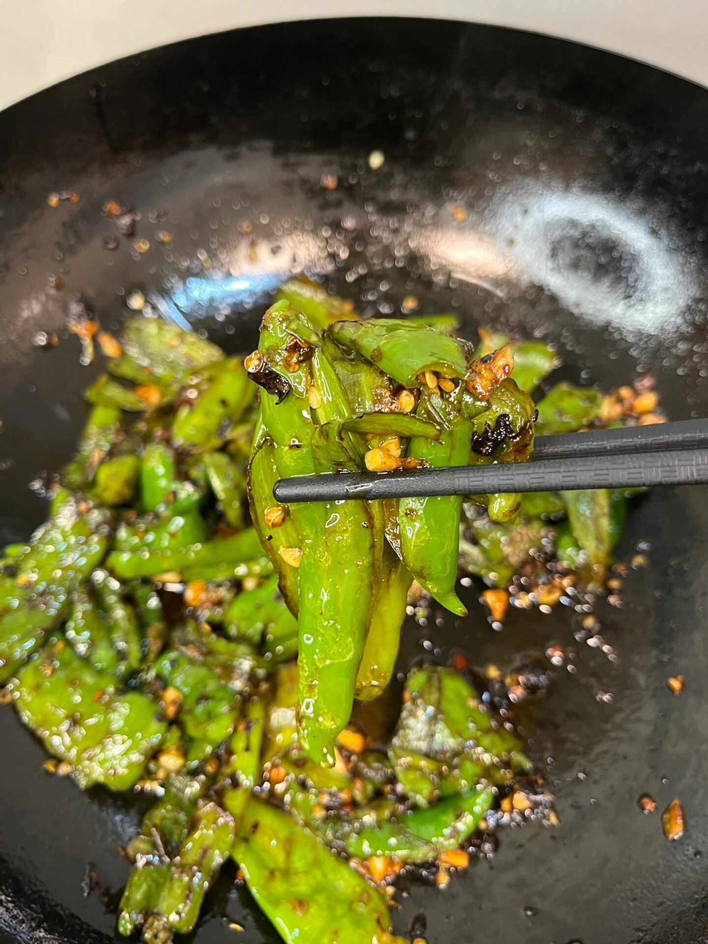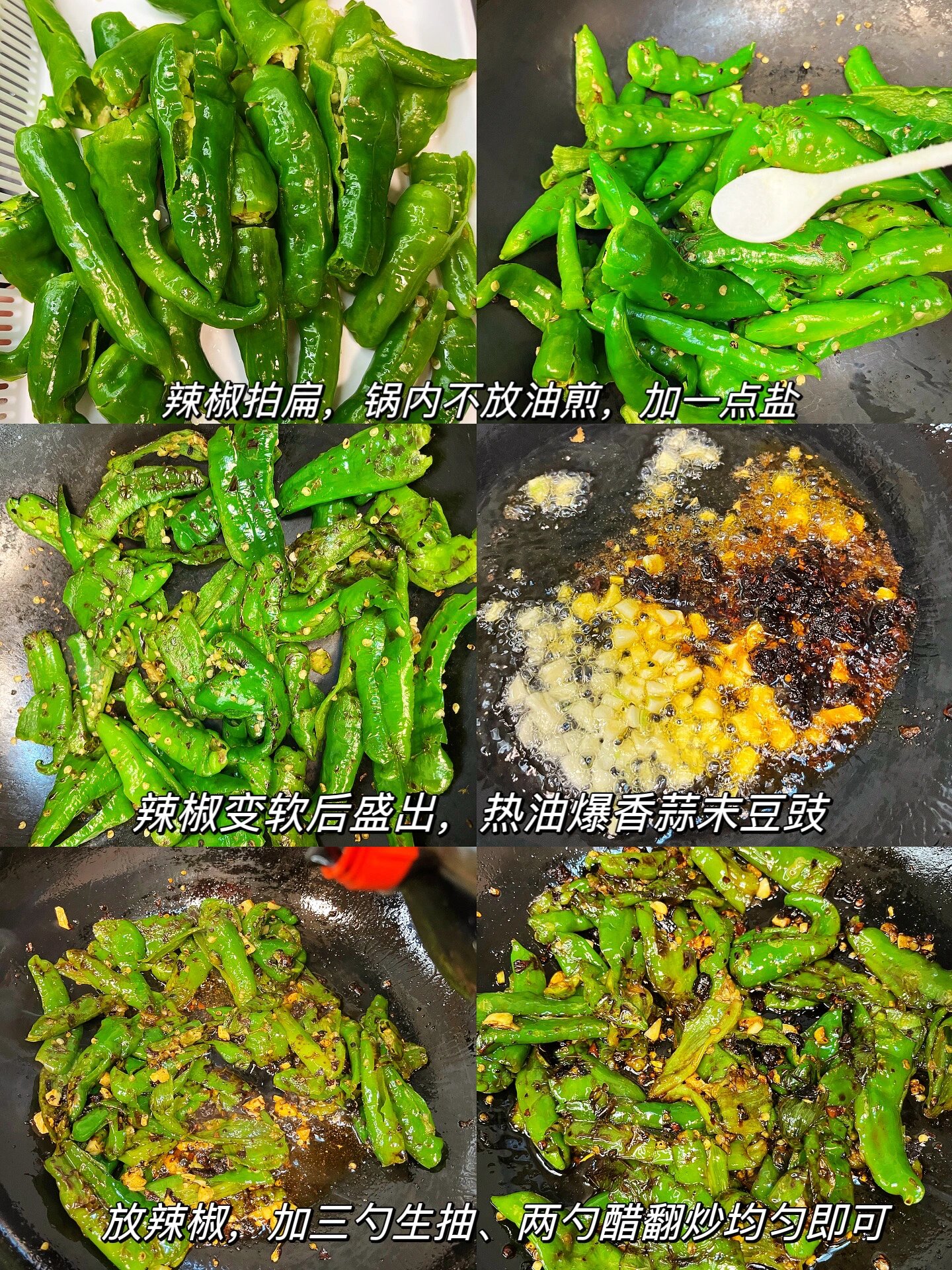 豆豉爆辣椒,超级下饭菜,连干两碗米饭 哇塞!这个豆豉爆辣椒简直绝了!太下饭了,巨开胃~ 做法简单,赶紧试试吧 做法:1、辣椒拍扁,下锅放点盐炒至焦软盛出 2、热油爆香蒜末、豆豉,下辣椒,再放三勺生抽、两勺醋翻炒均匀即可(不喜欢醋味的可不放)