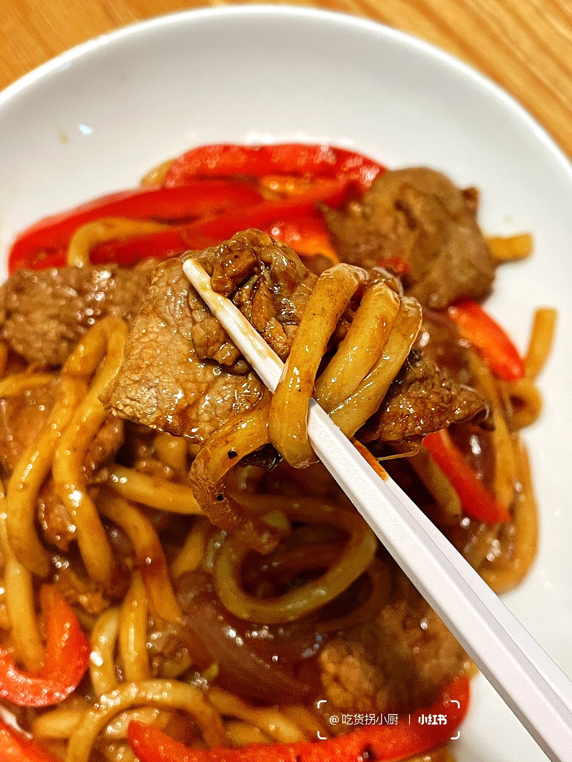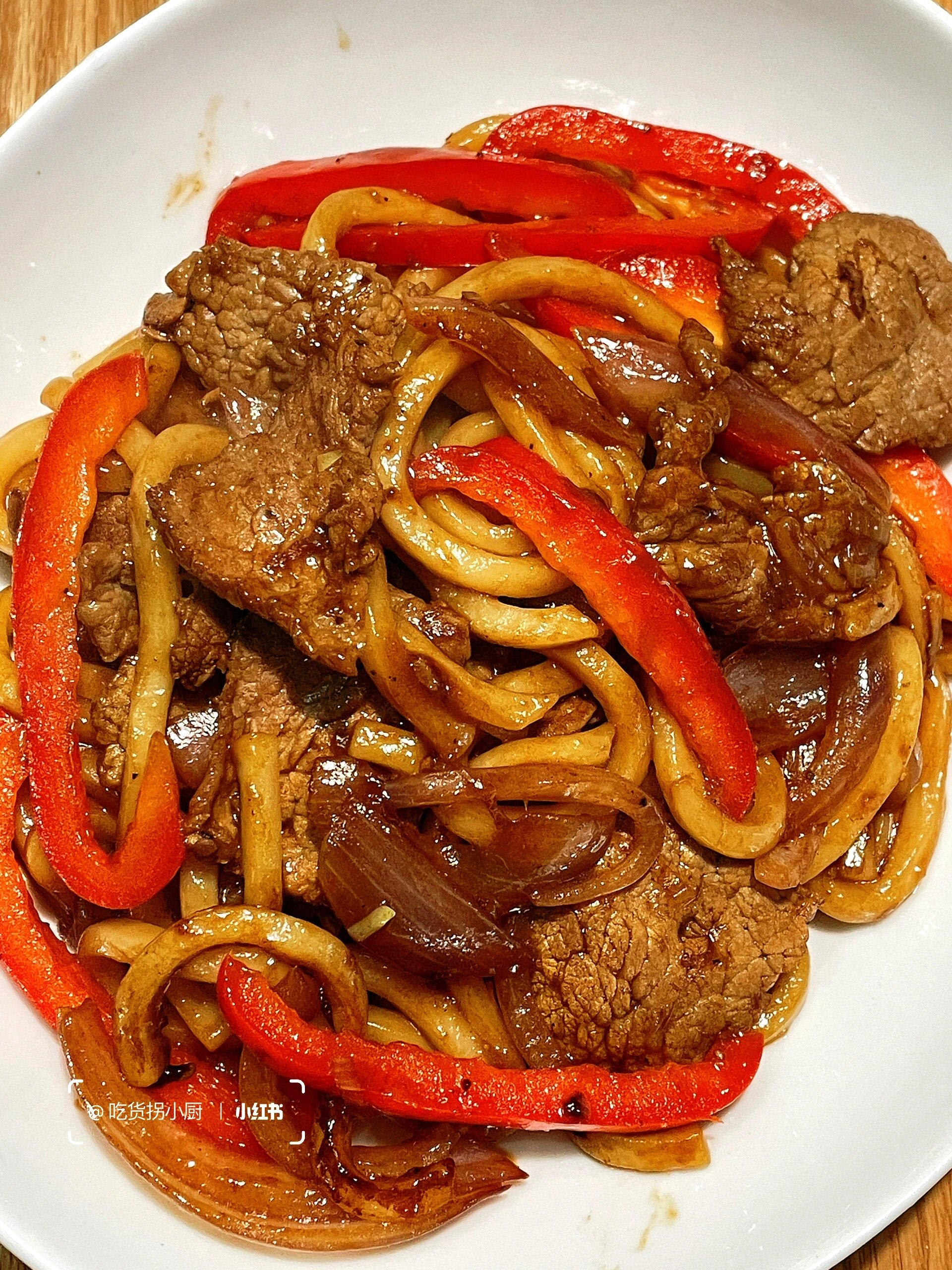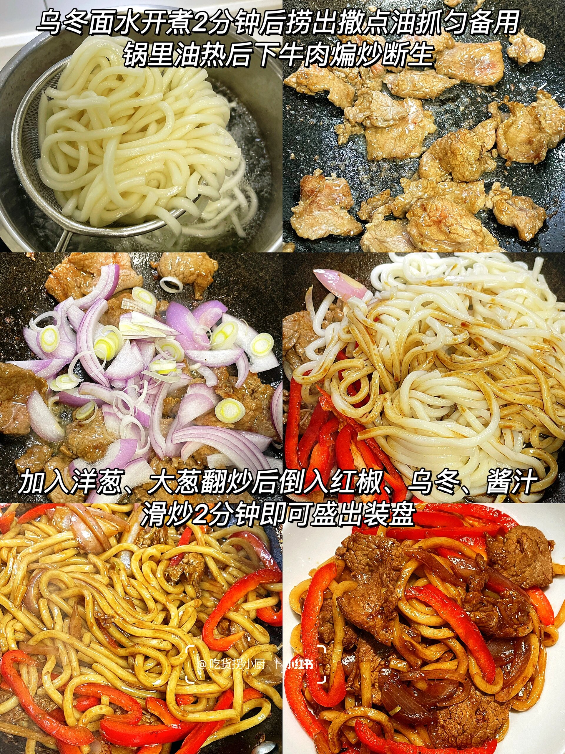 冷冷的冬天,来盘牛肉炒乌冬,简直是太幸福啦。 做法也很简单,赶快学起来吧! 食材:乌冬面2包(我做的是2人份,一人食可以减量)洋葱、大葱、红椒、牛肉片 做法:1、腌制牛肉:牛肉➕少许料酒、生抽、白胡椒粉、盐、淀粉抓匀腌制10分钟 调酱汁:2勺生抽、1勺老抽、半勺糖、半勺盐、半勺黑胡椒粉、小半碗淀粉水搅匀 煮乌冬:水开后下乌冬面煮2分钟后老抽,淋少许油抓匀 2、锅里油热后下牛肉滑炒断生后加入洋葱大葱翻炒,倒入红椒、乌冬面、酱汁滑炒2分钟即可出锅装盘。