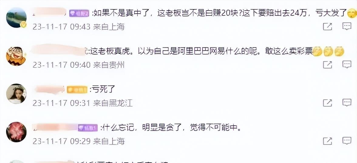 事后黑店主门口挂一横幅:恭喜本店彩民喜中一等奖400万实得24万。