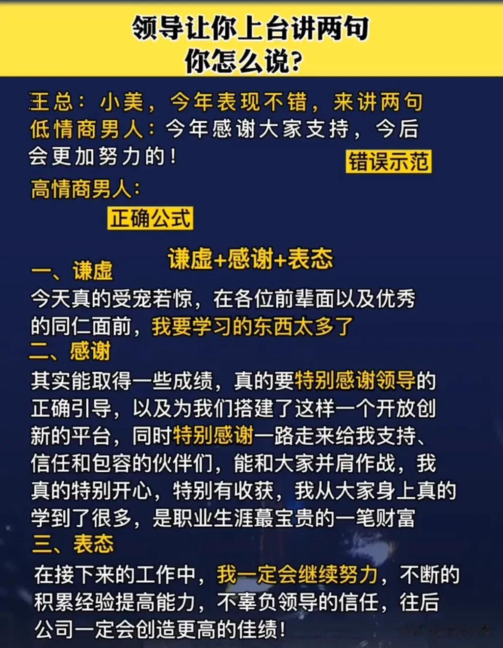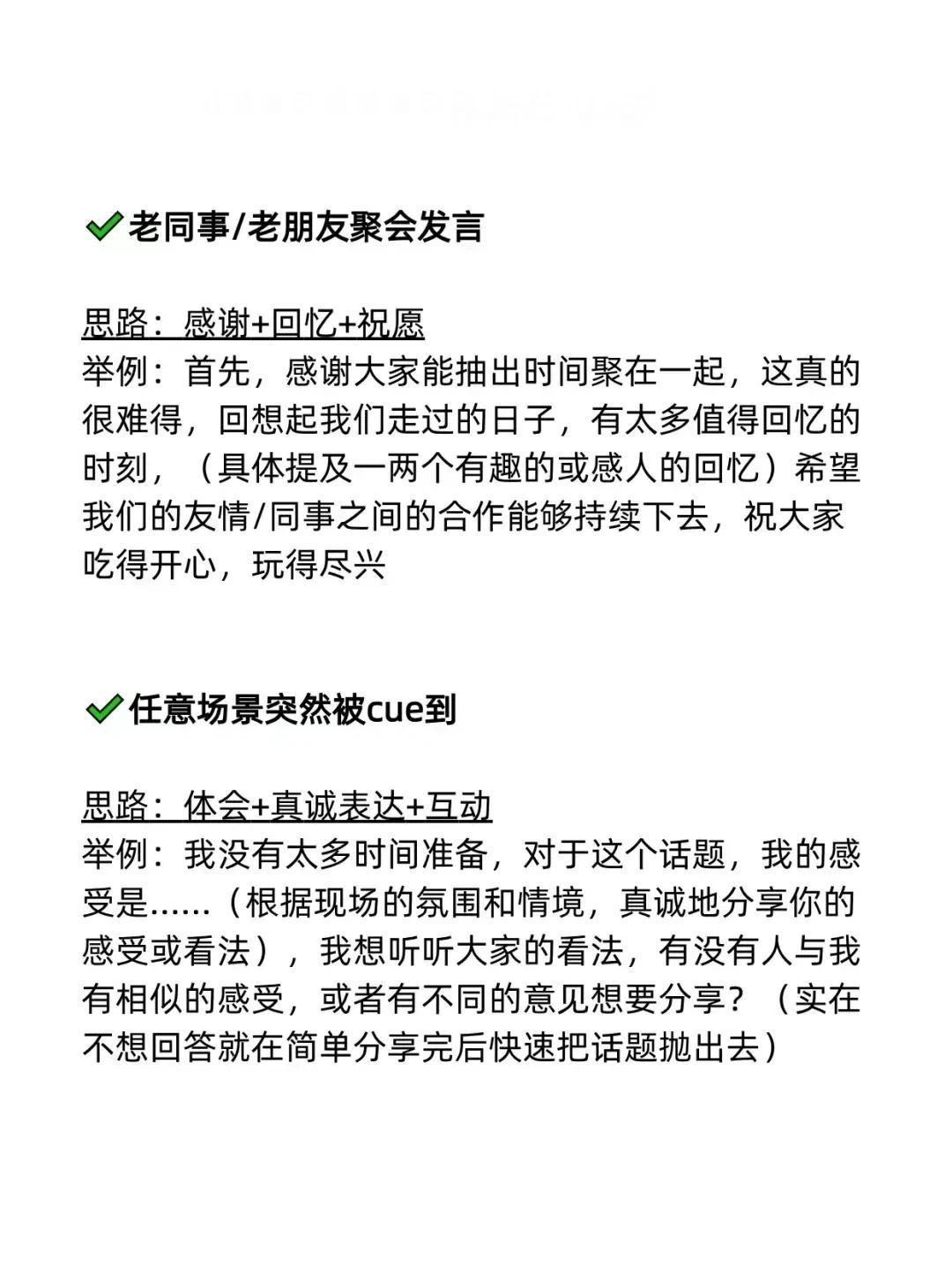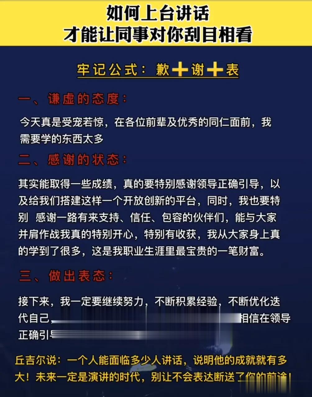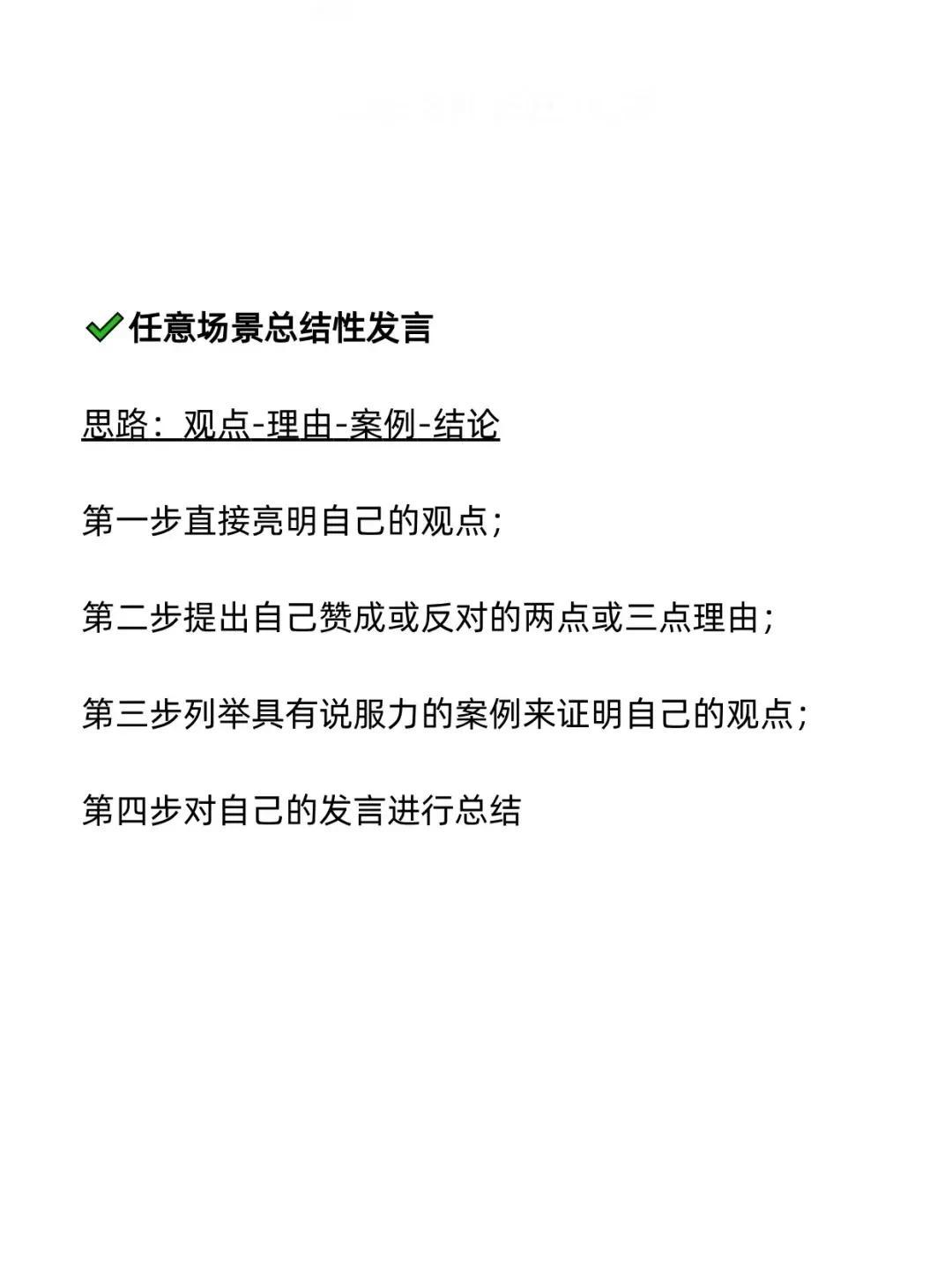我发现一个即兴发言不紧张的秘诀!原来是有万能公式的,直接往里套就行!难怪那些发言厉害的人,总能脱口而出,侃侃而谈,让大家刮目相看,这次终于找到诀窍了!背下来,什么入职/新环境自我介绍、开会被领导叫起来发言、老同事/老朋友聚会发言、任意场景突然被cue到、任意场景总结性发言……都是有公式的,下次就不怕怯场了! 无论生活中还是在职场上,当你学会即兴演讲以后,你会发现自己混得更加如鱼得水,左右逢源!有时候的一次发言,可能会遇到贵人,改变一生。 即兴演讲技巧和方法