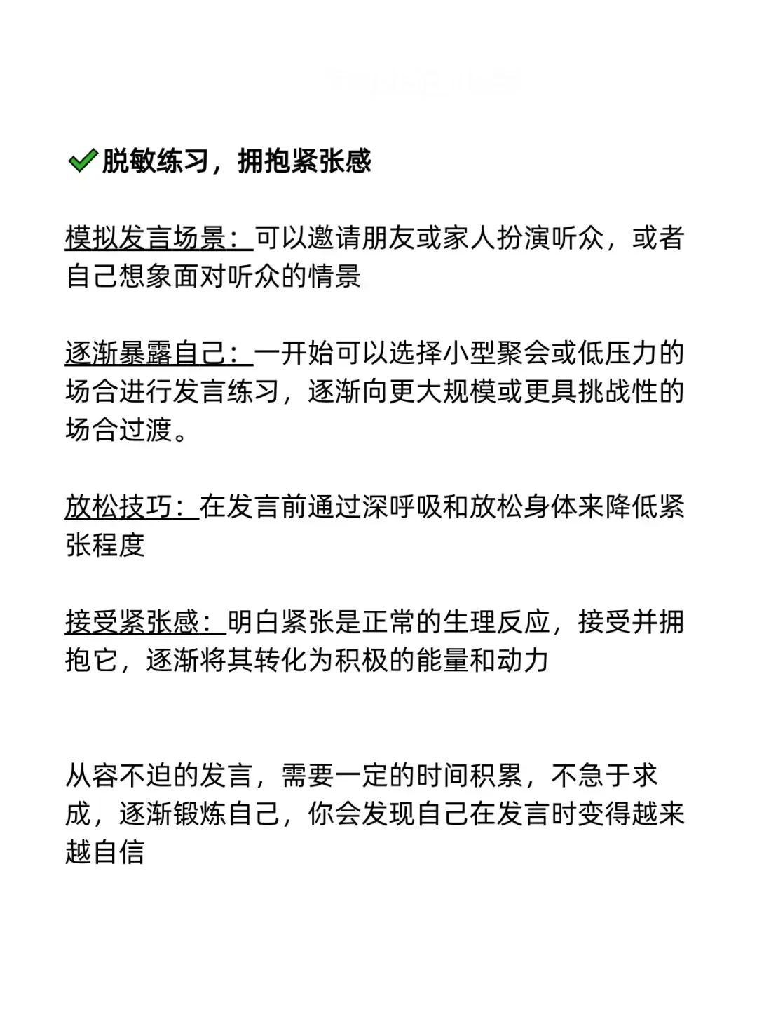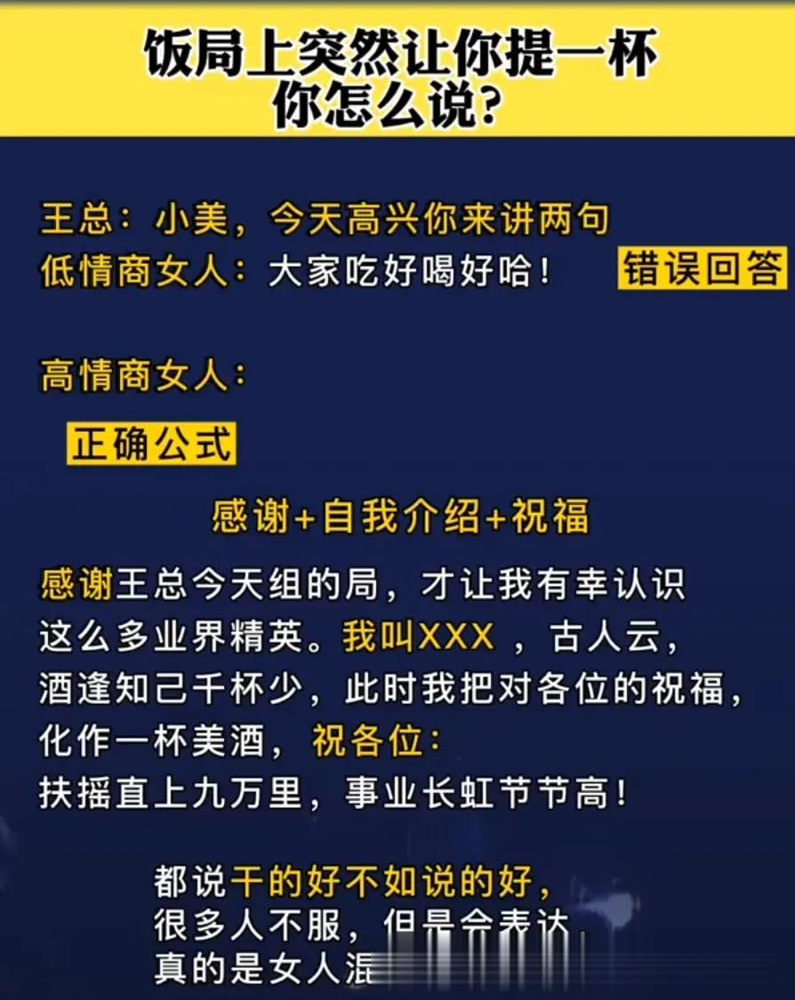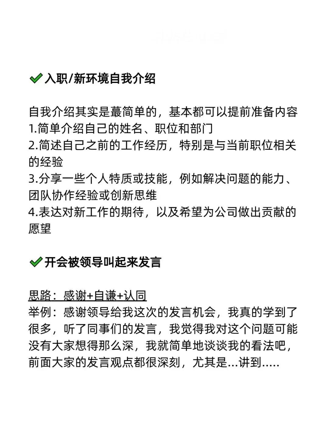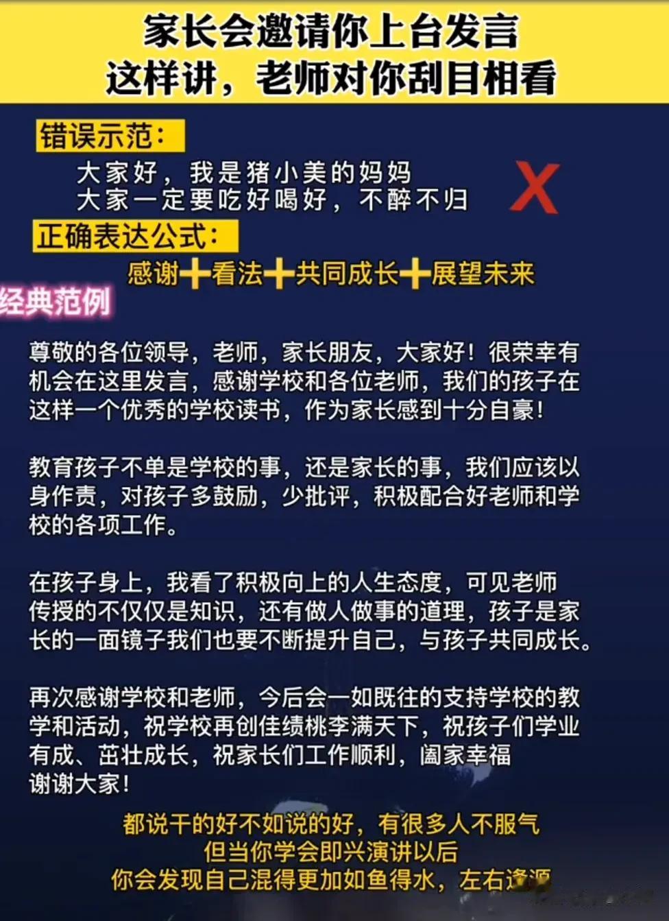 我发现一个即兴发言不紧张的秘诀!原来是有万能公式的,直接往里套就行!难怪那些发言厉害的人,总能脱口而出,侃侃而谈,让大家刮目相看,这次终于找到诀窍了!背下来,什么入职/新环境自我介绍、开会被领导叫起来发言、老同事/老朋友聚会发言、任意场景突然被cue到、任意场景总结性发言……都是有公式的,下次就不怕怯场了! 无论生活中还是在职场上,当你学会即兴演讲以后,你会发现自己混得更加如鱼得水,左右逢源!有时候的一次发言,可能会遇到贵人,改变一生。 即兴演讲技巧和方法
