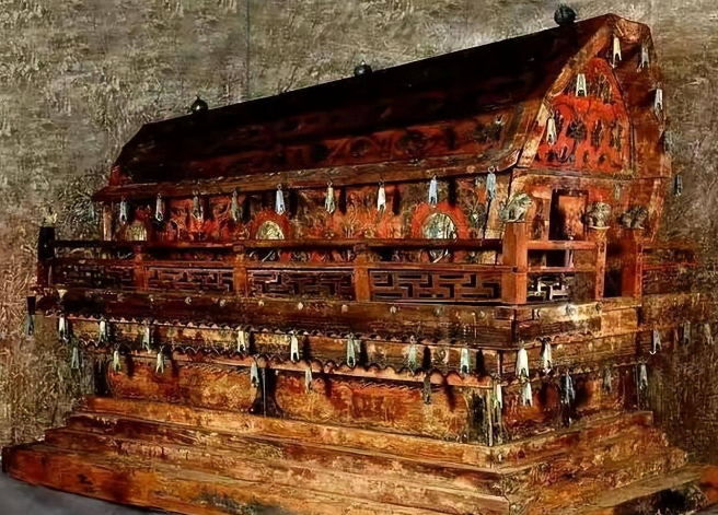 考古队举着手电筒,照亮四周后惊叹不已,墓室正中放置着一口巨大的红色木棺,约两米长,造型精美,由整块上好的檀香木雕刻而成,棺身涂满明亮的朱漆,上面还雕饰着栩栩如生的金凤凰。