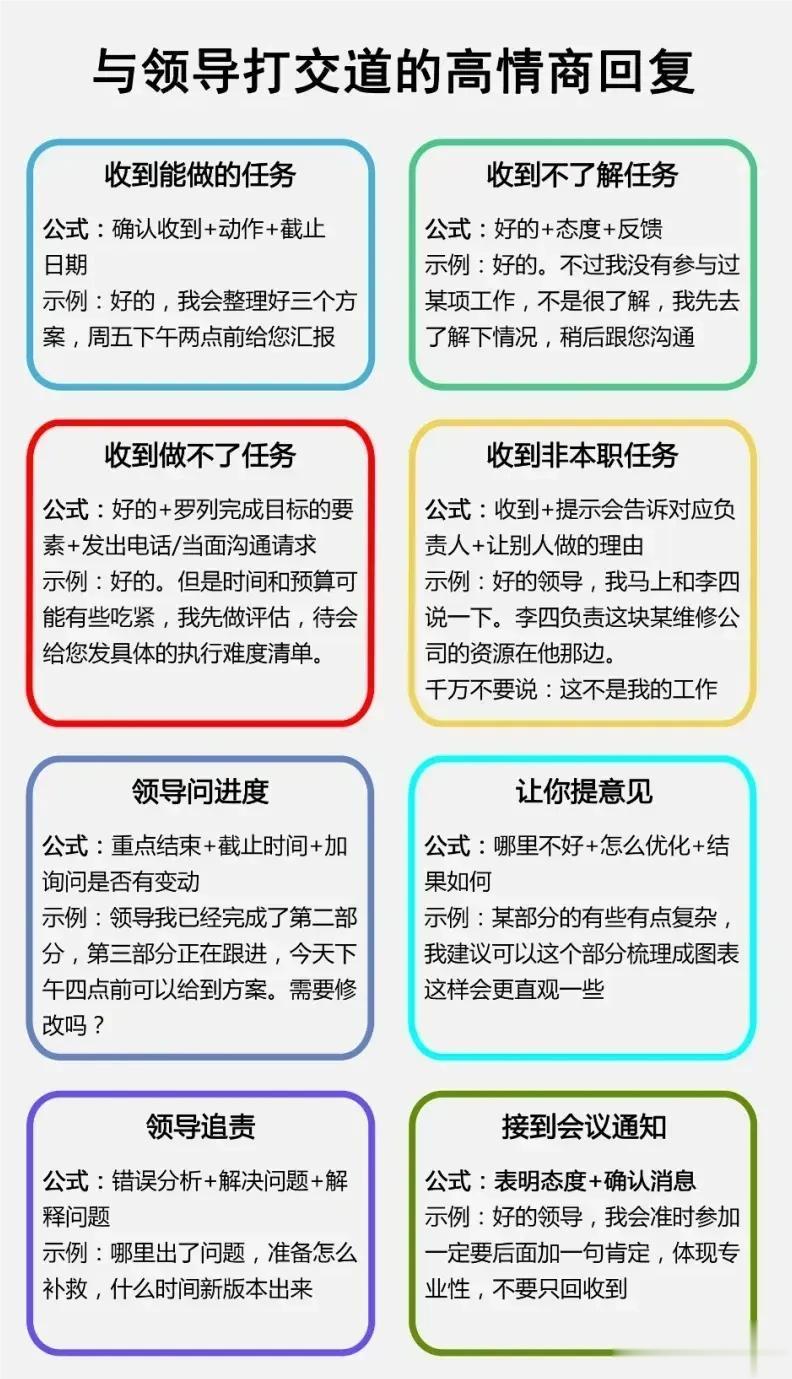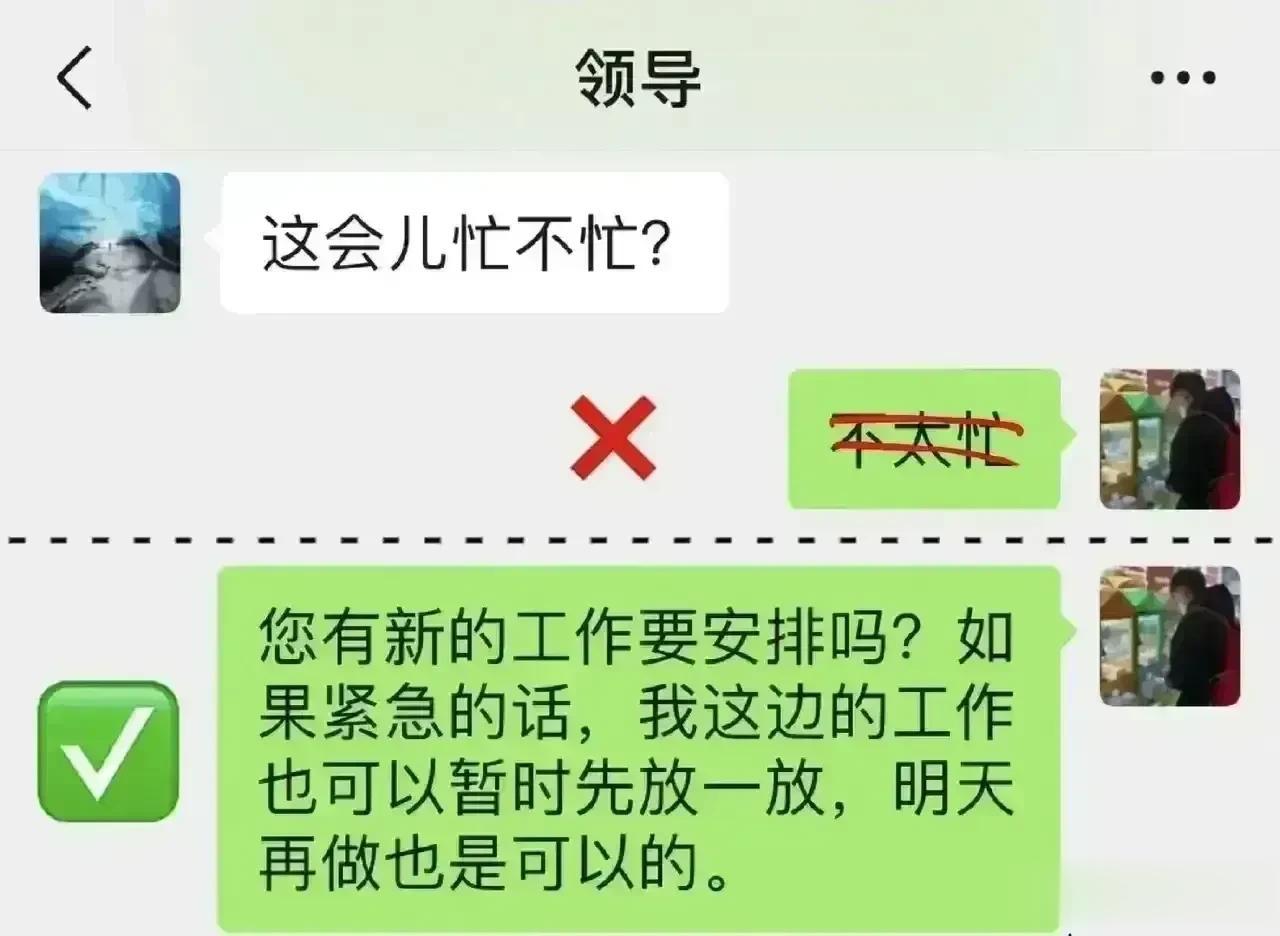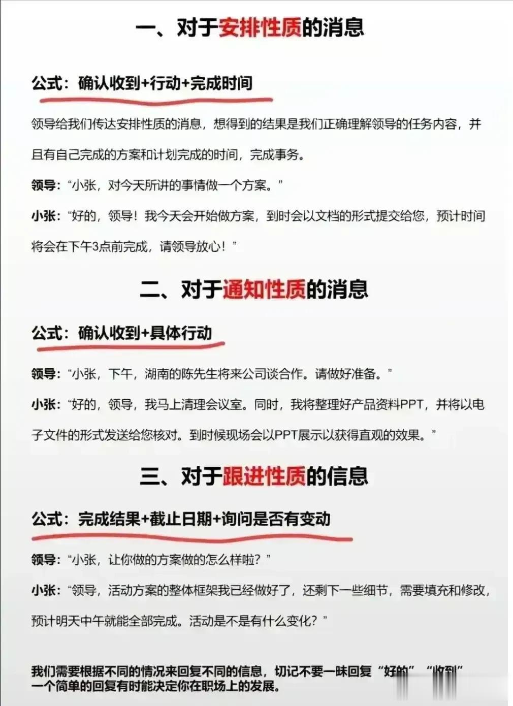 天呐!工作了十多年才明白,原来在工作上,回复领导千万别用“好的”“收到”,这种千遍一律的话术,太老套了!学一学高手的回话万能公式,才能深得领导器重!比如领导让你提意见公式:哪里不好+怎么优化+结果如何。领导追责公式:错误分析+解决问题+解释问题…… 接话是一门技术,特别是在职场工作当中,会接话的人,才能让人记忆深刻,才能让领导刮目相看,赶紧背下来!学一学接话技巧,把话说到点上,赢得更多升职加薪的机会。 好好接话说话之道