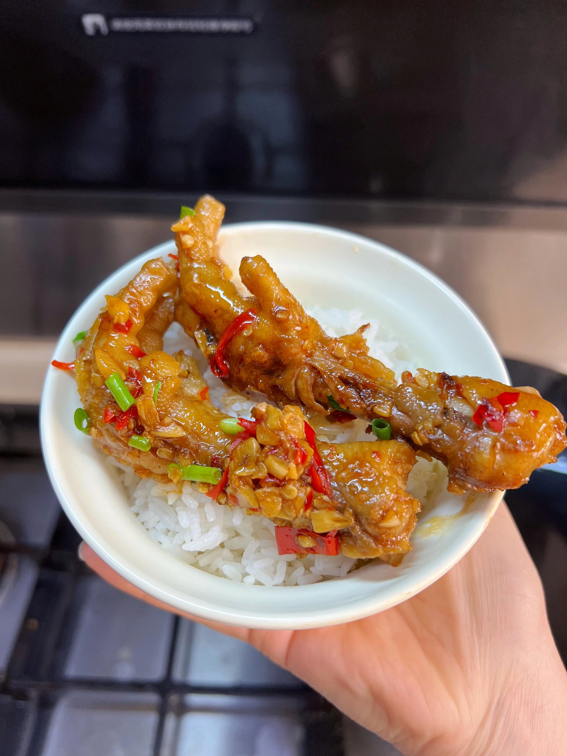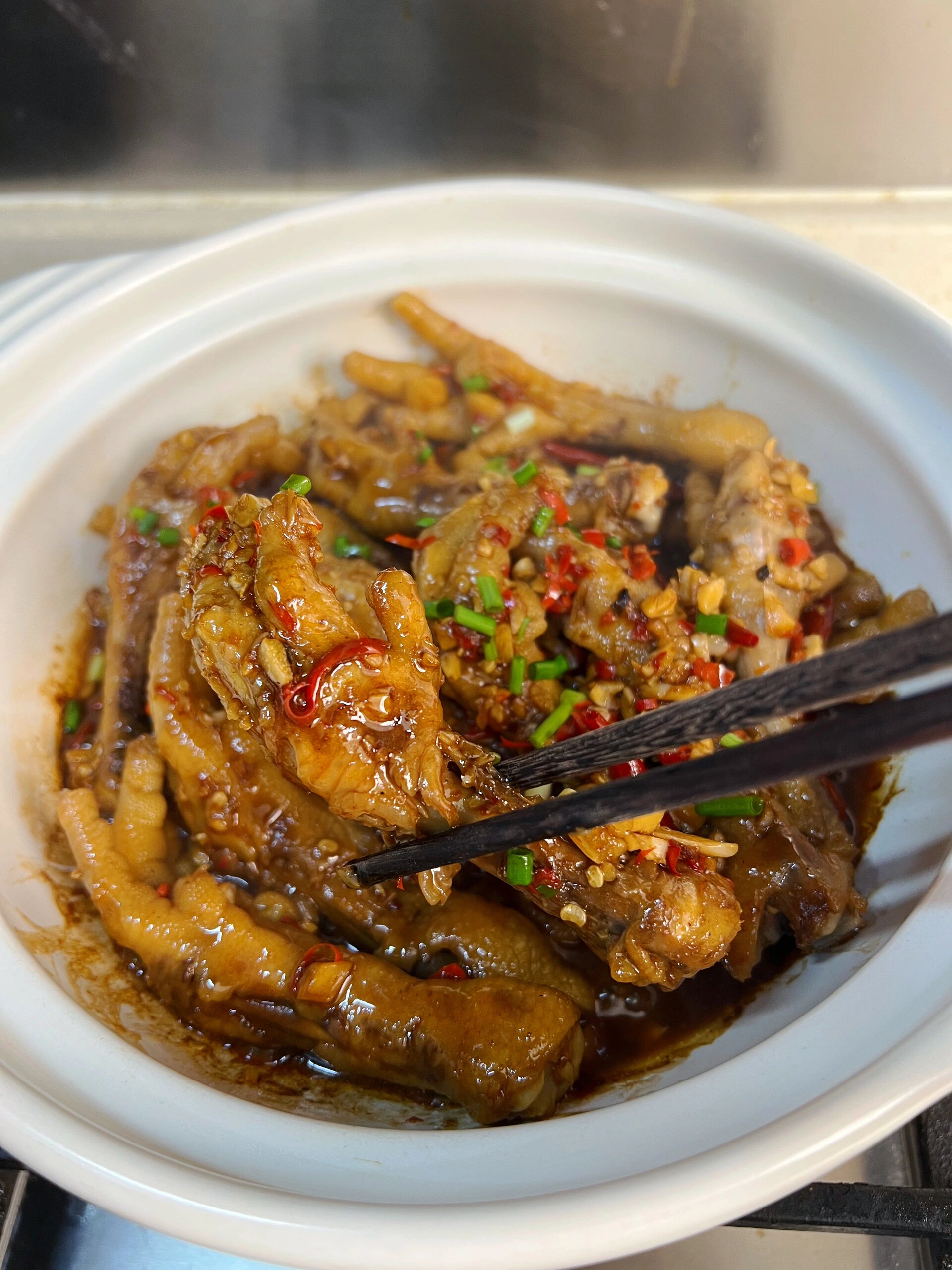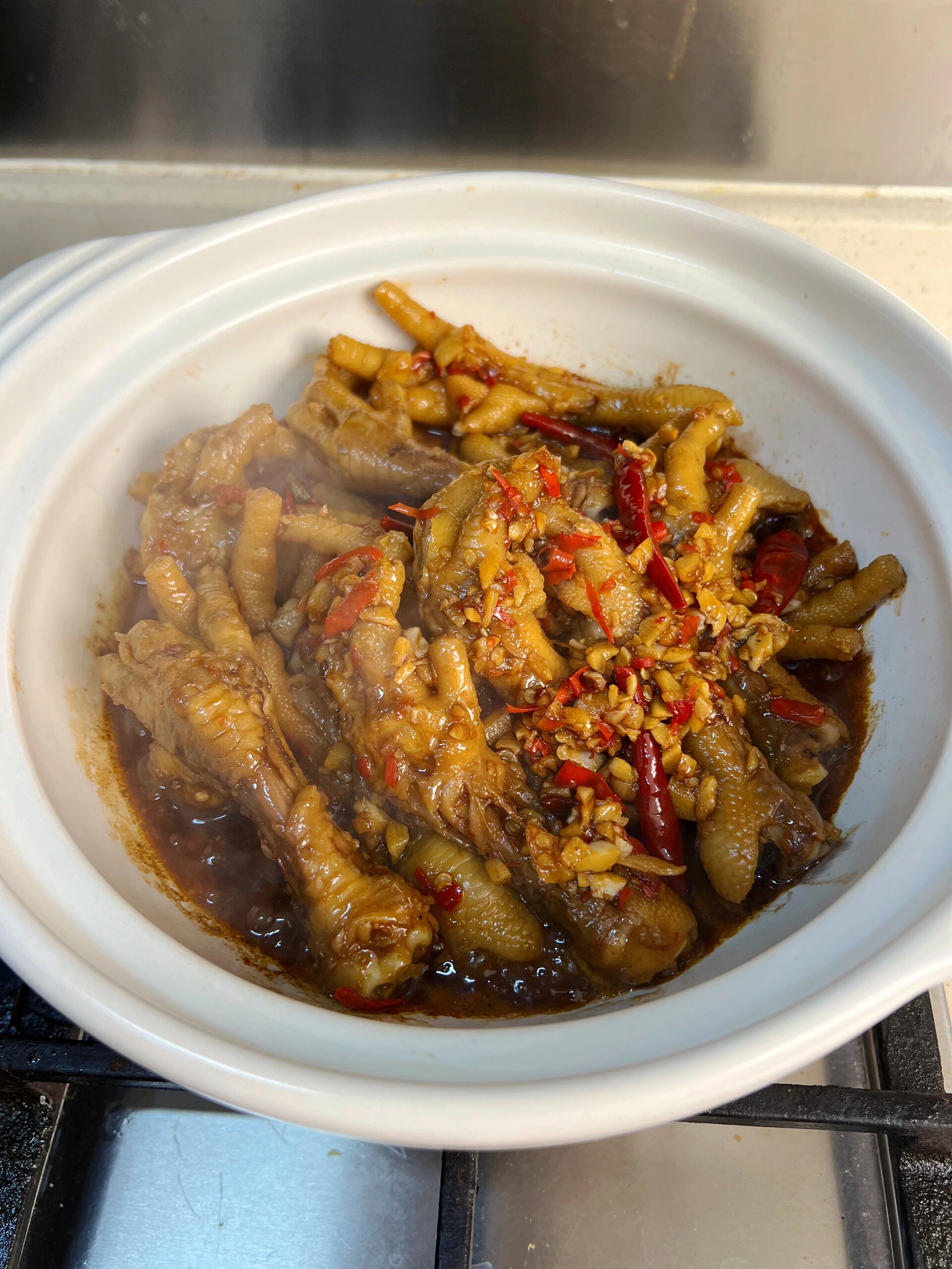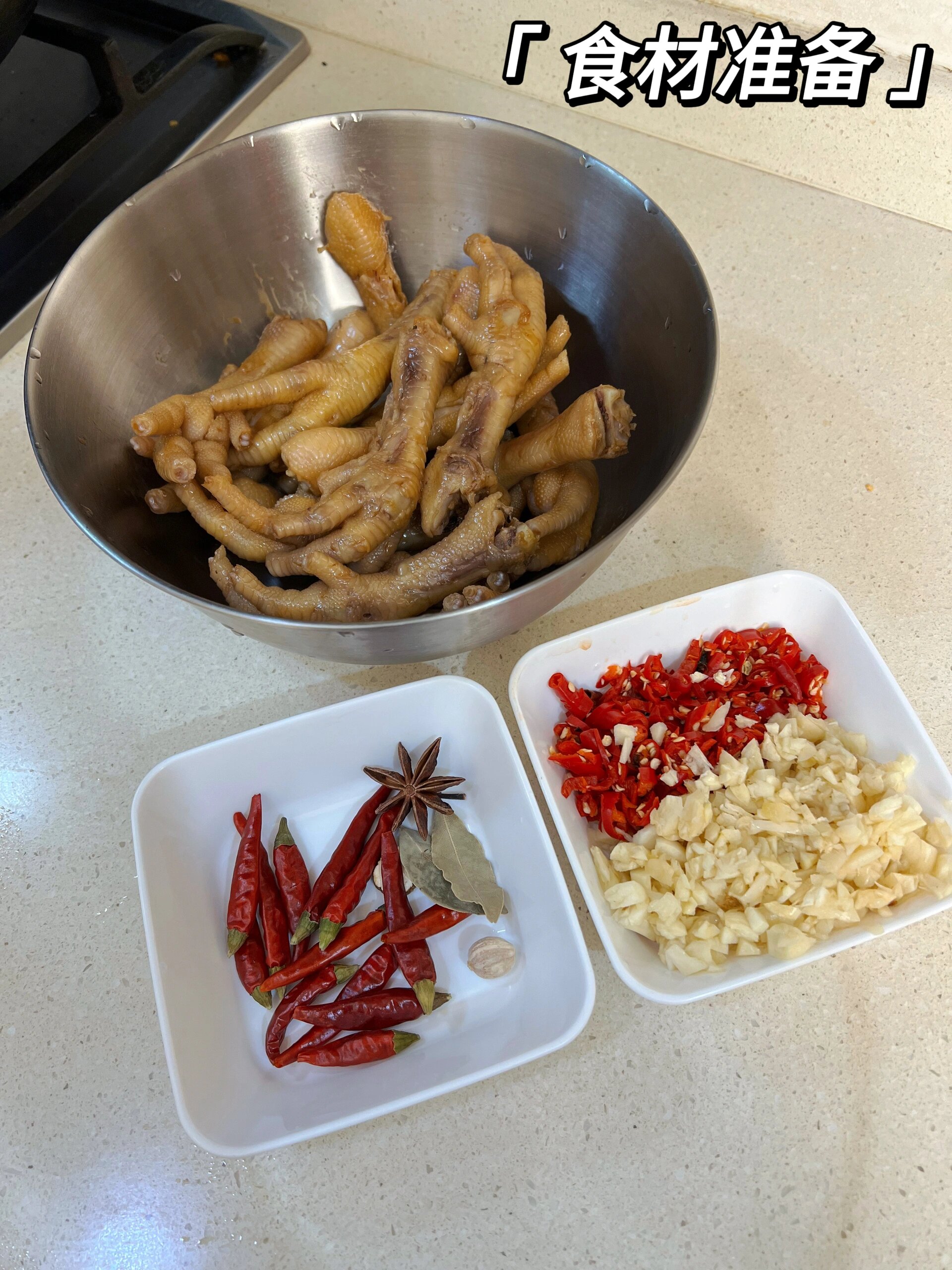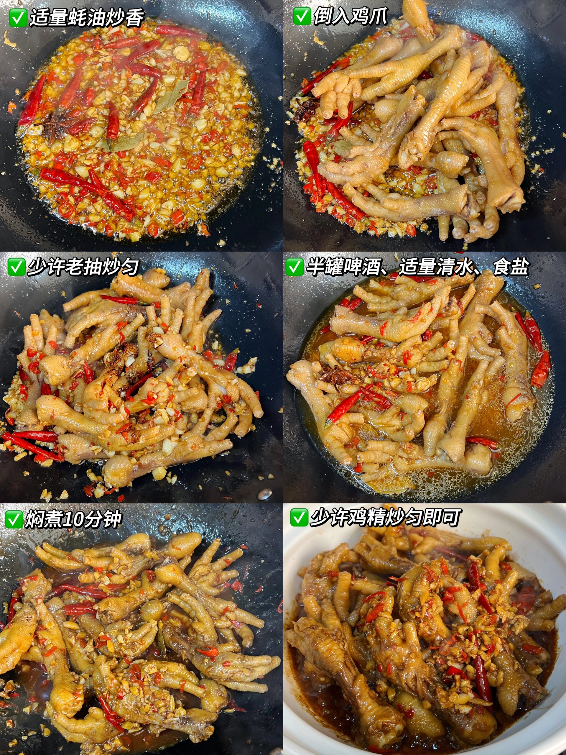 香辣蒜蓉鸡爪,鸡爪控的看过来,好吃到爆 这个做法的鸡爪比夜市上的好吃很多,闺蜜每次来家里吃饭的必点菜,喜欢吃鸡爪的姐妹一定要试下 食材:鸡爪、葱姜蒜、小米辣、八角、花椒、豆蔻、香叶; 做法:1、鸡爪冷水下锅,放葱姜、花椒、料酒煮20分钟,中间打下浮末,捞出趁热放盐、酱油拌匀腌制10分钟; 2、油热放大量蒜末、小米辣末炒香,放适量生抽、蚝油、麻辣鲜、五香粉炒香,放八角香叶、豆蔻、干辣椒炒出香味,再倒入鸡爪炒匀,放半罐啤酒、适量清水,焖煮10分钟,放适量鸡精炒匀即可