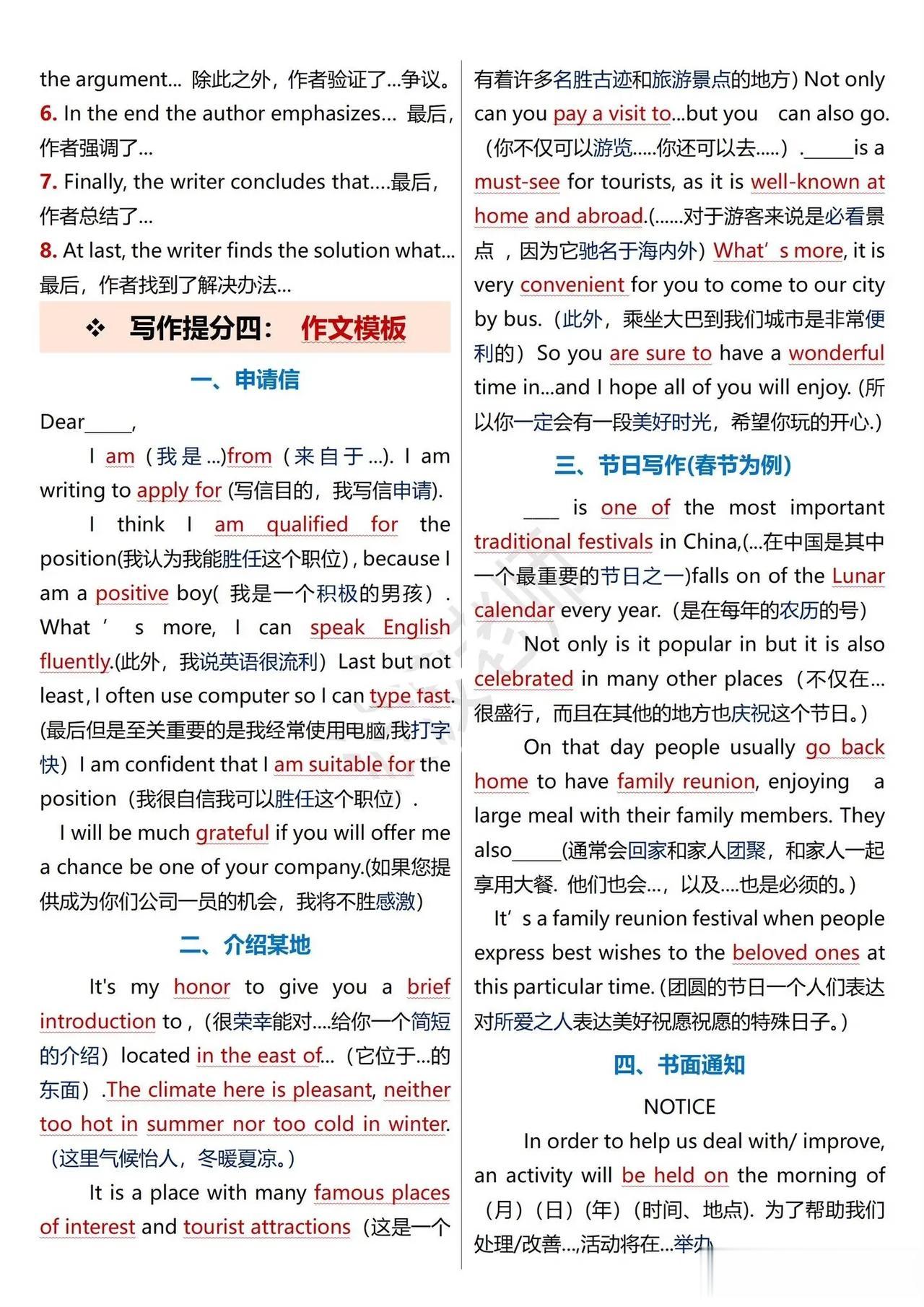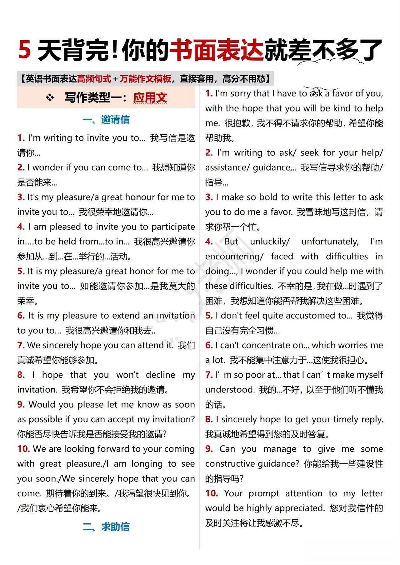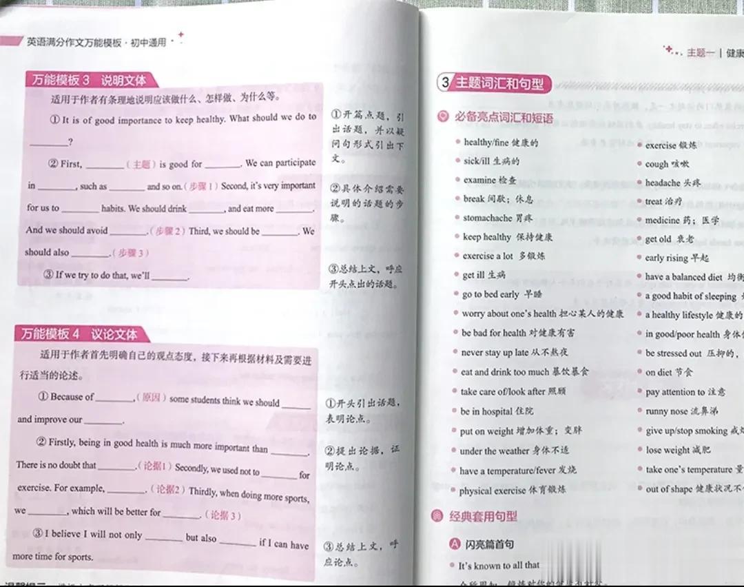 写作小心机,英语书面表达“天花板”,背会就能提分!高频句式+万能写作模板,写作时纵享丝滑,运用到作文中惊艳老师,高分跑不了!赶紧收藏! 英语作文也是有模板的,更多模板下方链接已经为你准备好万能的满分作文模板了。帮助学生深入了解模板的公式作用,更加方便使用。每个主题配有主题词汇和句型。帮助学生丰富写作素材,让学生在写作的同时积累词句,从而在写作中更加得心应手。 小学初中英语写作模板