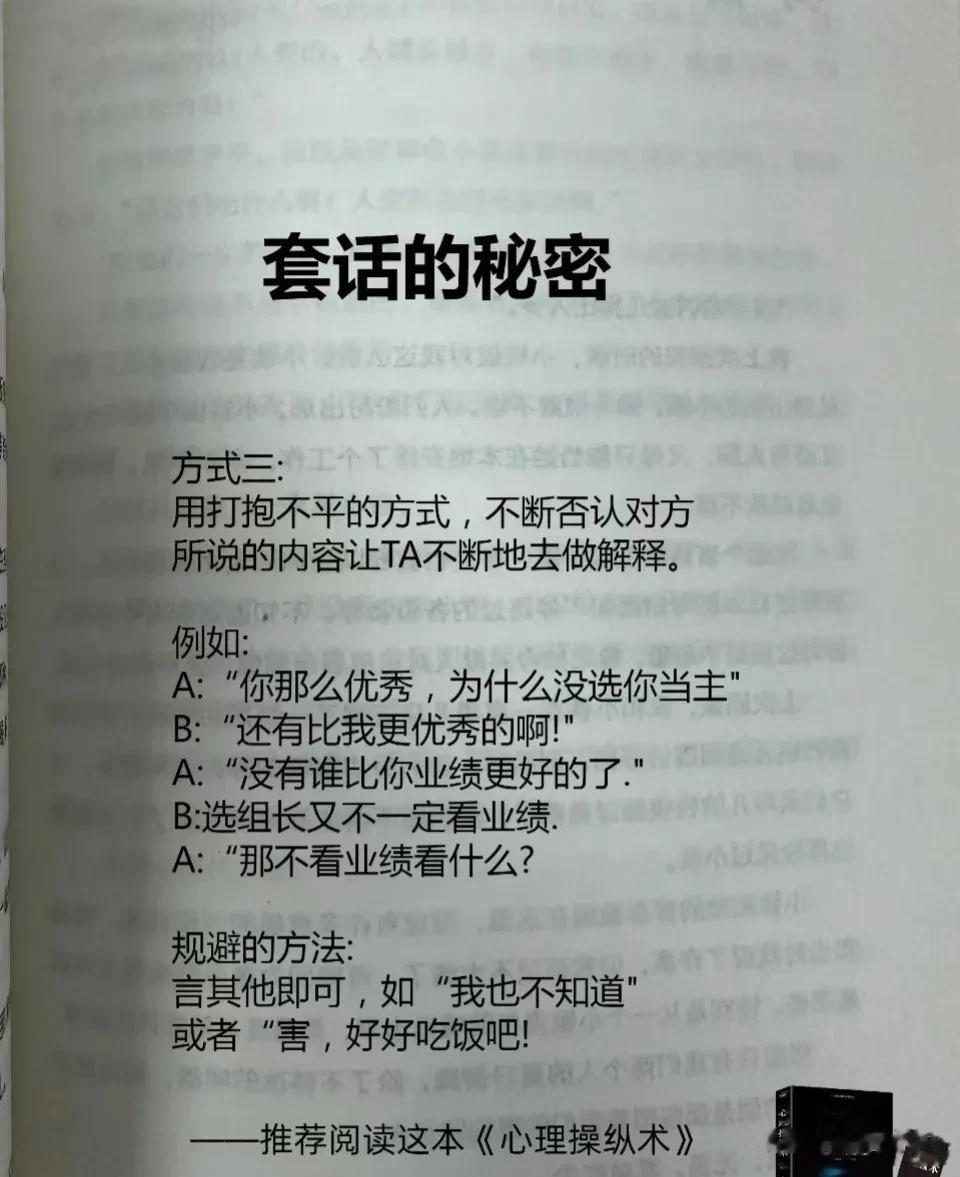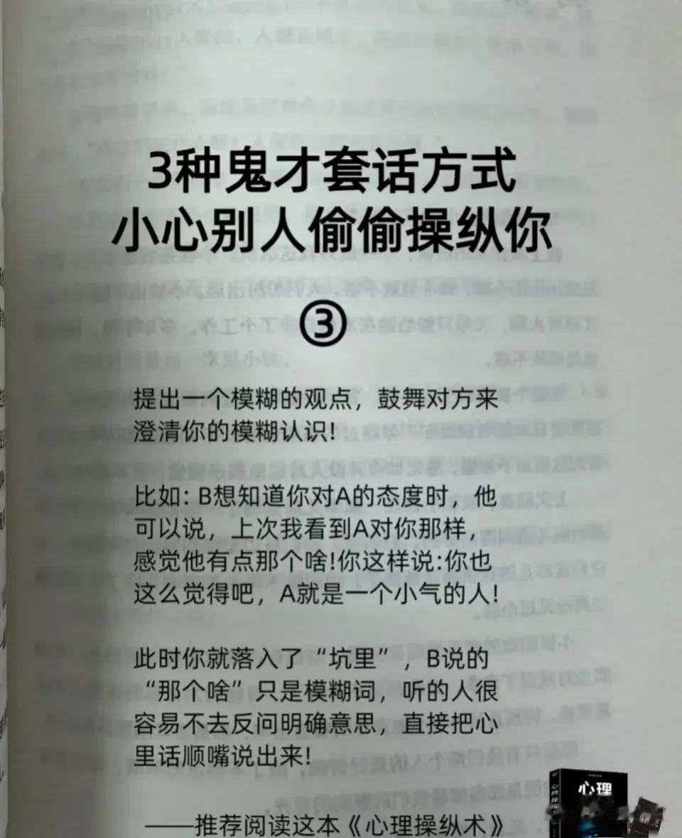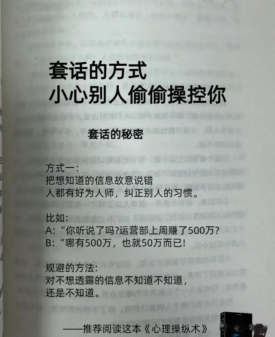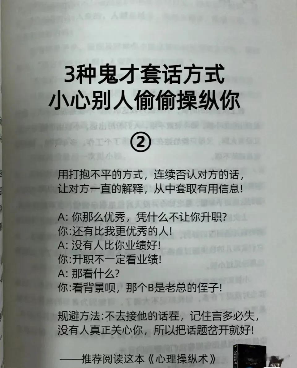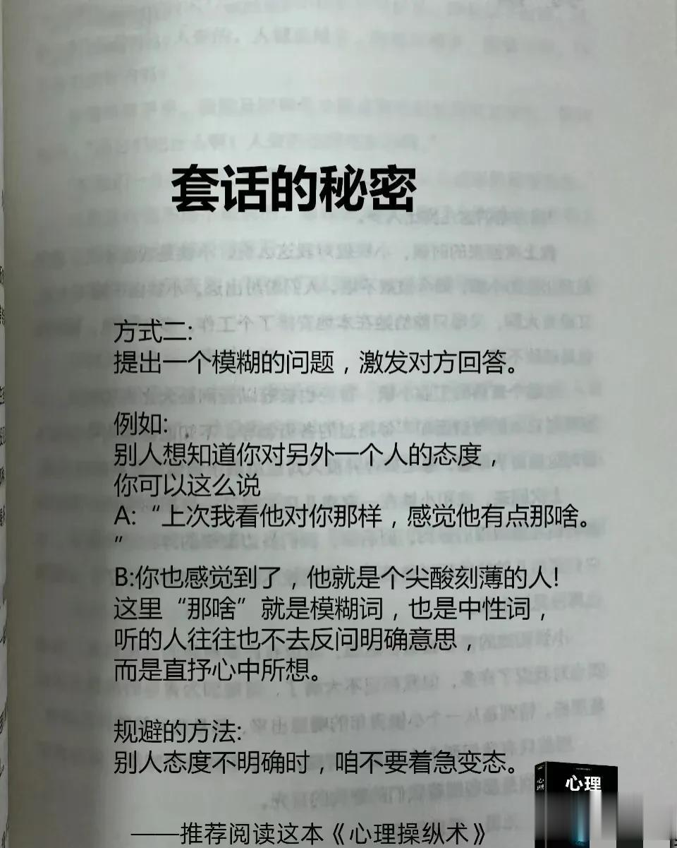 “太佩服了”!我发现六种鬼才的套话方式,一不小心就让别人偷偷操纵你,轻松瓦解你的心理防线,看完简直惊出一身冷汗!原来会套话会谈判的人,都是这样操控人心,达到自己的目的!赶紧学起来!那些混得好的人,叱咤职场商场多年,原来是早就对这些识人术操纵术学的滚瓜烂熟了! 心理操纵术