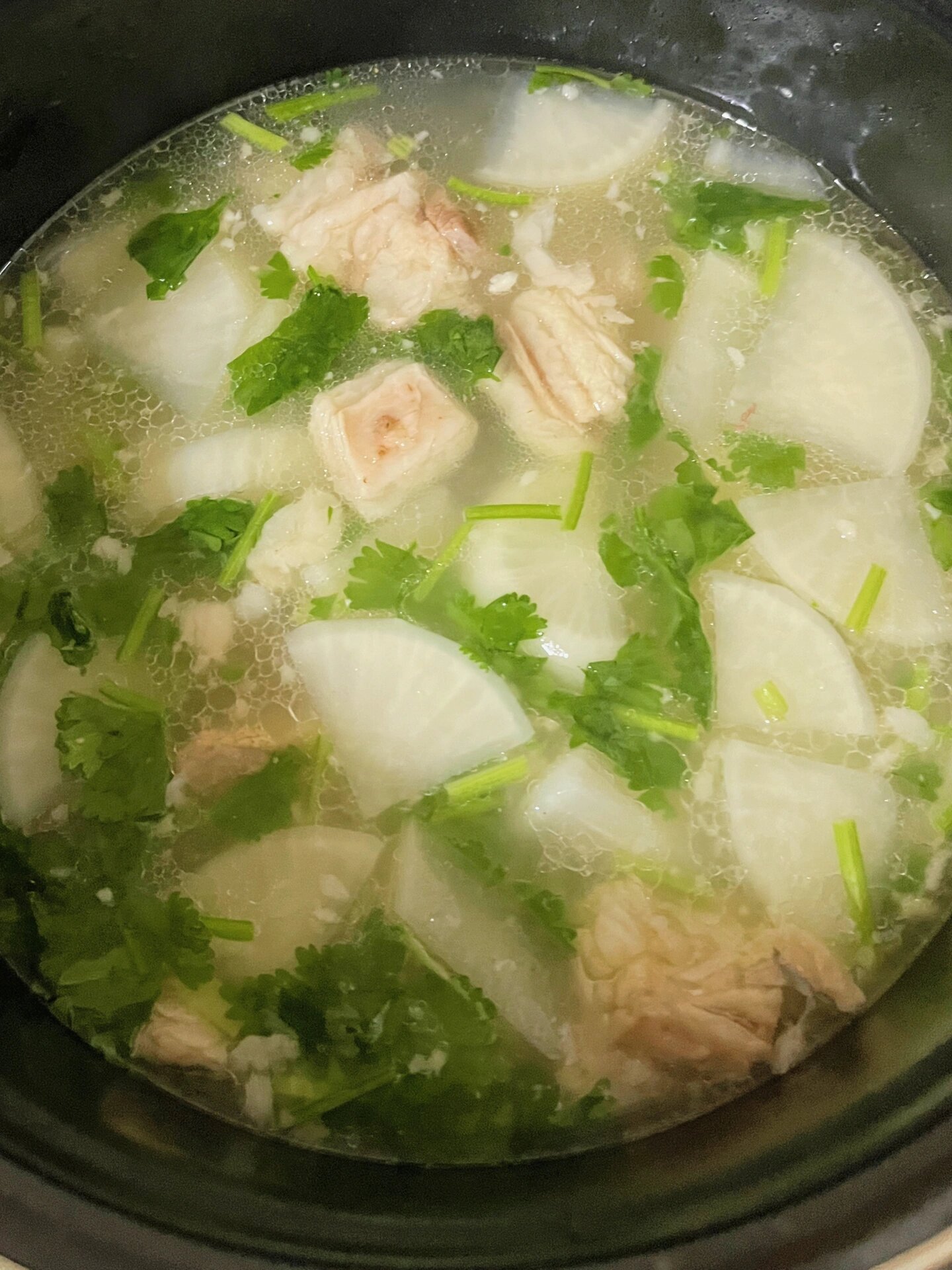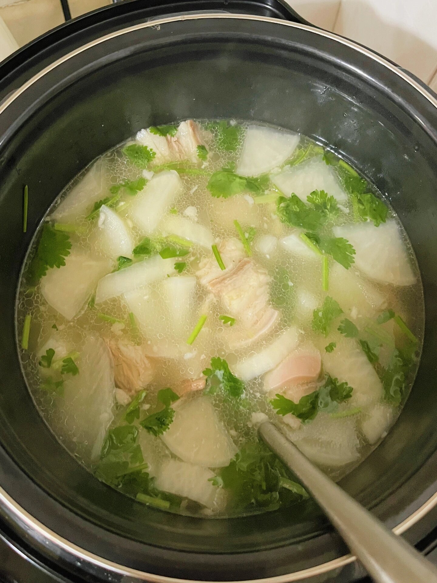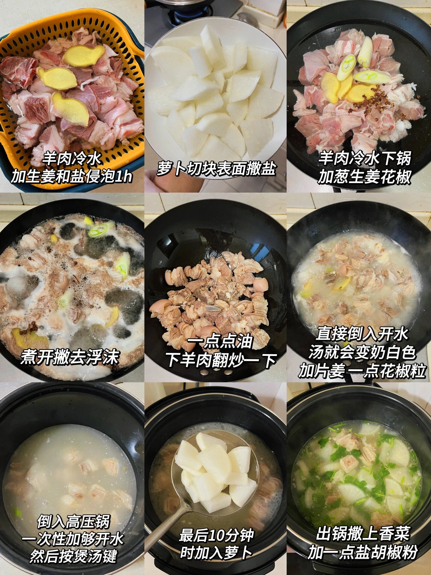 这个汤真心好喝!我直接干了2碗 冬天就要来一碗热乎乎的羊肉汤,喝完身上暖暖的。 食材:羊肉 萝卜 香菜 配料:生姜 大葱 花椒粒 小茴香 调料:盐 胡椒粉 做法:1、羊肉在冷水里➕姜片➕盐泡1h,可以有效去除羊肉的膻味 2、冷水倒入羊肉➕生姜 大葱段 花椒粒 慢煮 煮出里面的雪沫,然后用温水清洗干净。 3、热锅冷油倒入控干的羊肉 稍微煸炒一下,炒到表面微微焦黄就可以,然后倒入热水 大火煮开 这个时候汤就会变奶白色 4、煮好后倒入高压锅内再把开水一次性加够,加一点小茴香,按煲汤键就可以啦,剩余10分钟后再加入萝卜就完成了。 出锅前加适量盐 胡椒粉 香菜 就可以啦,喝完一碗暖暖的