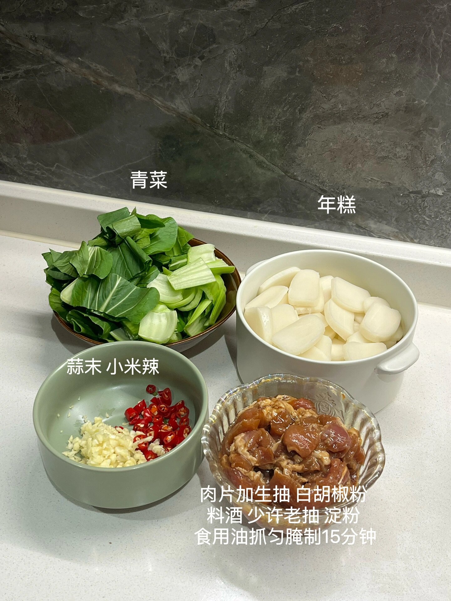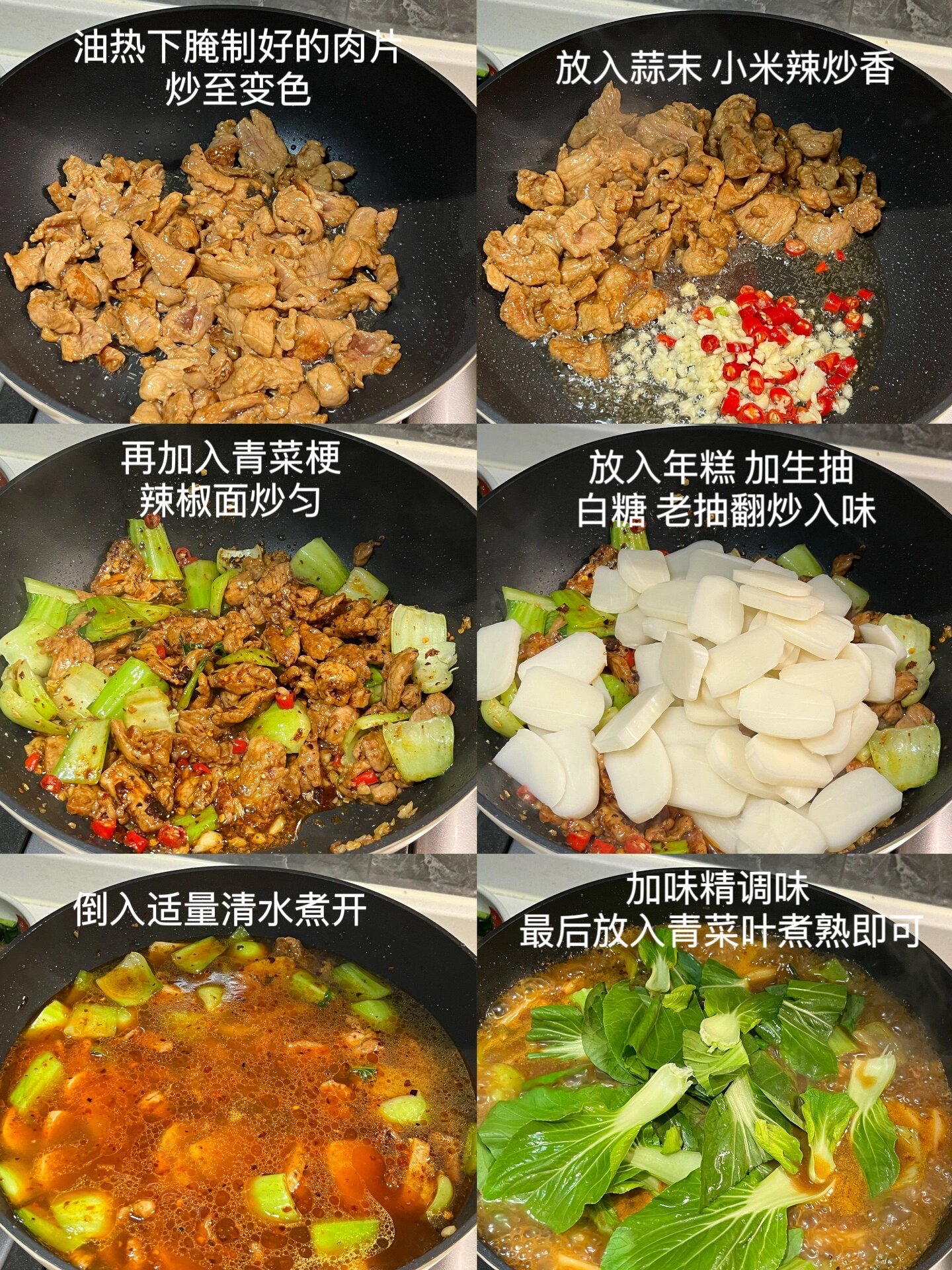 2、油热下腌制好的肉片炒至变色 放入蒜末 小米辣炒香 再加入青菜梗 辣椒面炒匀 放入年糕 加生抽 白糖 老抽翻炒入味