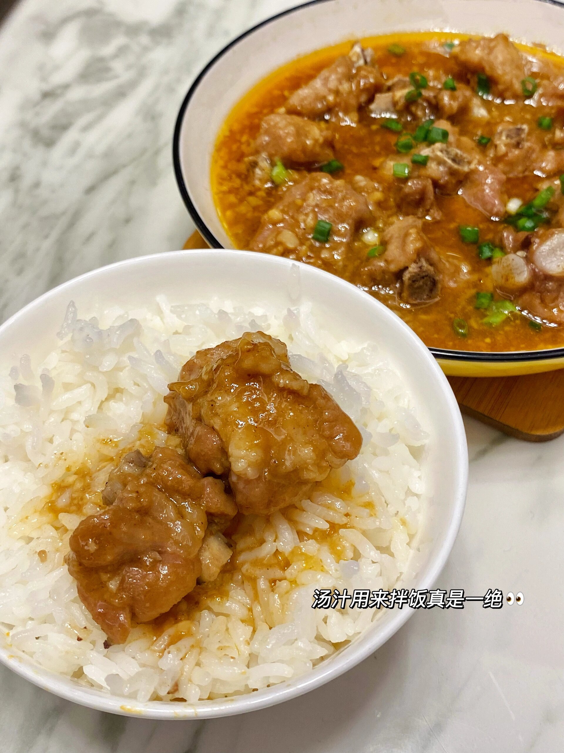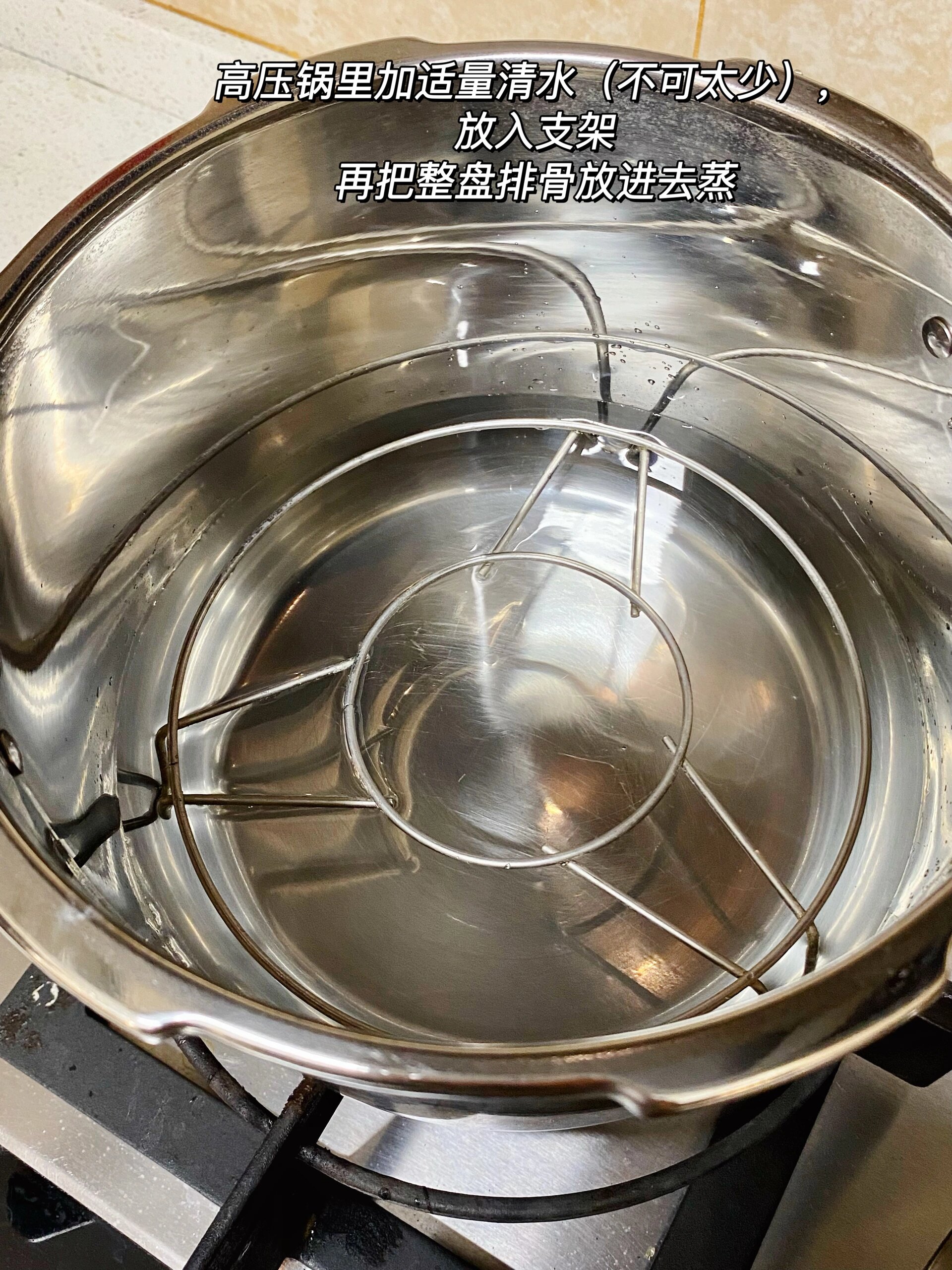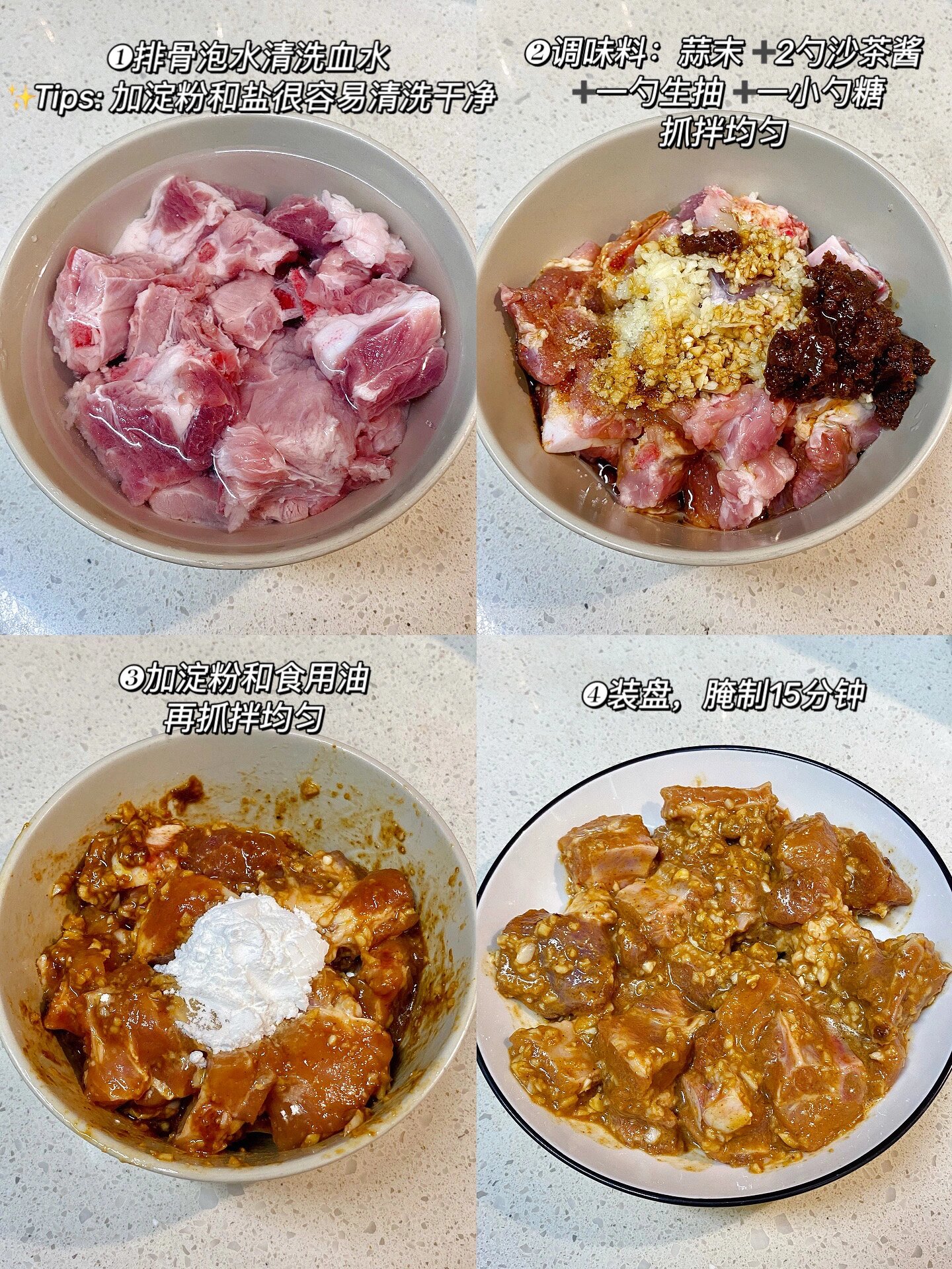 今日食材:新鲜排骨➕沙茶酱➕蒜末➕调味料 做法:1、排骨清洗血水,加淀粉和盐冲洗更容易清洗干净 2、淘洗干净的排骨加入蒜末,2勺沙茶酱,1勺酱油,一小勺糖,抓拌均匀 3、加入适量淀粉和食用油,可以锁住肉汁水分,抓拌均匀,装盘腌制10-15分钟 4、高压锅里加适量多的清水,放上支架,将整盘排骨放入,盖上盖子 5、大火煮开上汽后转小火再蒸10-15分钟即可 用高压锅做菜真的又快又方便,太适合打工人啦!前提要注意正确使用高压锅,注意安全哈~~ 这道沙茶蒸排骨简单又快手,浓浓的汤汁拌饭吃真是一绝,一下子又多吃了两碗饭