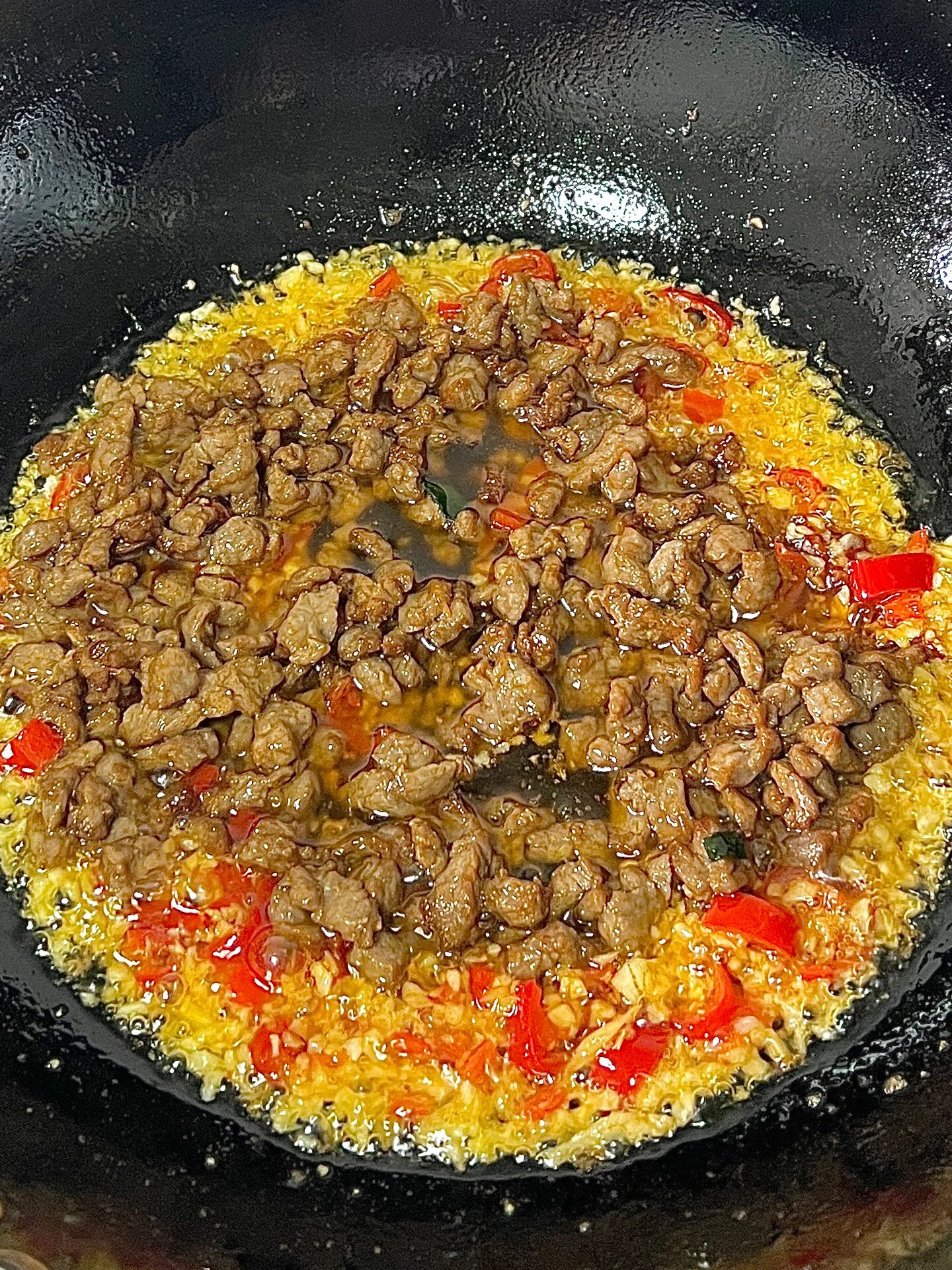3、锅中油温七成热,倒入牛肉快速翻炒至变色,捞出备用