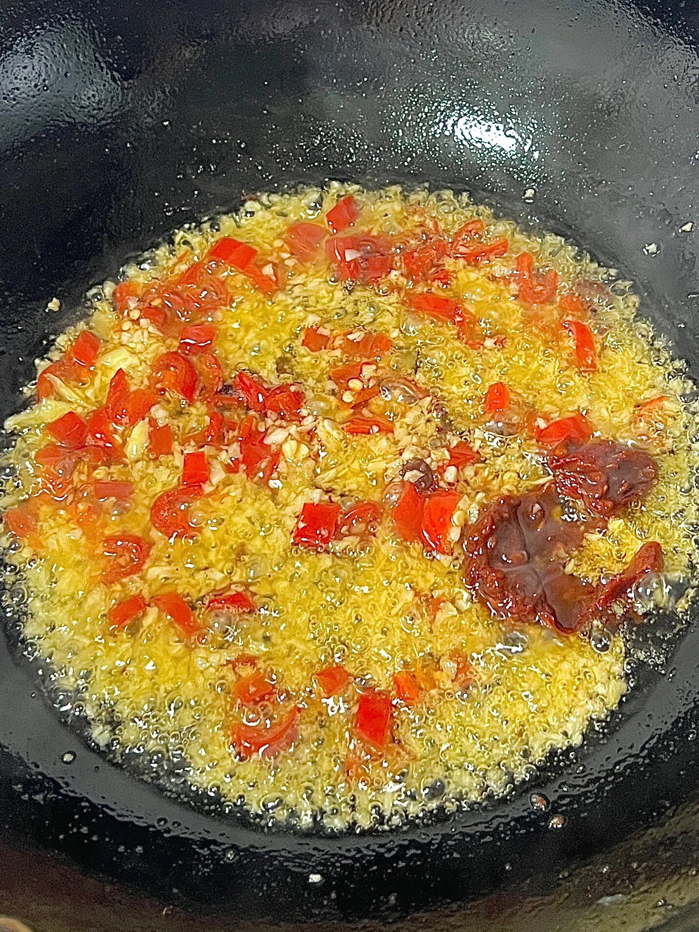 4、倒入姜蒜末和泡椒,快速翻炒,加一点豆瓣酱翻炒