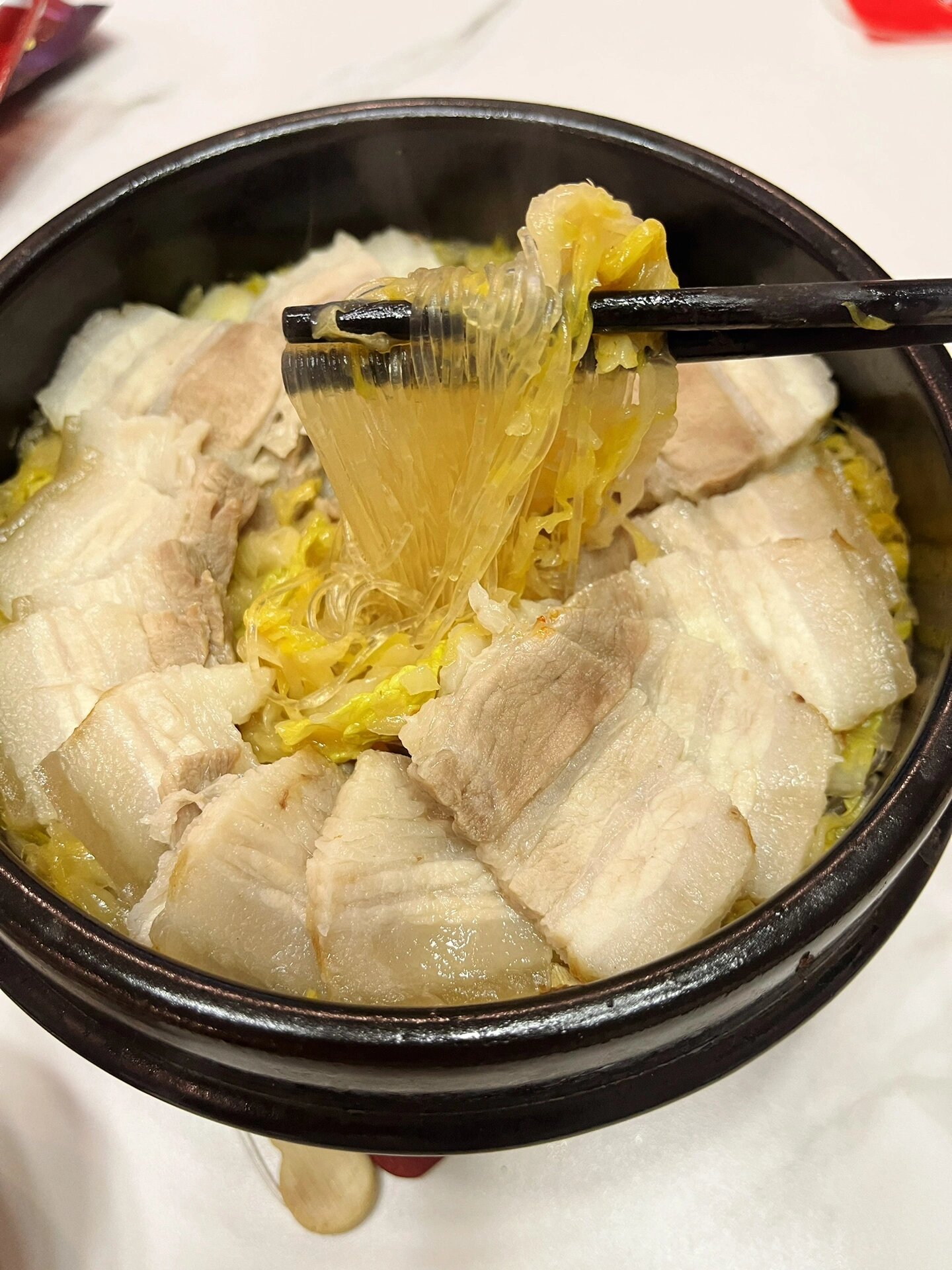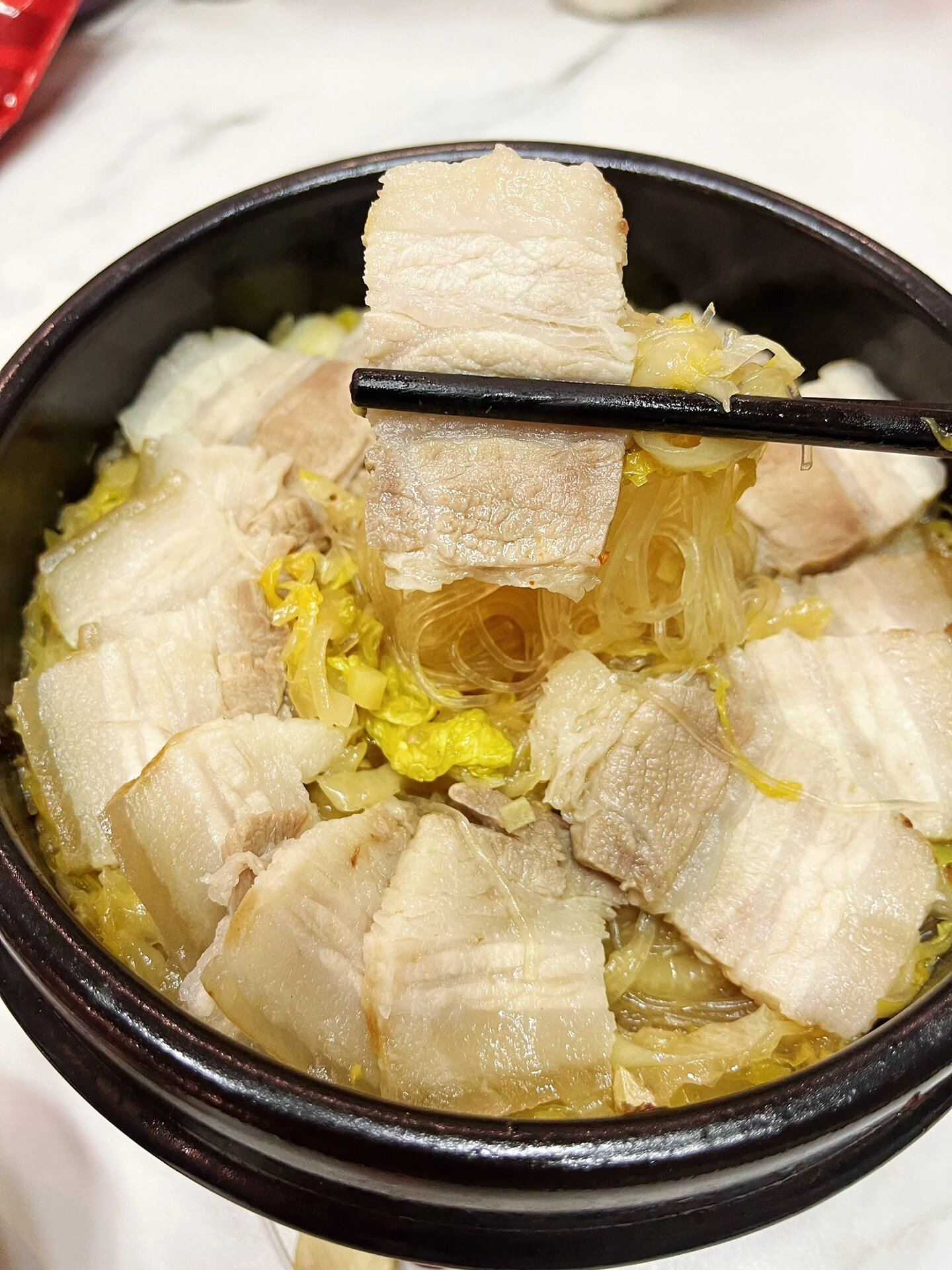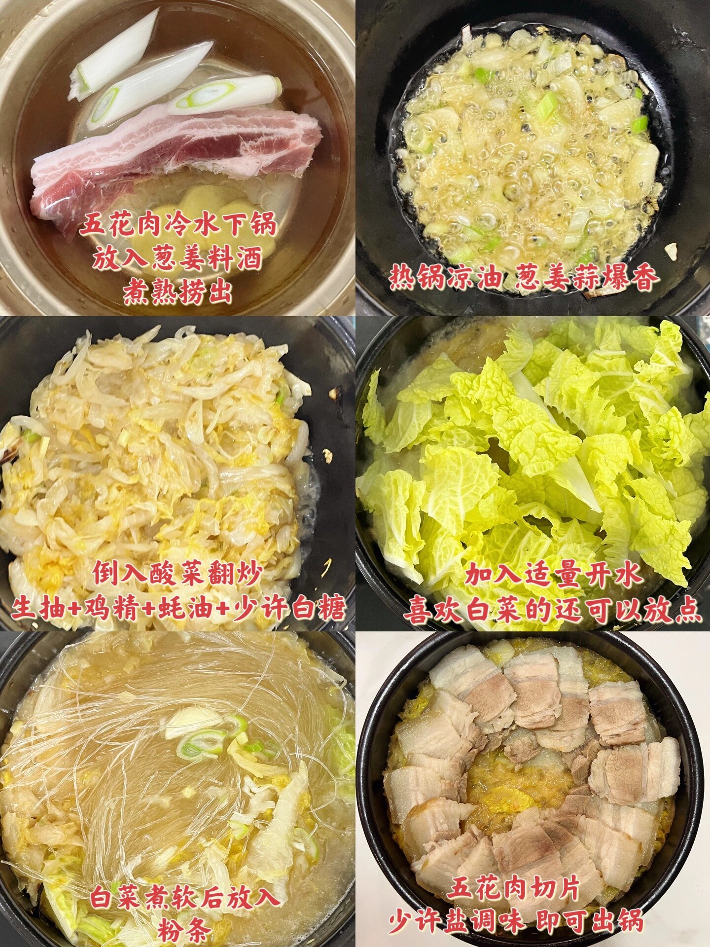 五花肉汆酸菜 这道菜一定要学会 越是天冷越是想吃点热量高又暖呼呼的,这个一定是首选之一 酸菜与五花肉的结合,开胃且不膩,再配上灵魂小料汁,简直无敌 食材:五花肉、酸菜、粉条 做法:1、五花肉冷水下锅,放入葱姜料酒,煮沸后撇去浮沫,继续煮至筷子轻轻插透即可,拿出冷凉切片备用 2、另起油锅,热锅冷油下入葱姜蒜爆香,加入淘过水的酸菜(喜欢酸的可不淘),翻炒几下,加入生抽+鸡精+蚝油+少许白糖 3、放入肉汤煮沸,加入白菜(可不加)、粉条 4、最上面铺上切片五花肉即可出锅 蘸料:蒜末+辣椒油+生抽+鸡精+白糖+少许凉白开+盐+花椒油几滴+香油 五花肉+蘸料+酸菜,简直是无敌的存在